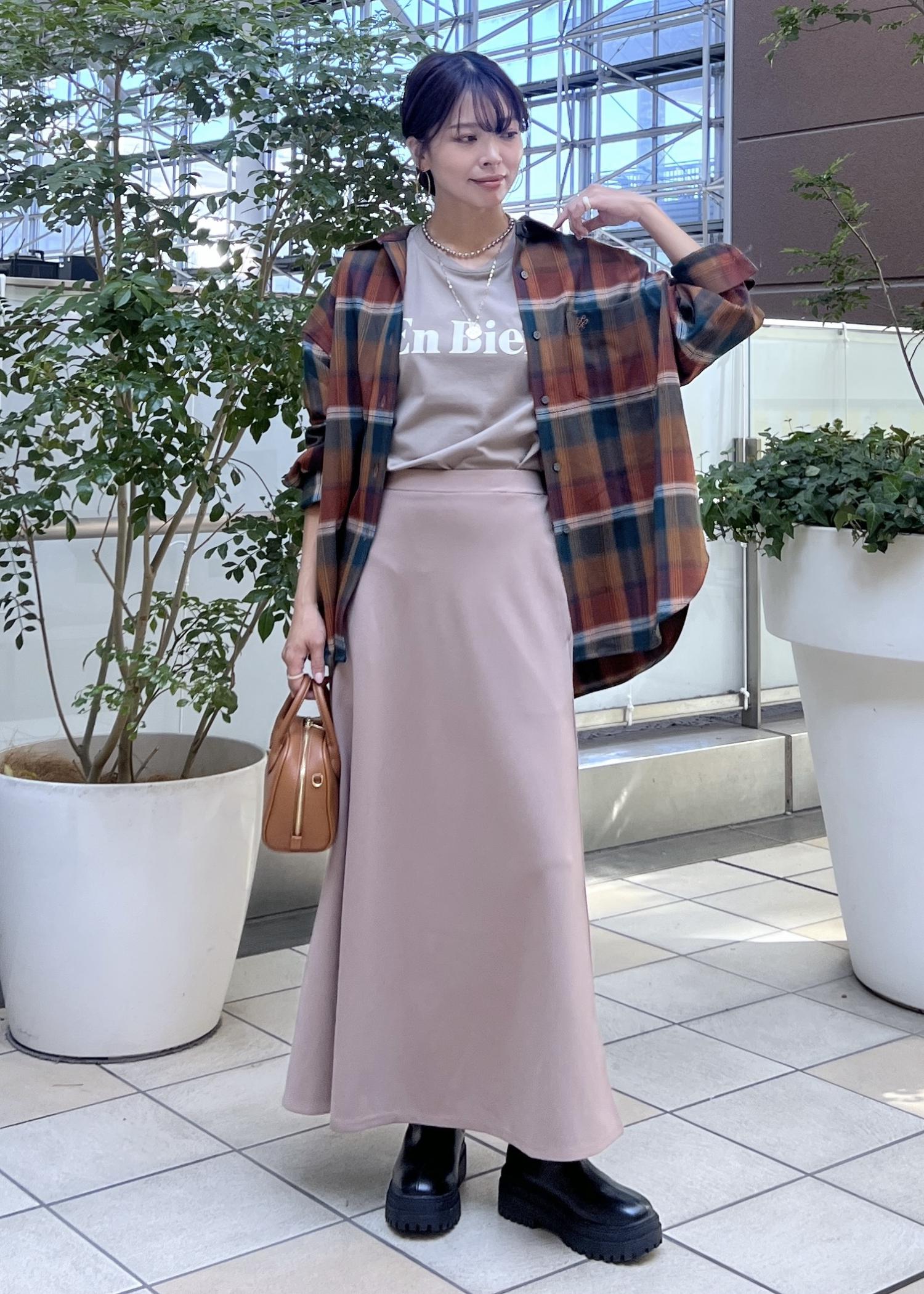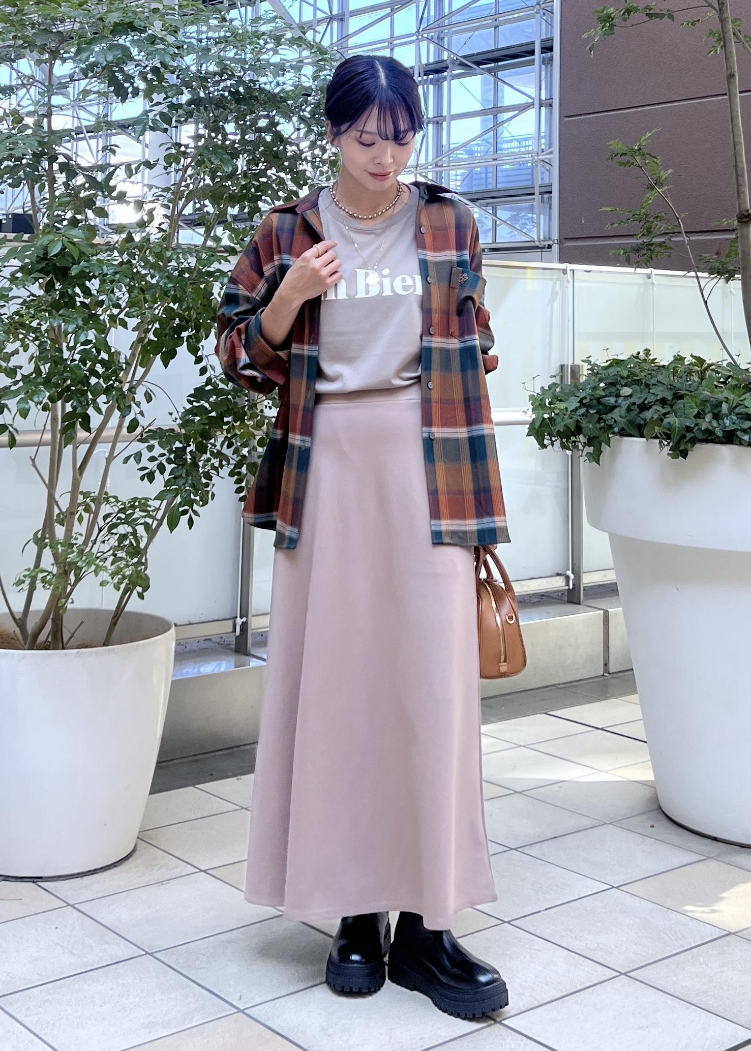Tシャツとポンチ素材のスカートで楽ちんで動きやすいカジュアルコーデにしました。