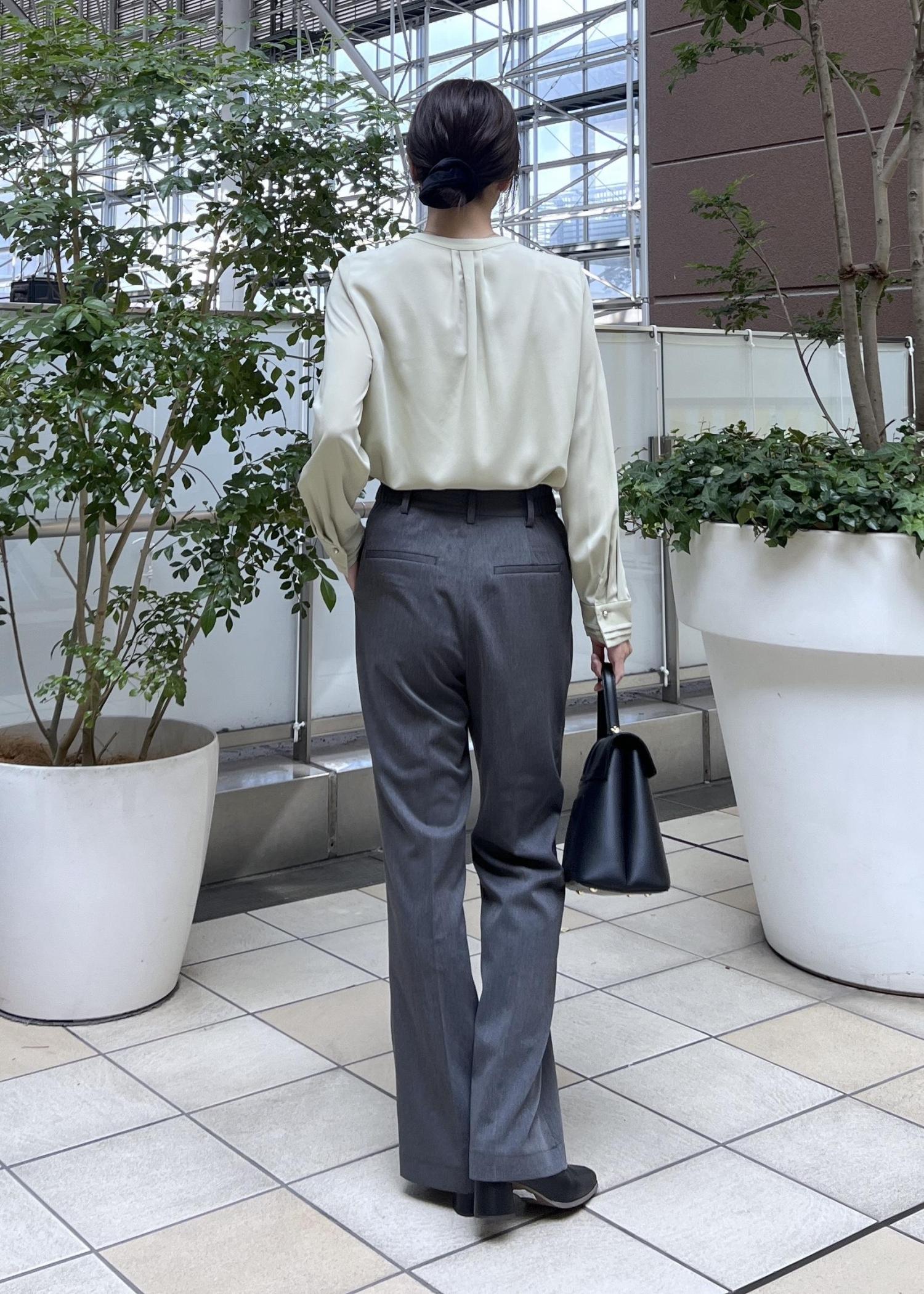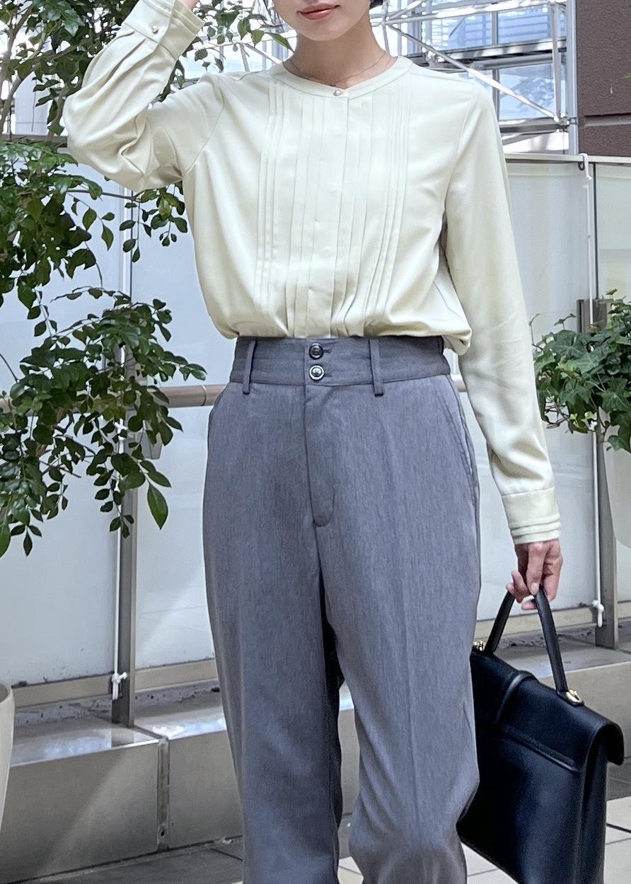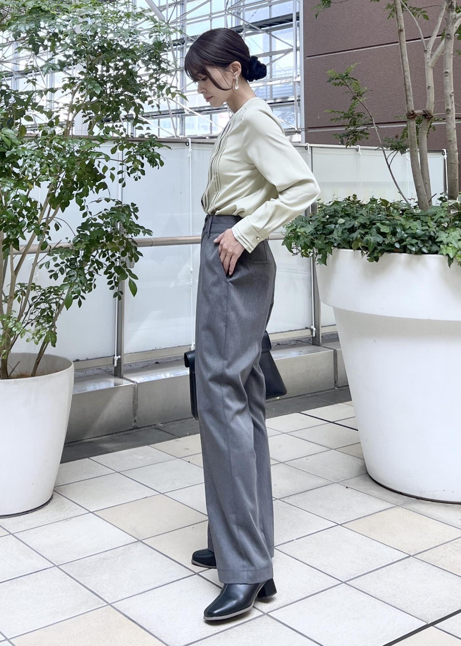 グリーンのブラウスと、グレーのパンツで、スッキリ感のある大人綺麗めコーデにしました。