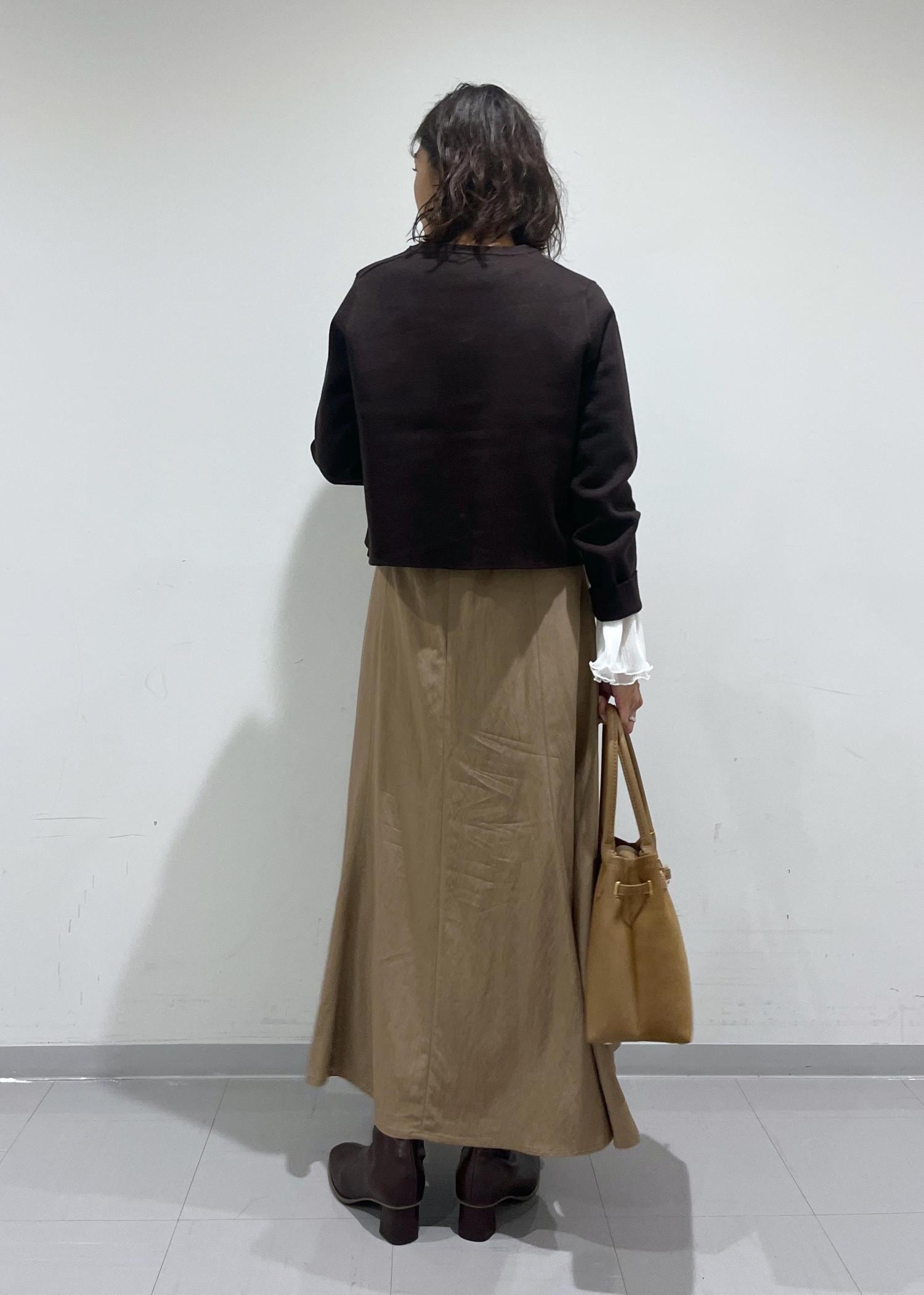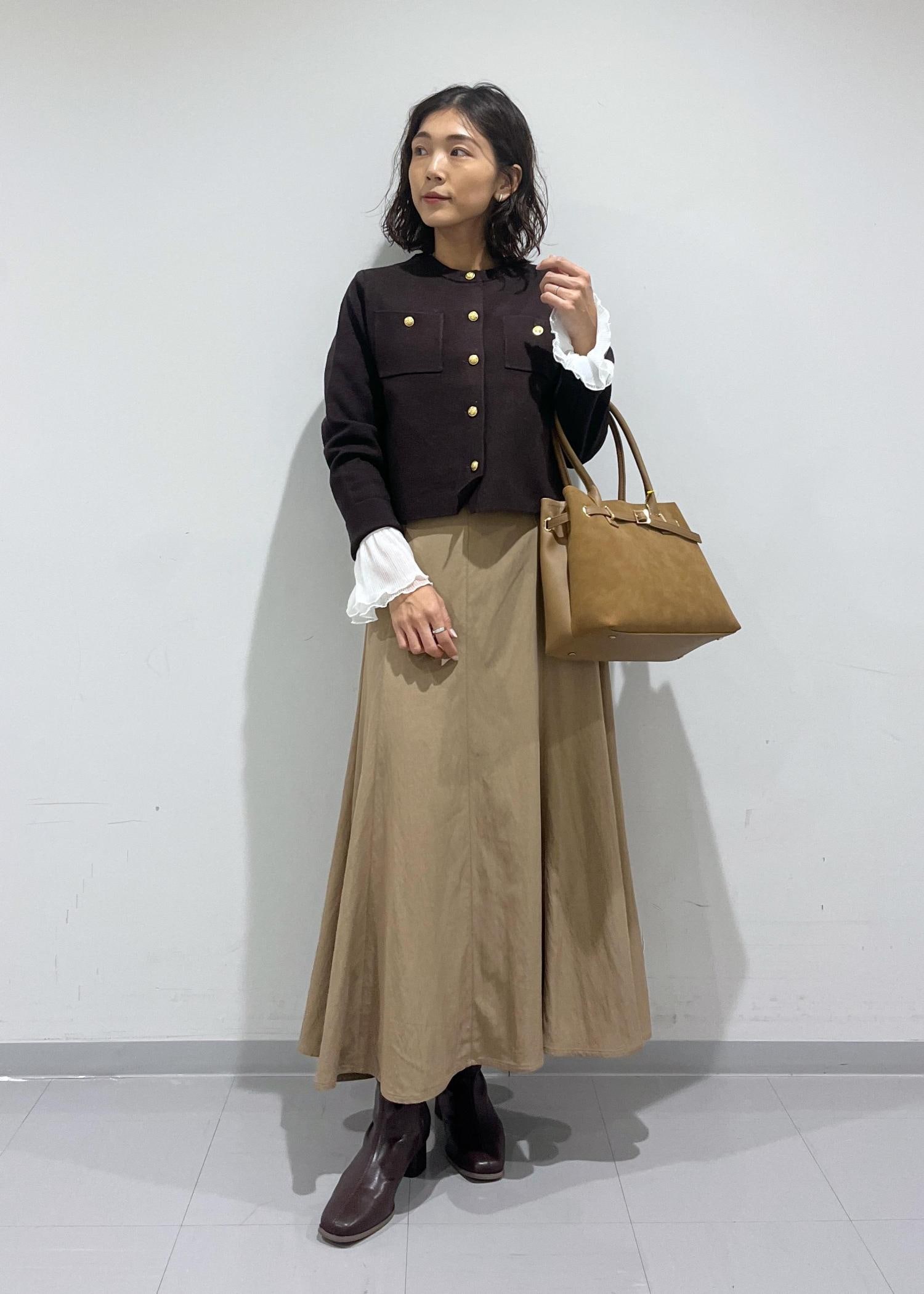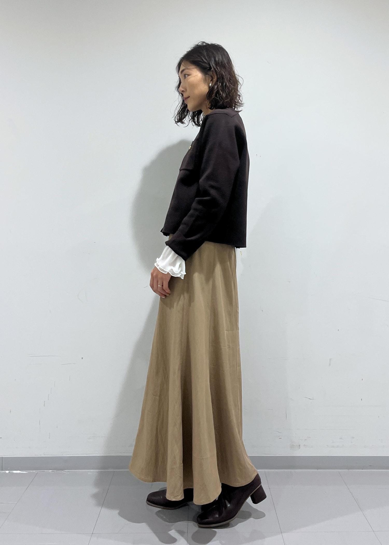 マットな素材なので、秋はトップスに艶のあるブラウスで軽やかに、冬はニットでほっこり感のあるスタイリングと季節ごとに魅せ方を楽しめるスカートです。