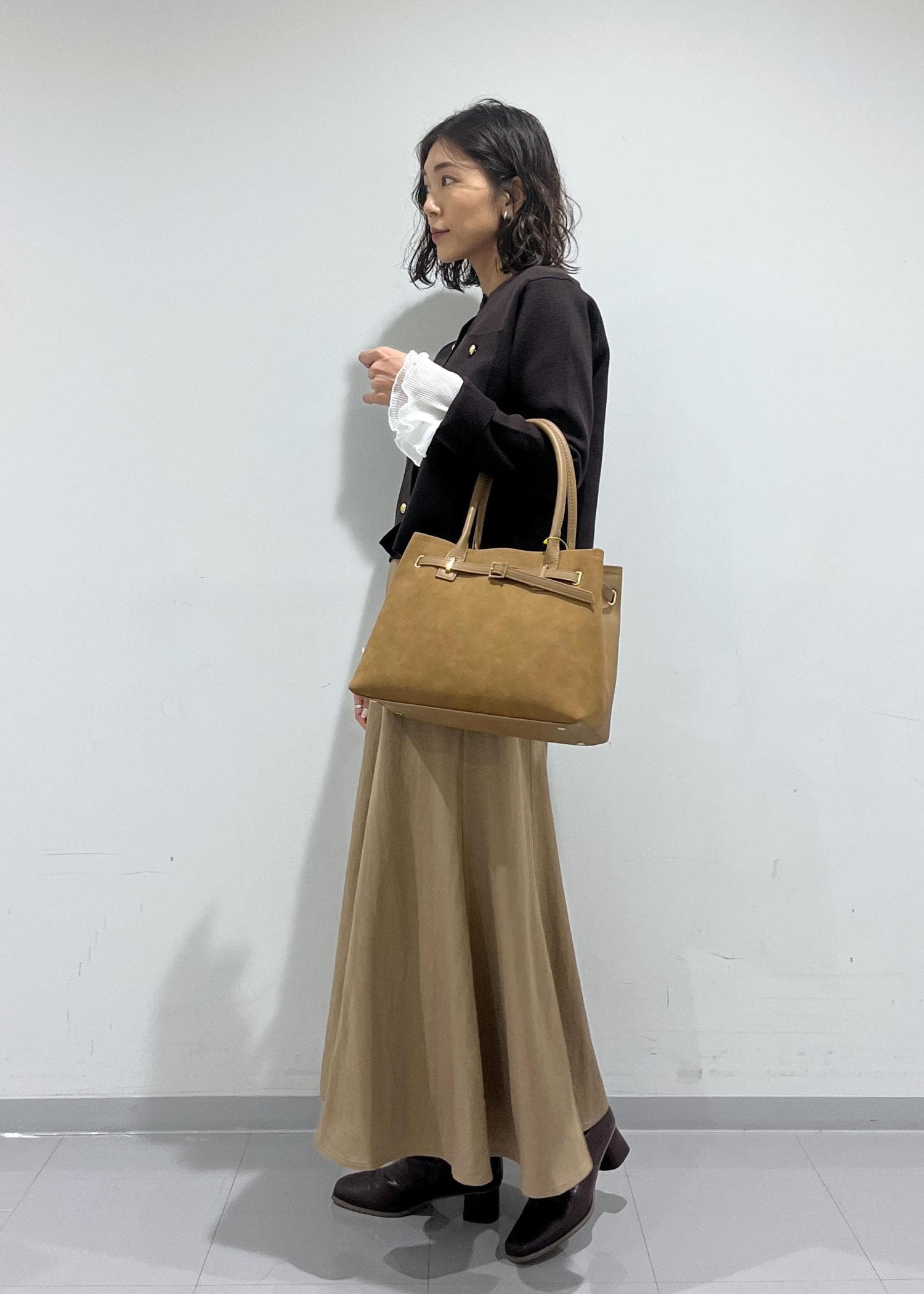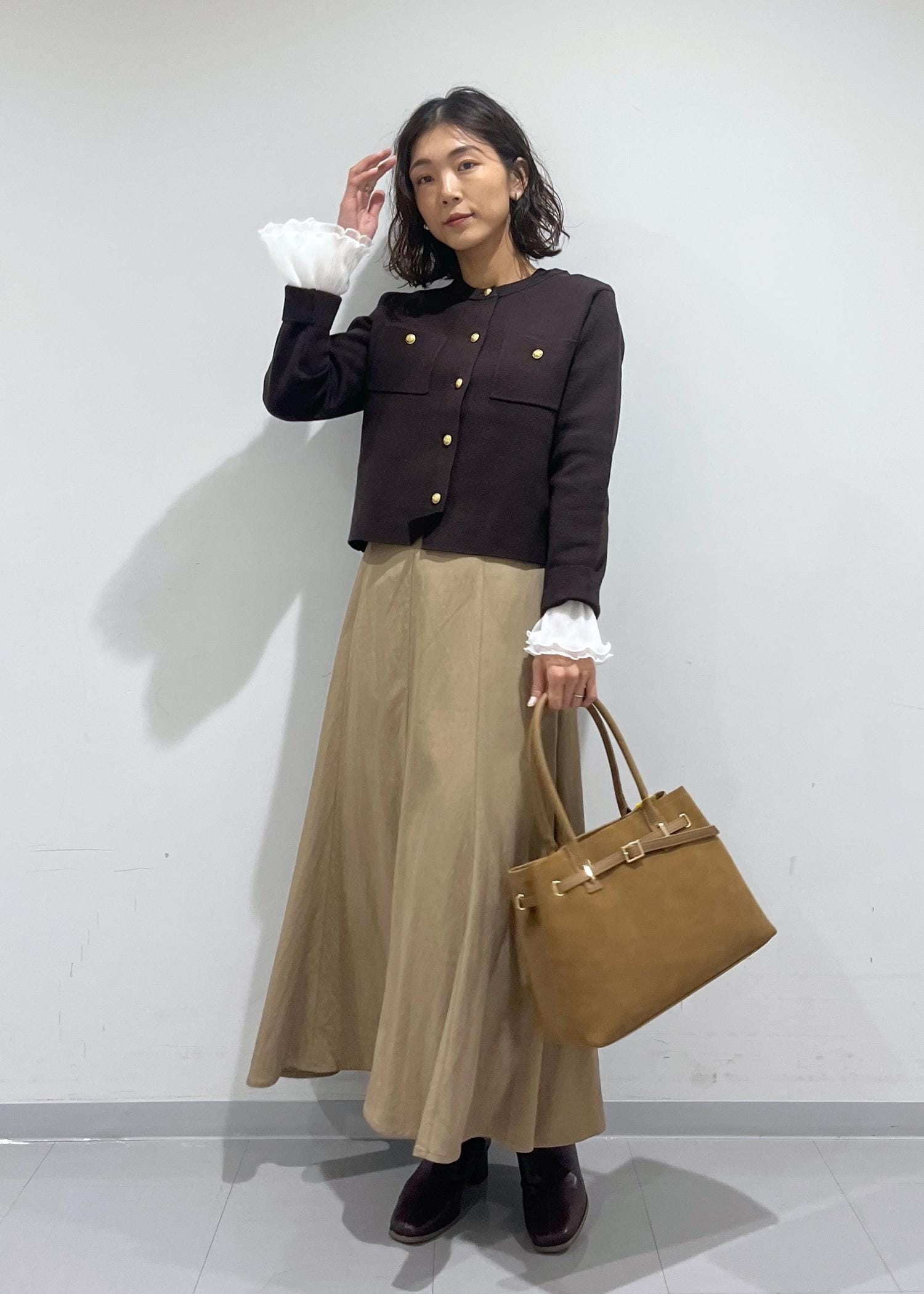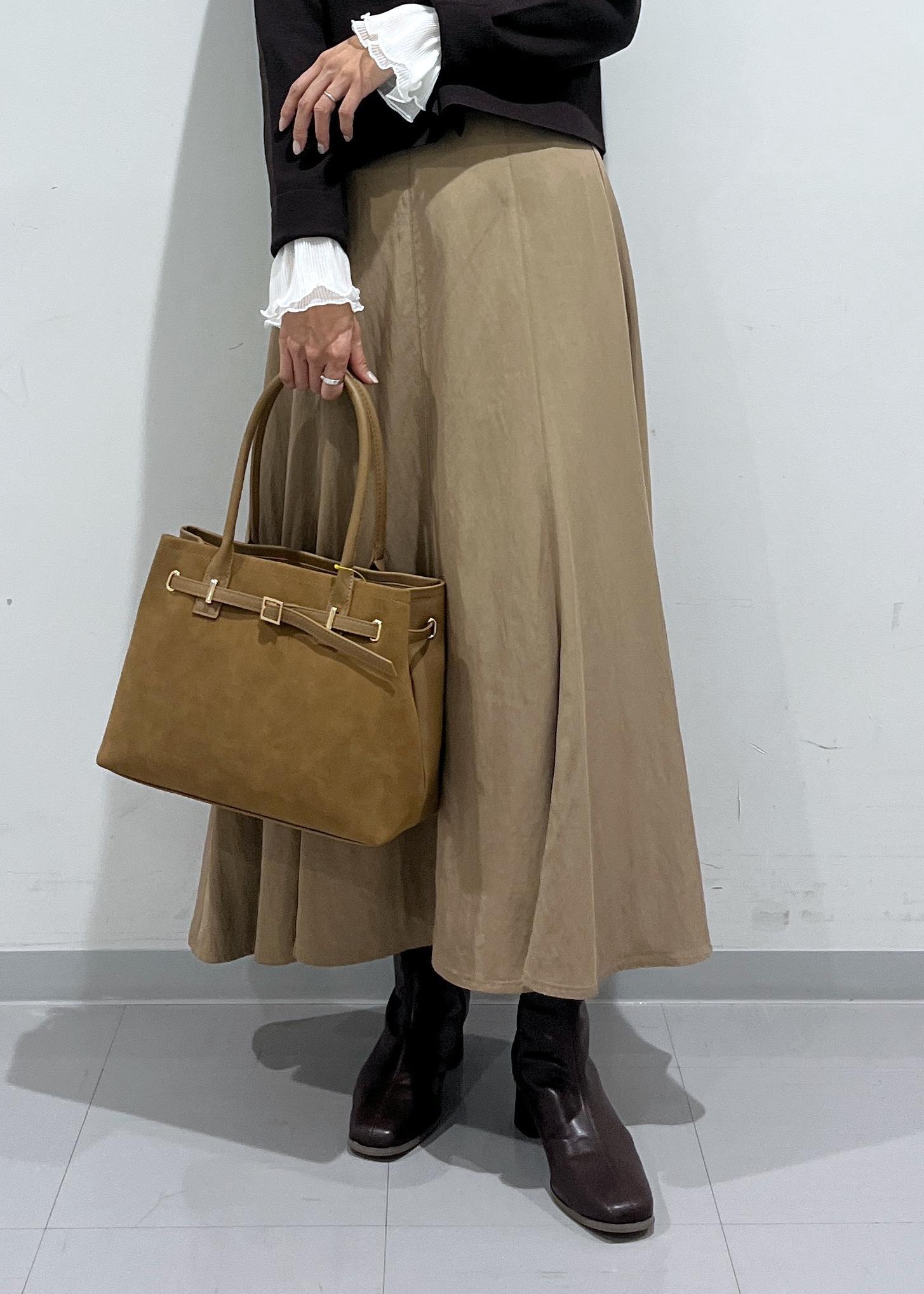 マットな素材なので、秋はトップスに艶のあるブラウスで軽やかに、冬はニットでほっこり感のあるスタイリングと季節ごとに魅せ方を楽しめるスカートです。