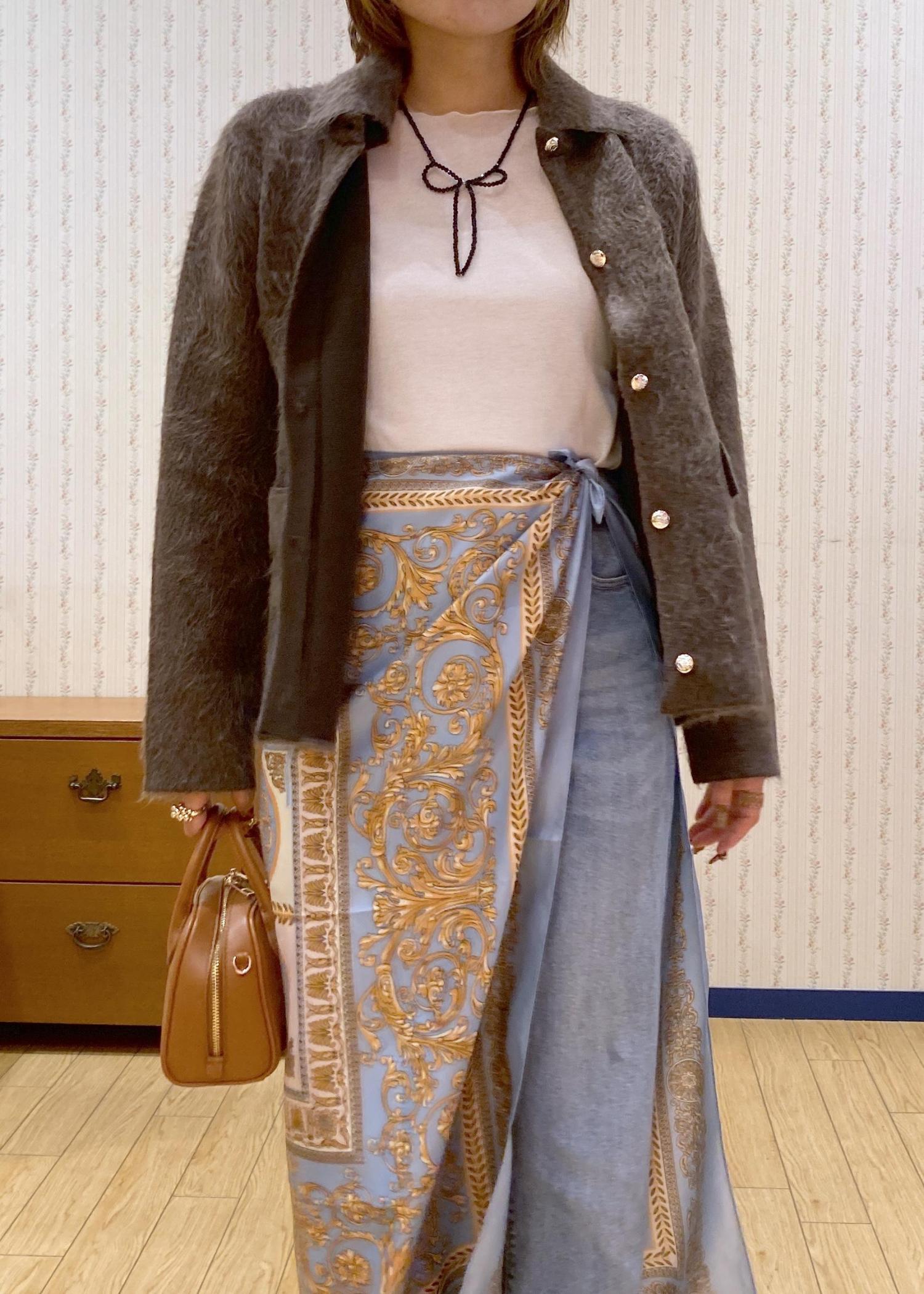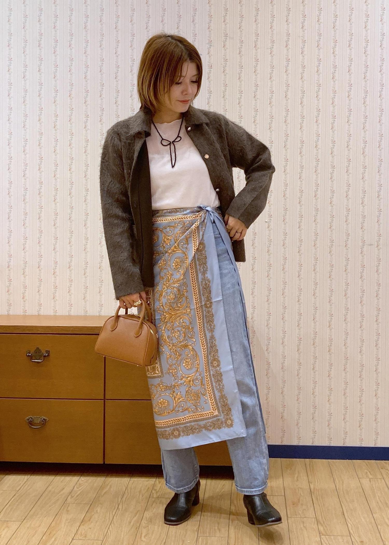 ブラウンのアウターカーディガンにデニムを合わせたシンプルカジュアルなコーディネートに大判スカーフを巻きスカートふうにアレンジした大人っぽいレイヤードコーディネートです!