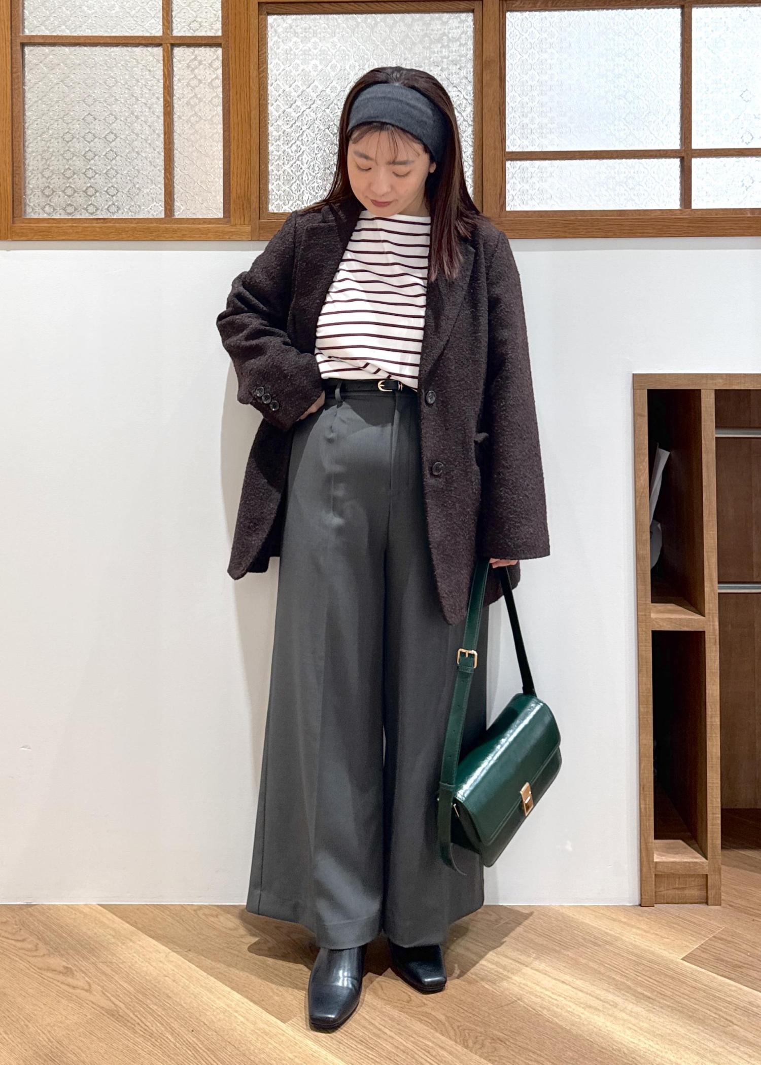 身長154cmでお尻下の着丈、袖丈は手の指付け根くらいの少し長めで旬な着こなしにもぴったりです。