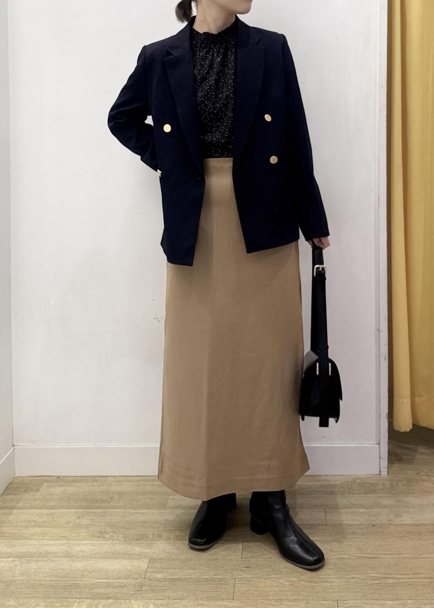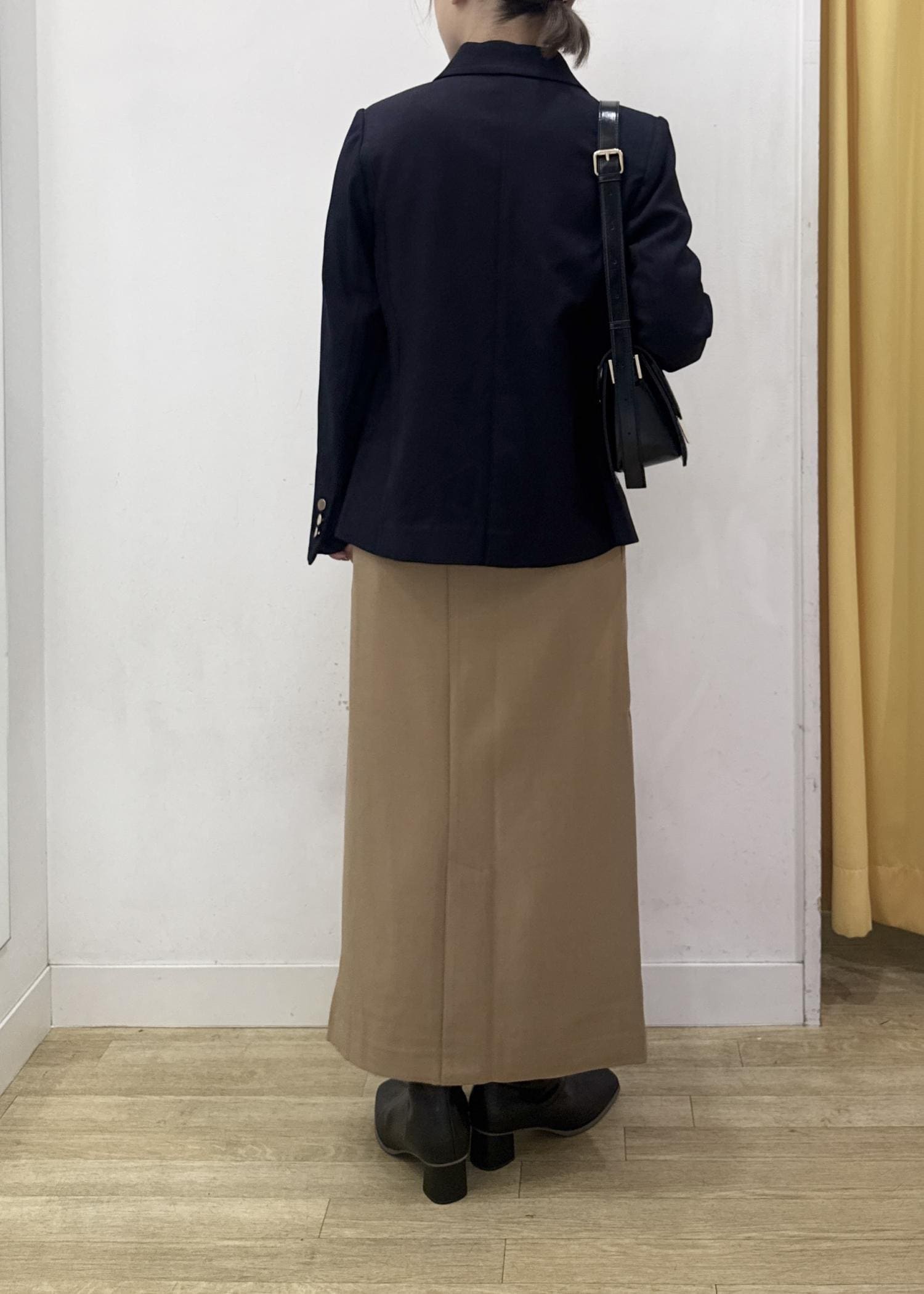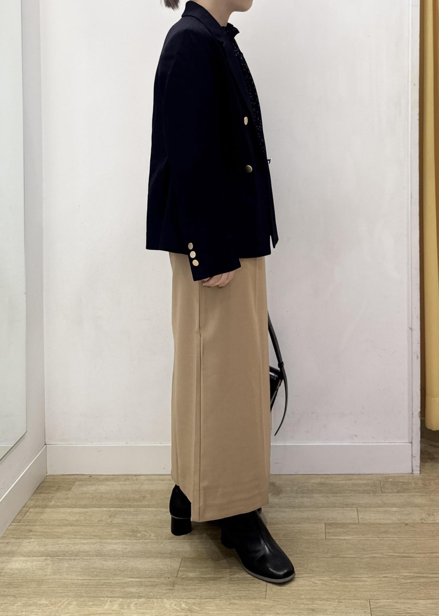 着丈はヒップにかかるぐらいの長さで、スカート、パンツどちらにも合わせやすい着丈です。 -