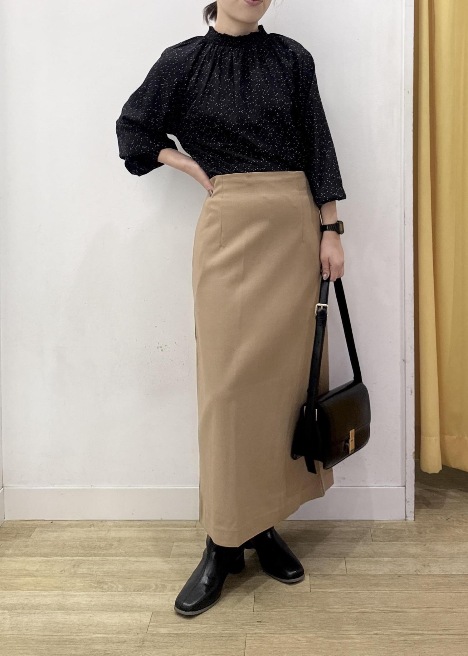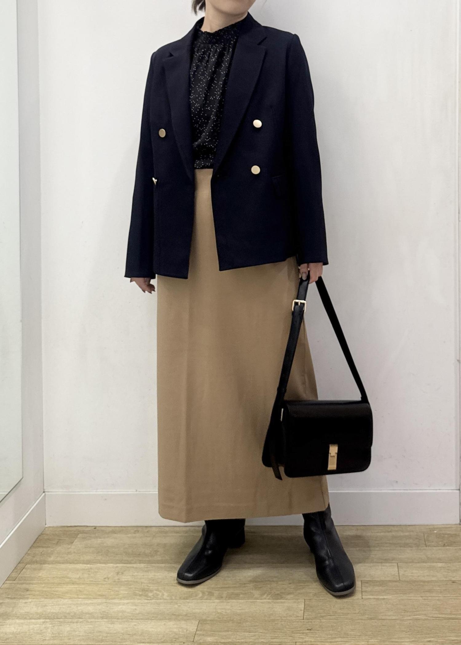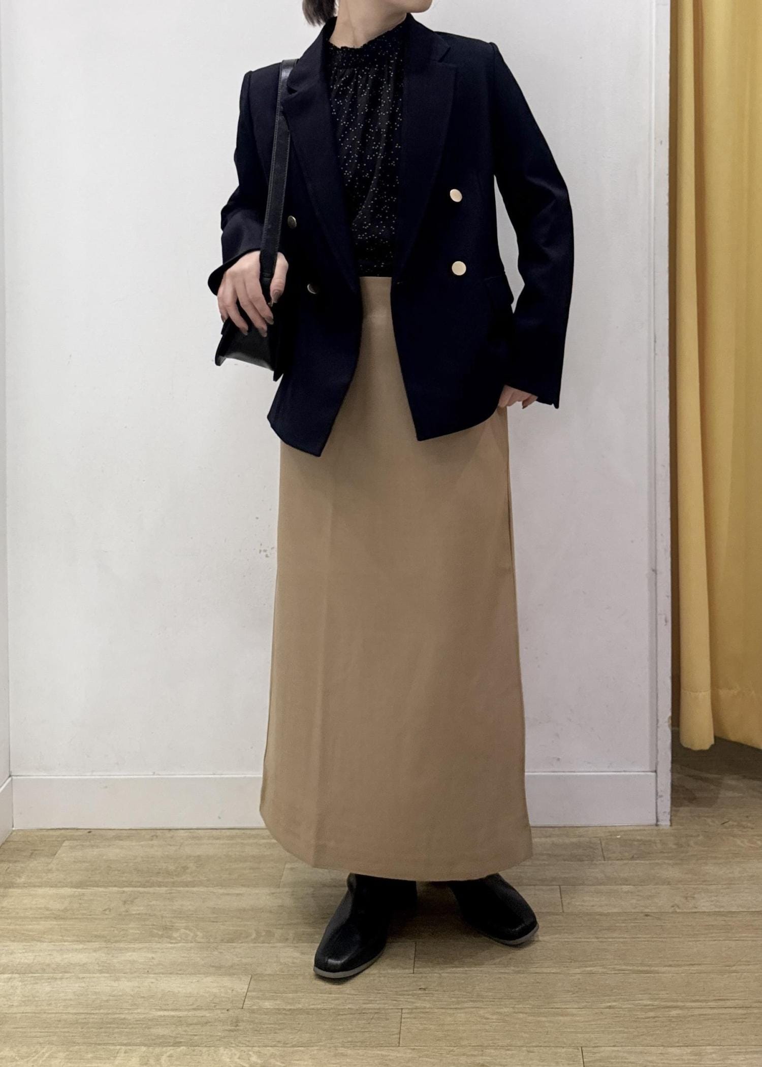 着丈はヒップにかかるぐらいの長さで、スカート、パンツどちらにも合わせやすい着丈です。 -