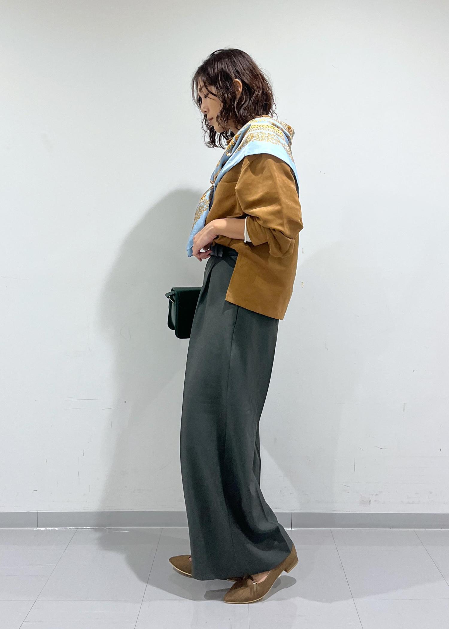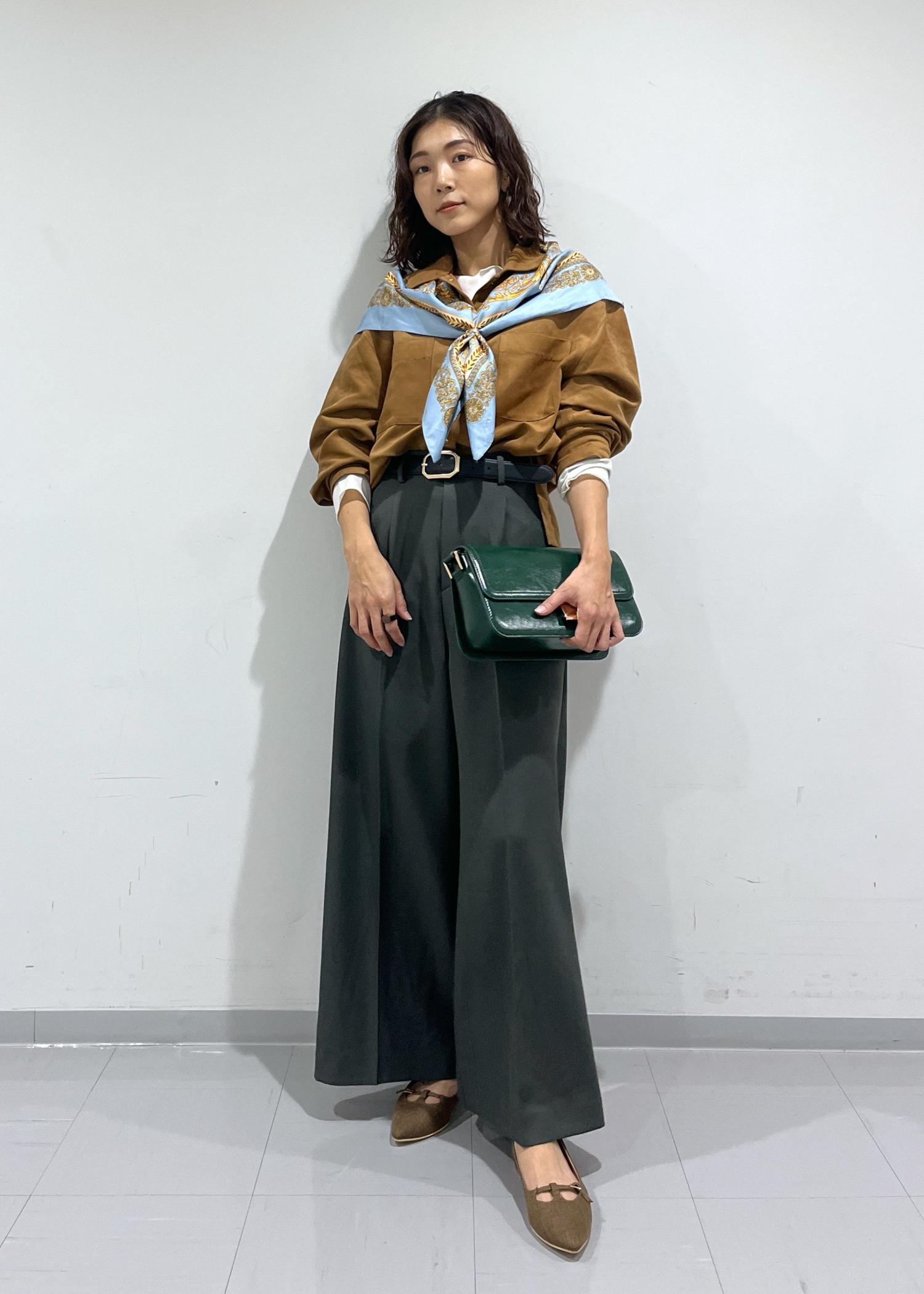 ハンサム見えするスタイリングですが、フレアシルエットのパンツとスカーフが女性らしさをプラスしてくれます。
