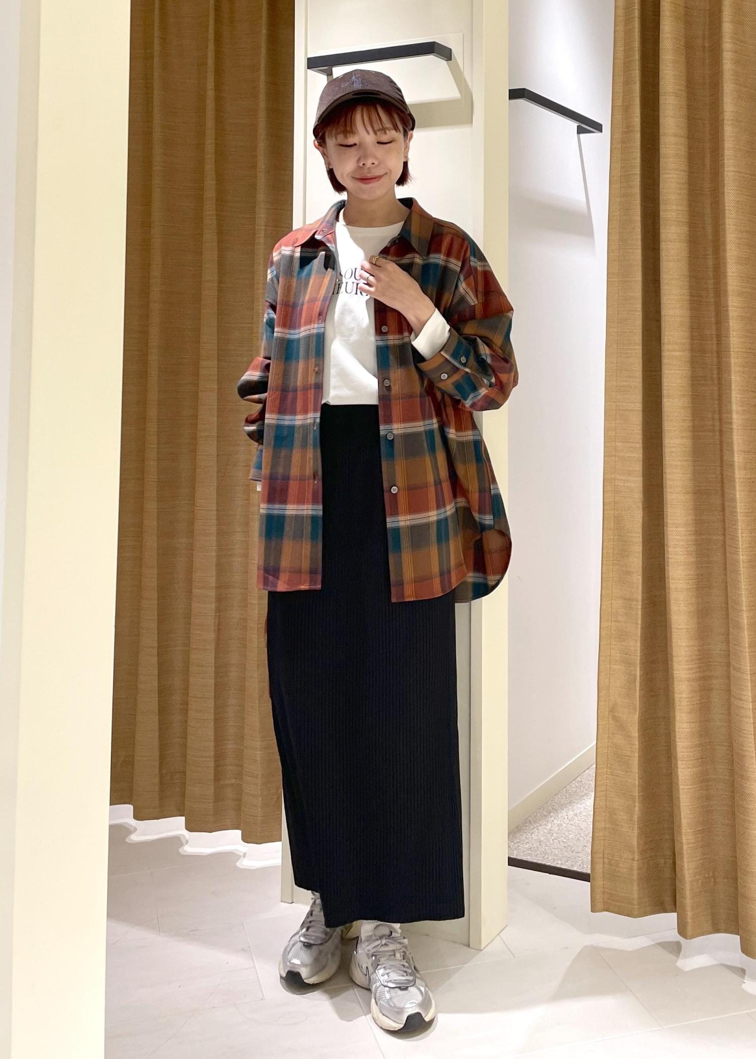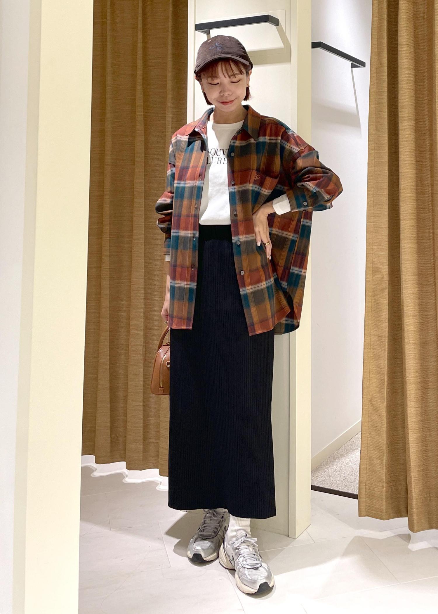 オーバーサイズなので、ボトムにはリブスカートを合わせてすっきりとバランス良く見えるコーディネートにまとめてみました。