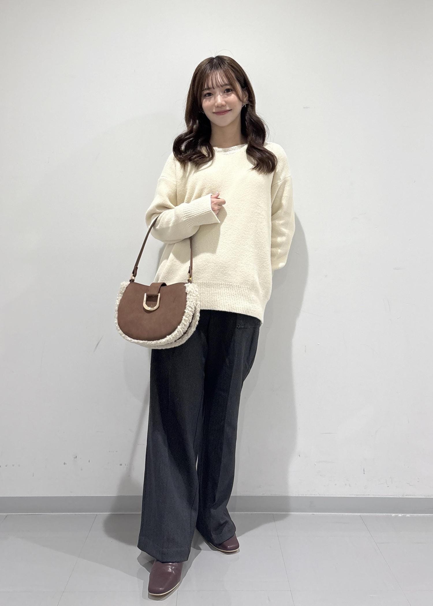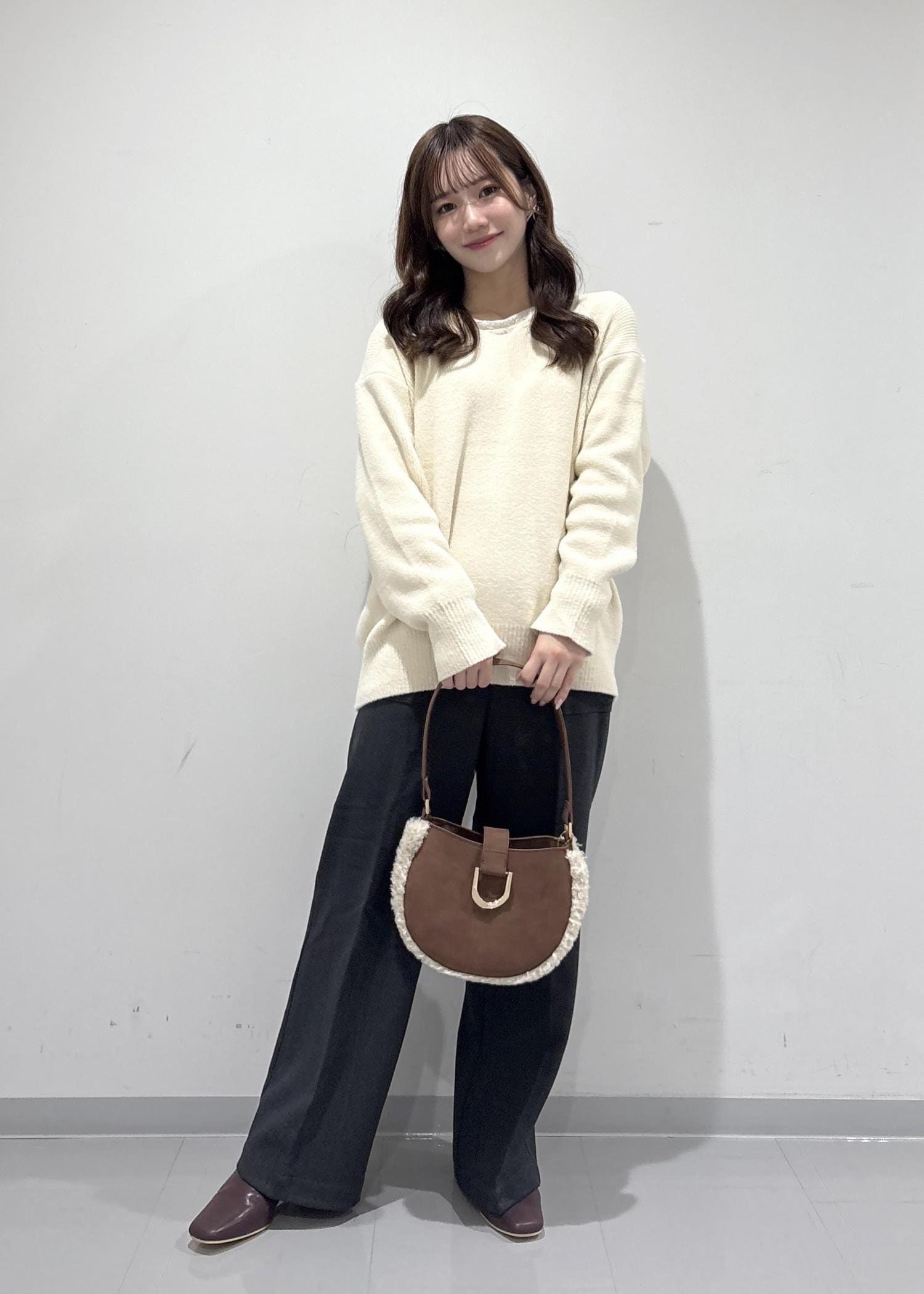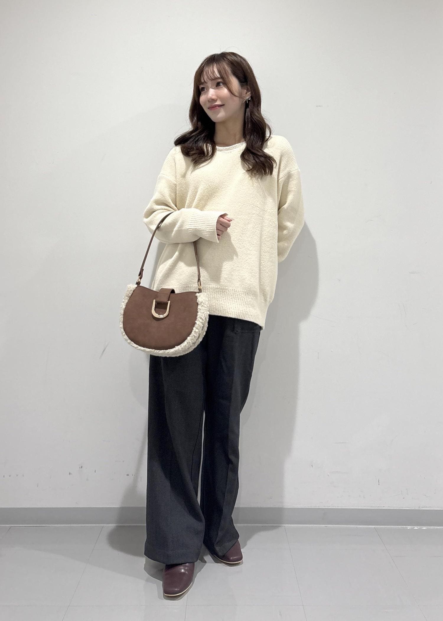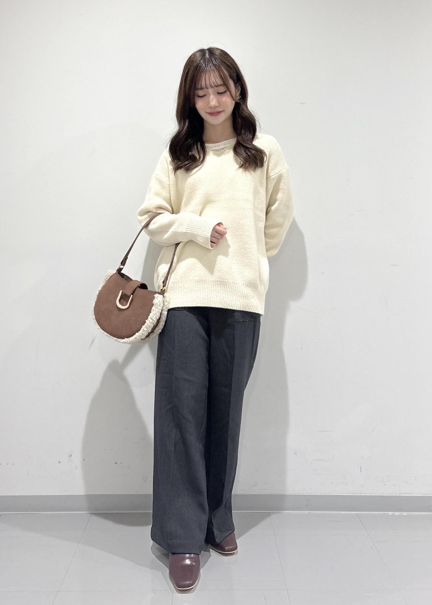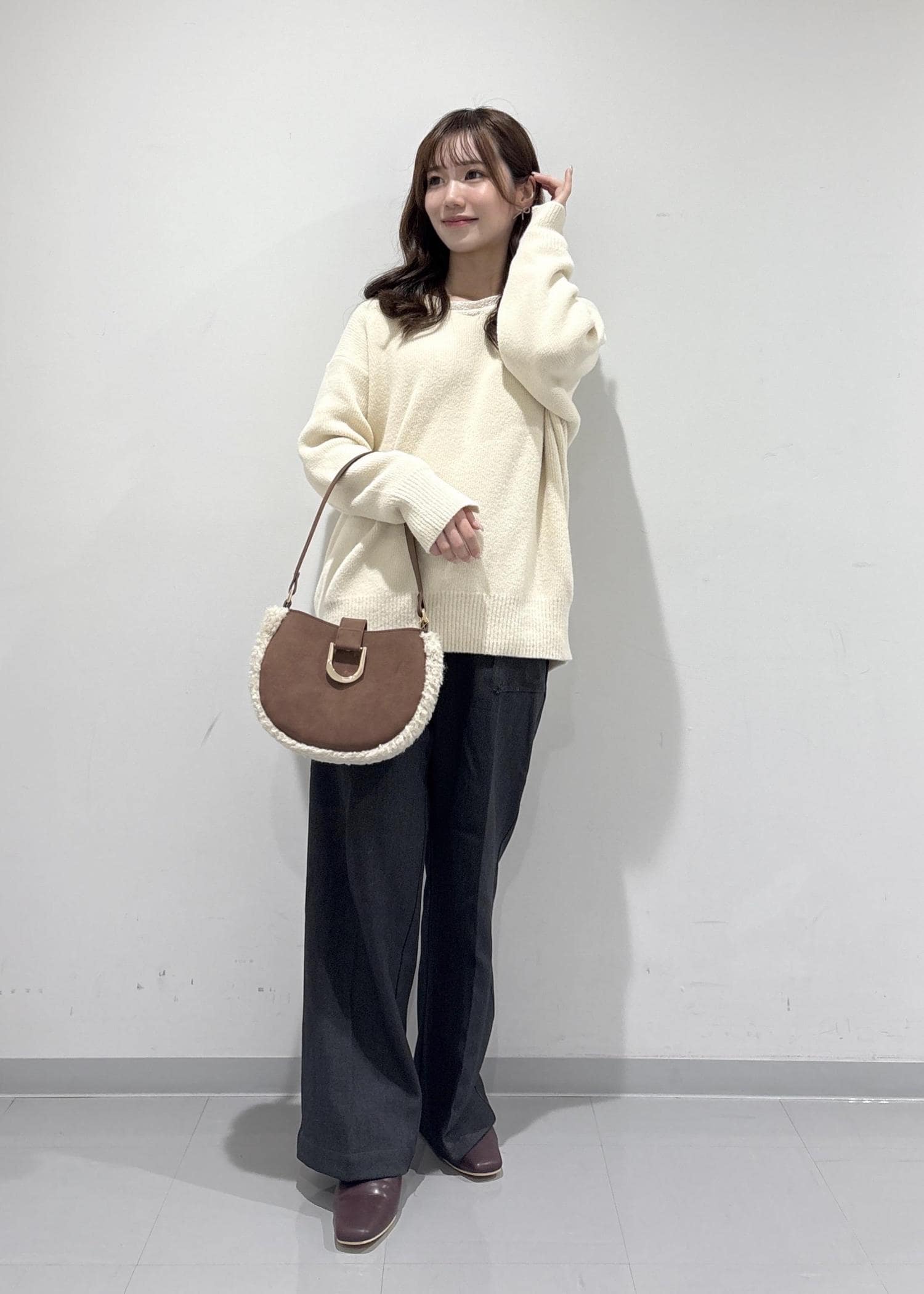 こちらのコーデのポイントは、Vネックのニットです!もこっと感とゆったり感が女性らしく可愛く着れます!チャコールのパンツと合わせてカジュアル感を出してみました!ボアのバッグで一気に秋っぽい印象になります!
