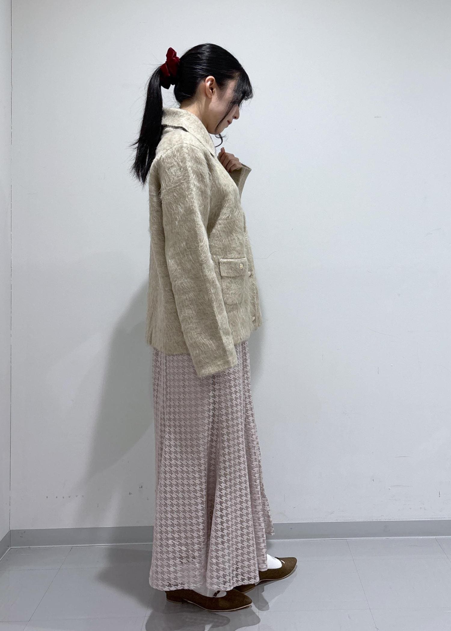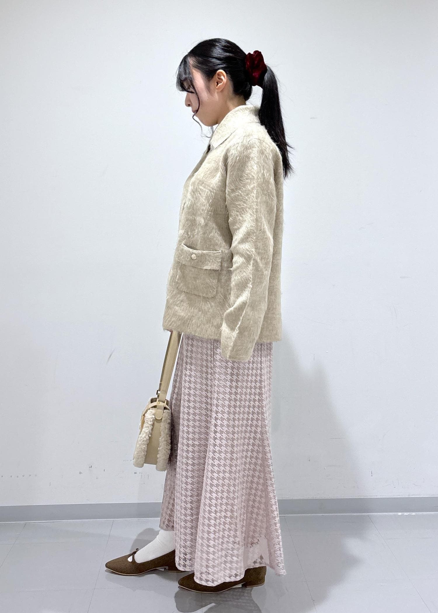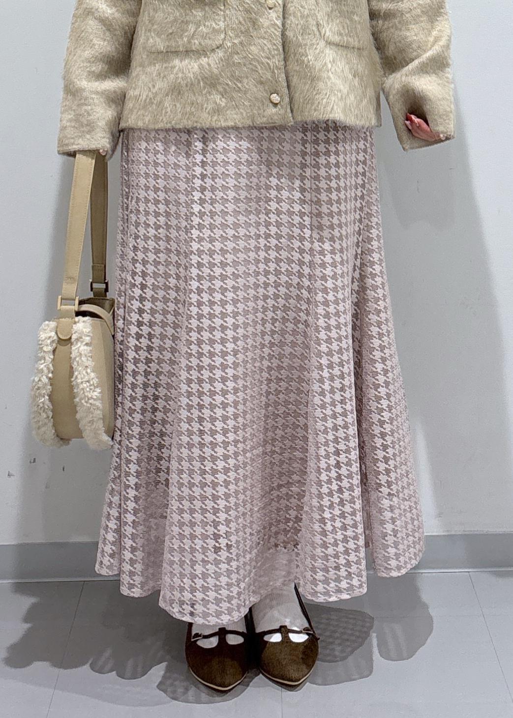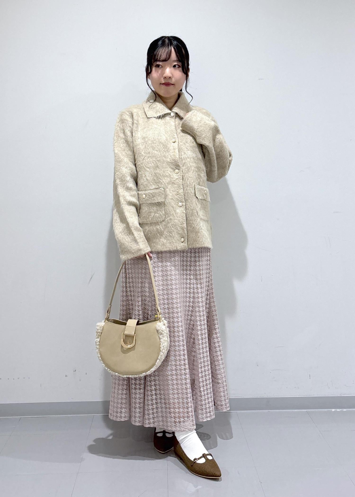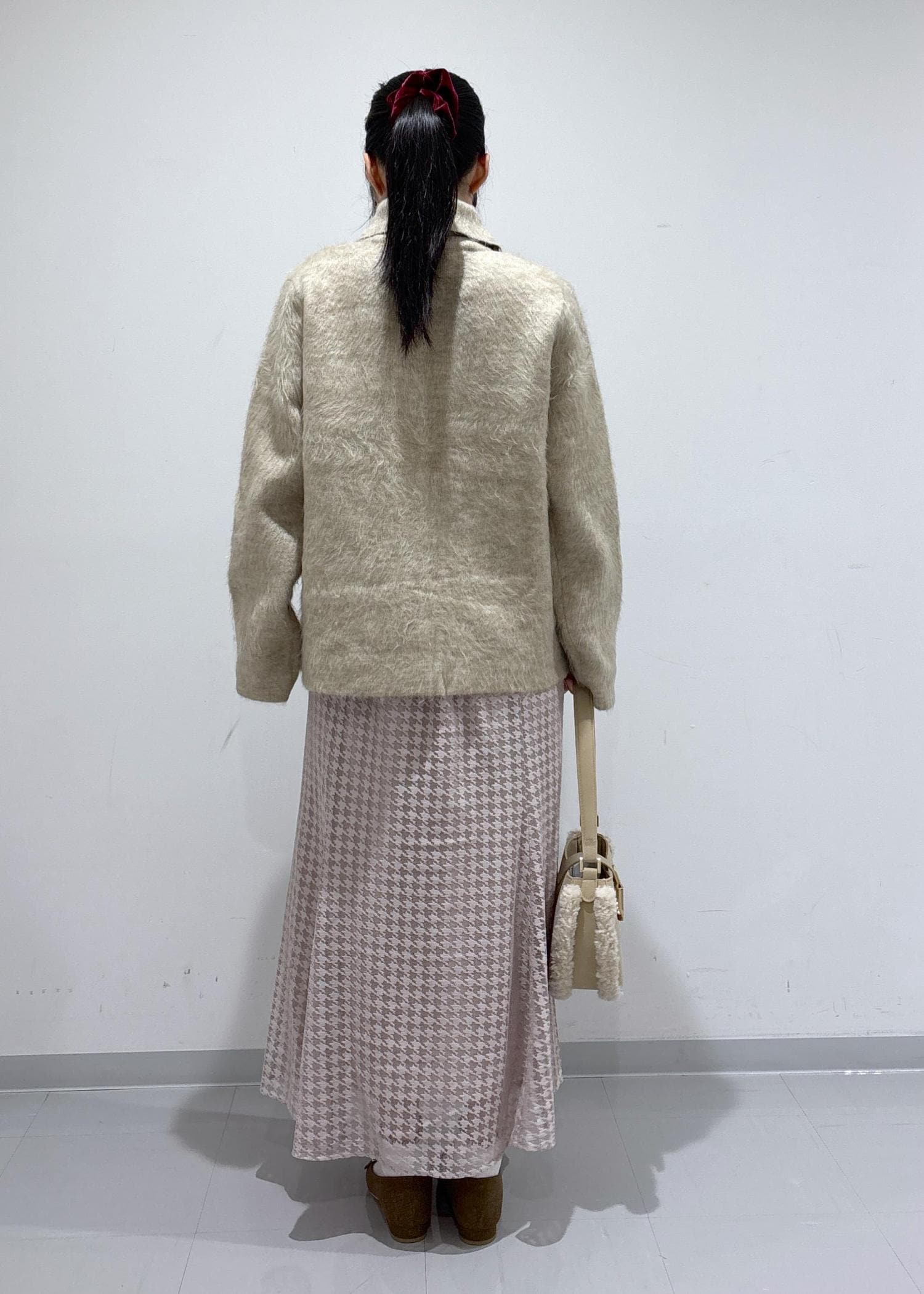 シャギー素材のカーディガンに千鳥柄マーメイドスカートを合わせて、秋らしいコーデにしてみました!