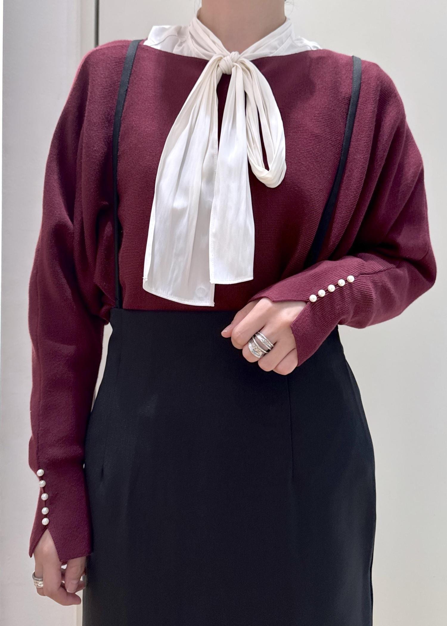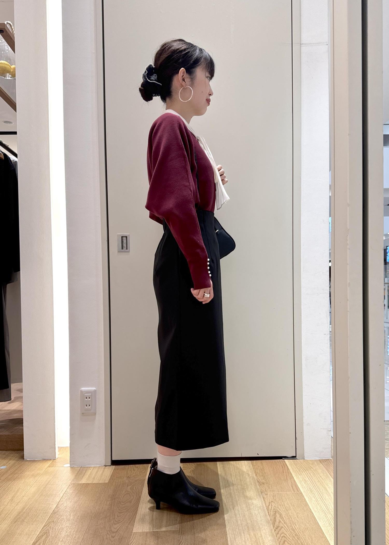 ロペピクニックでも毎シーズン大人気の袖パールドルマンニットを取り入れたきれいめコーデです。