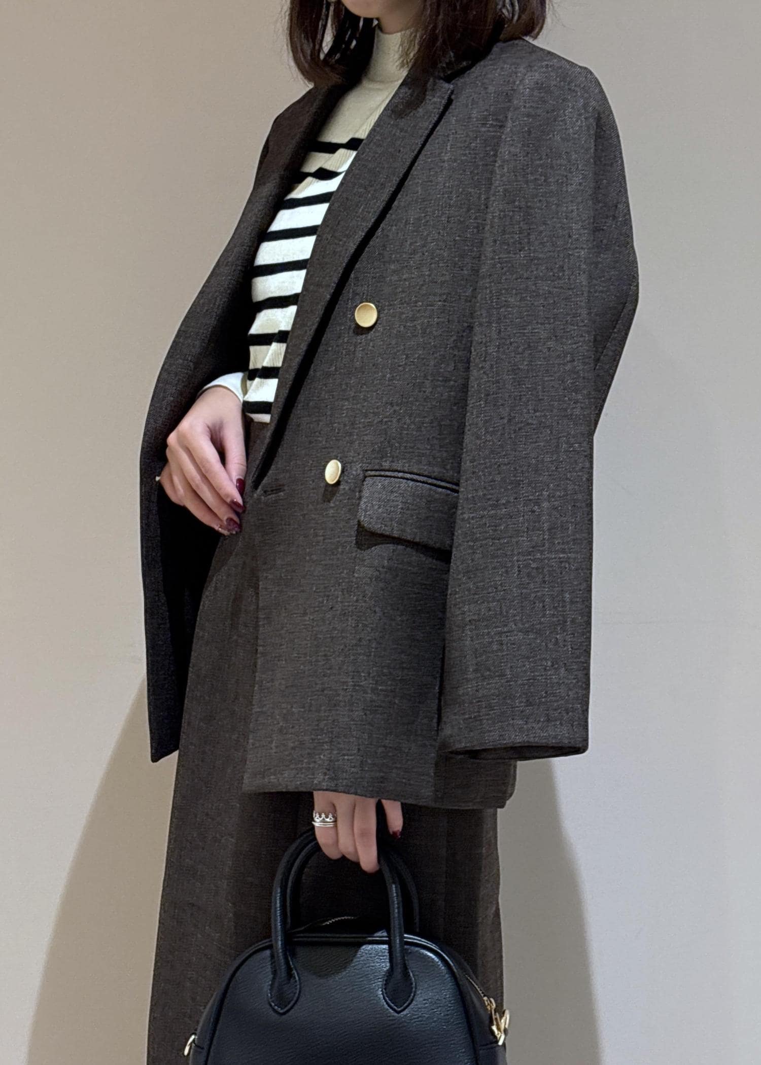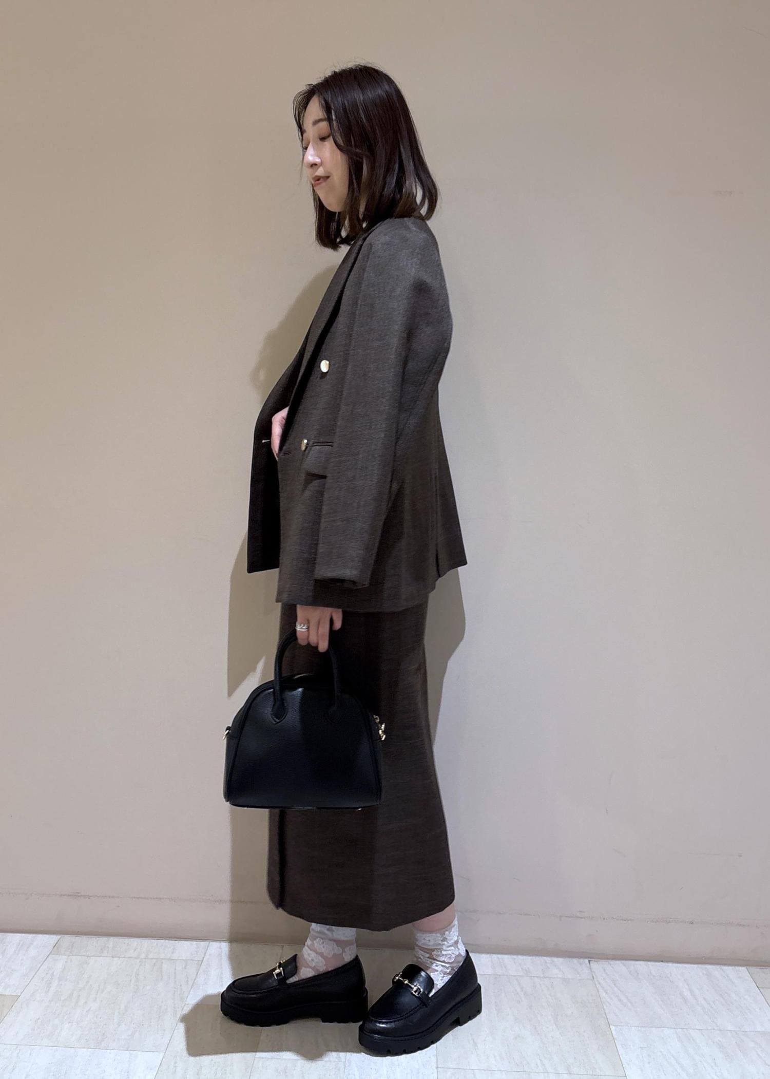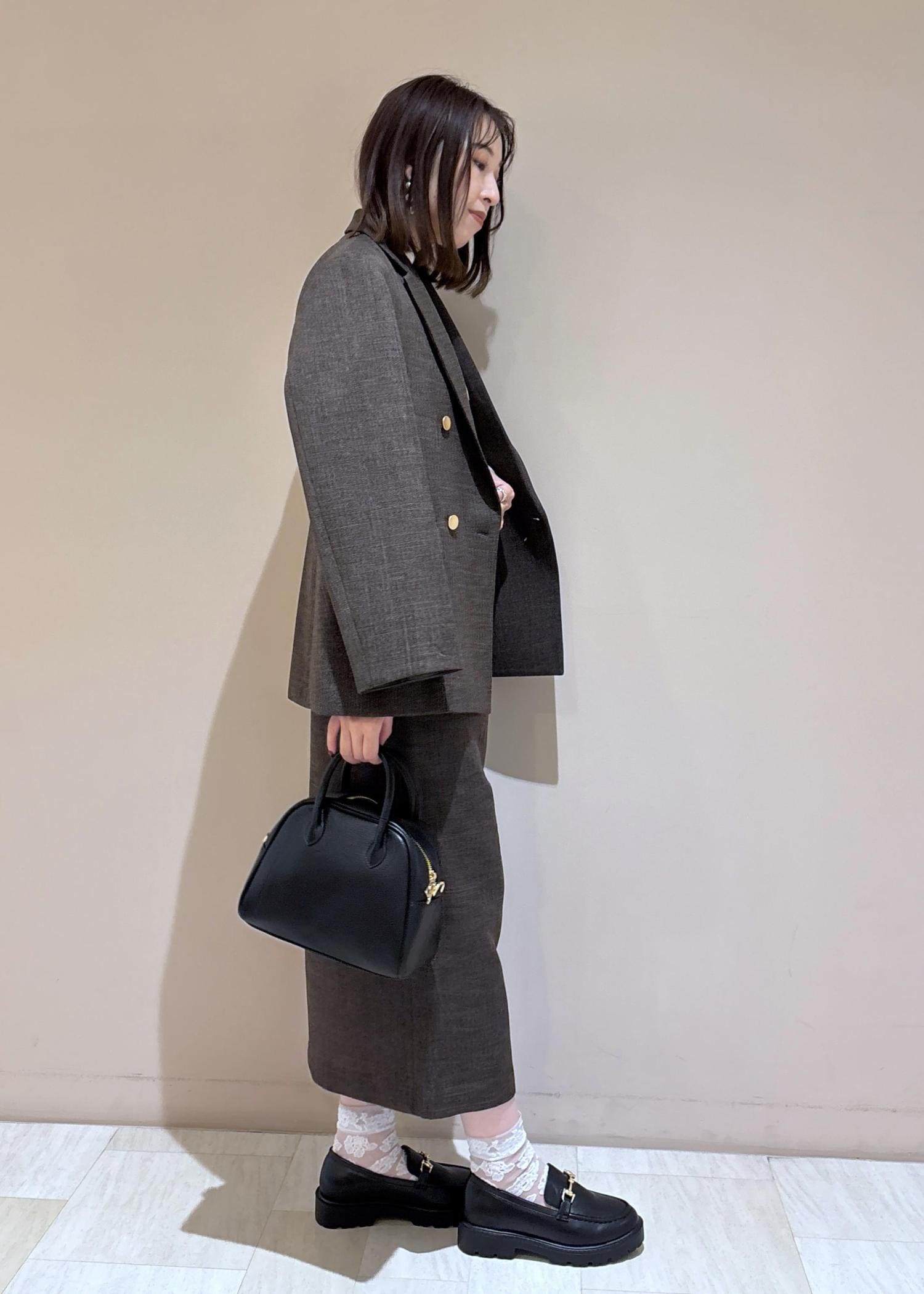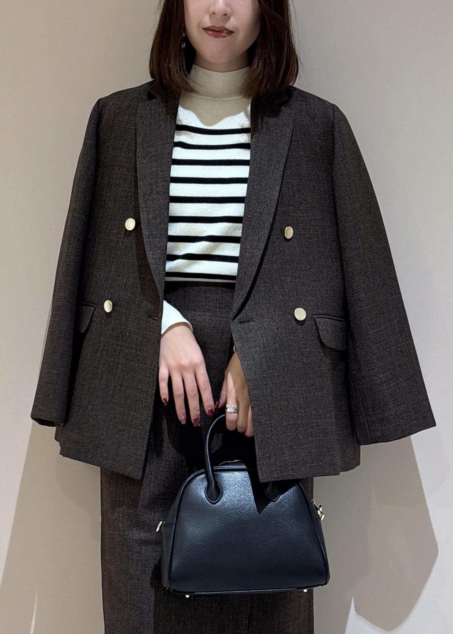 ジャケットとスカートは同素材のセットアップ。