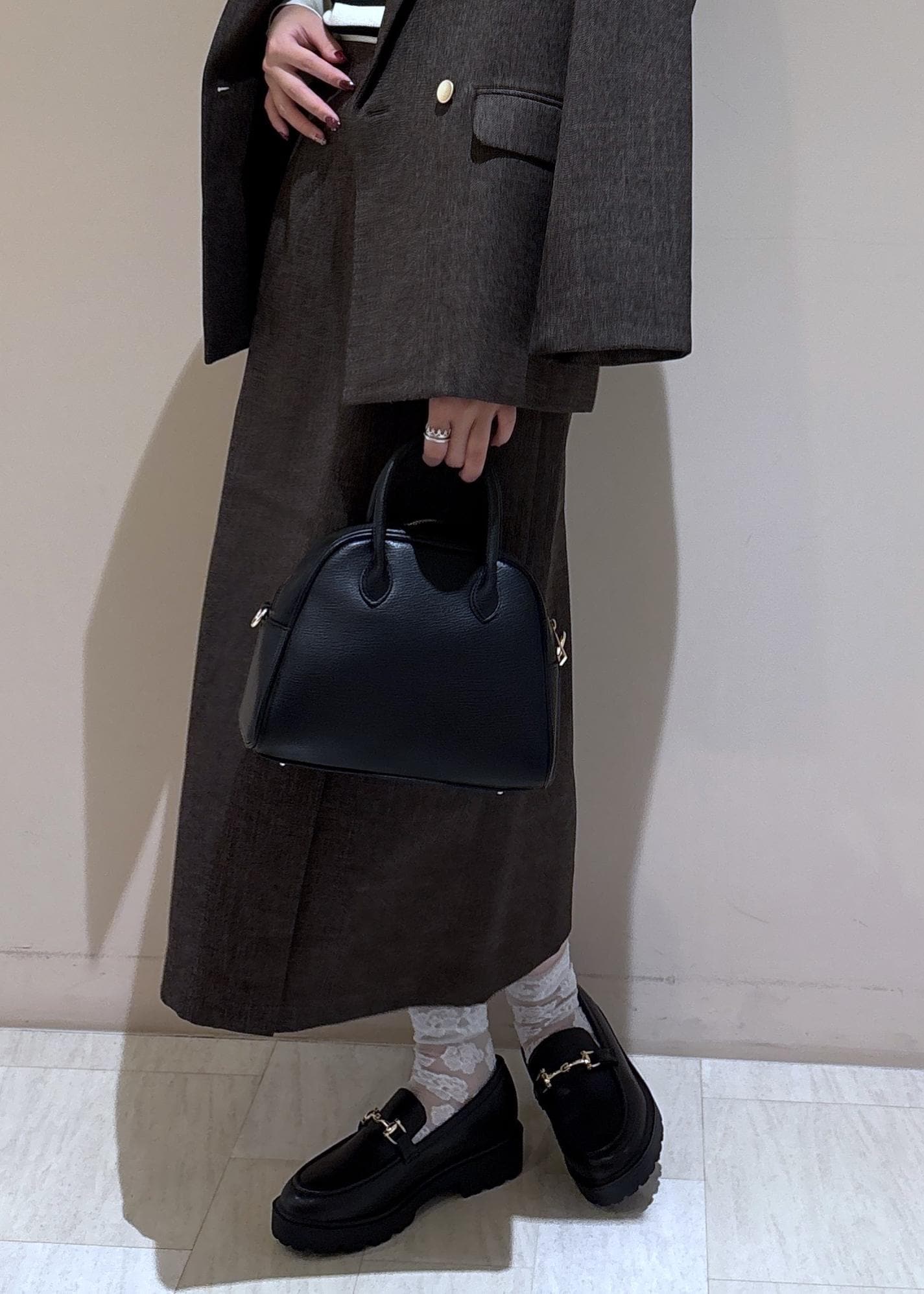 きちんと感のあるローファーとバッグをブラックにして女っぽ大人女子コーデに。