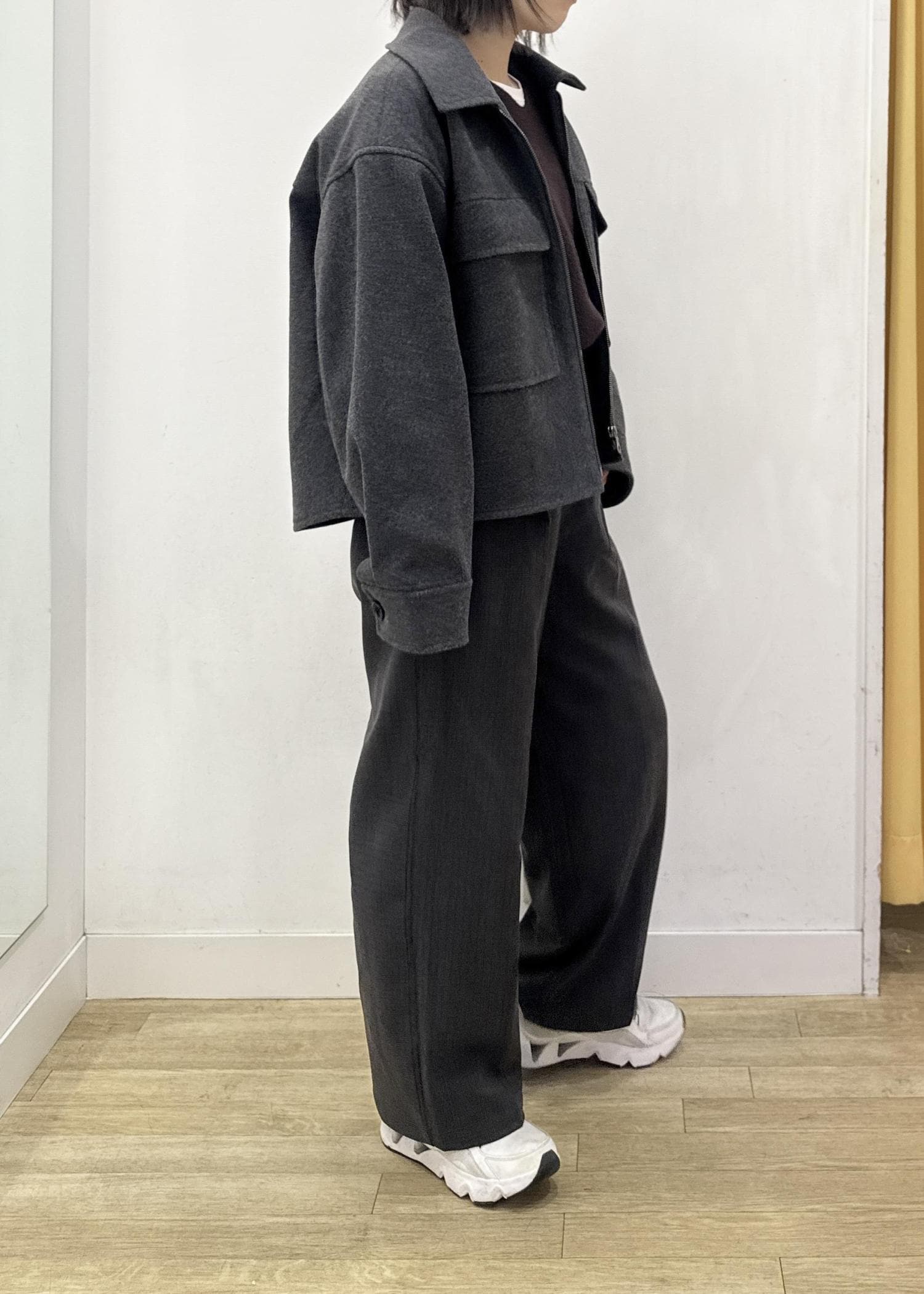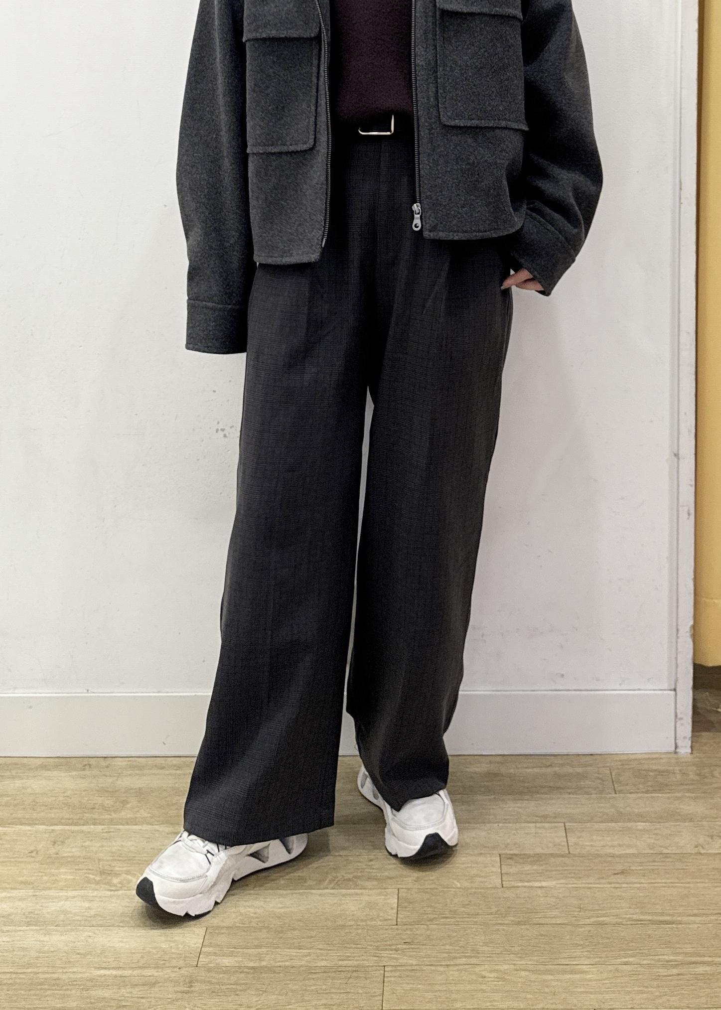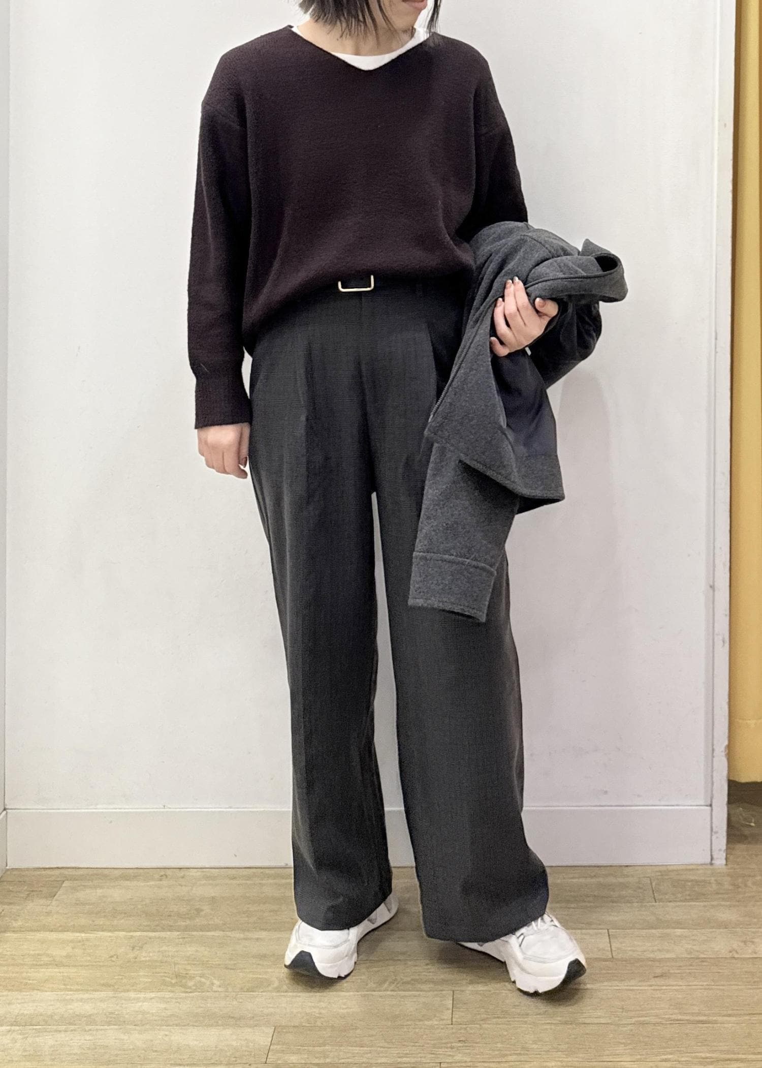 素材感は程よく厚みもあり、脚のラインを気にせずに穿けるゆったりシルエットです。 -