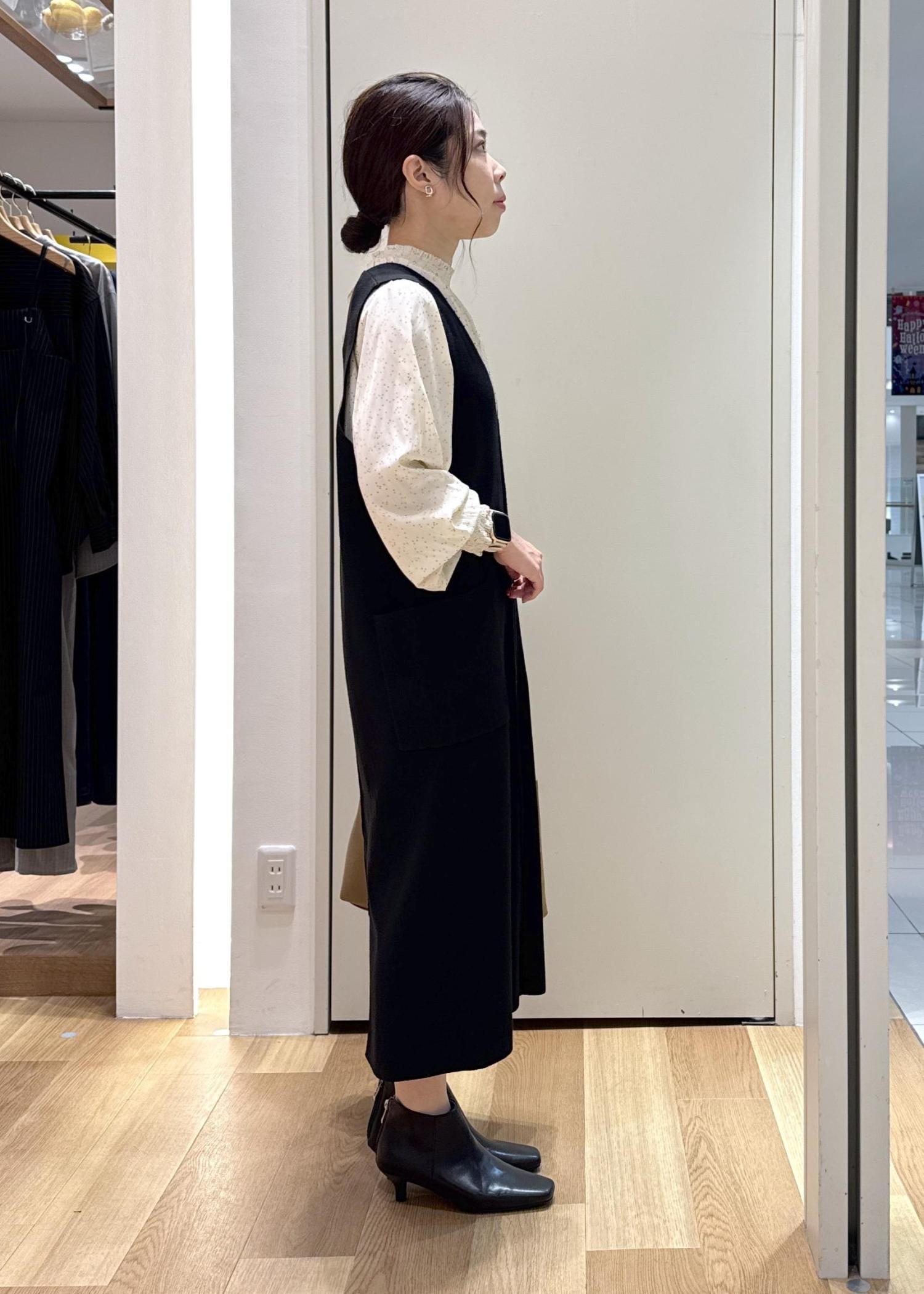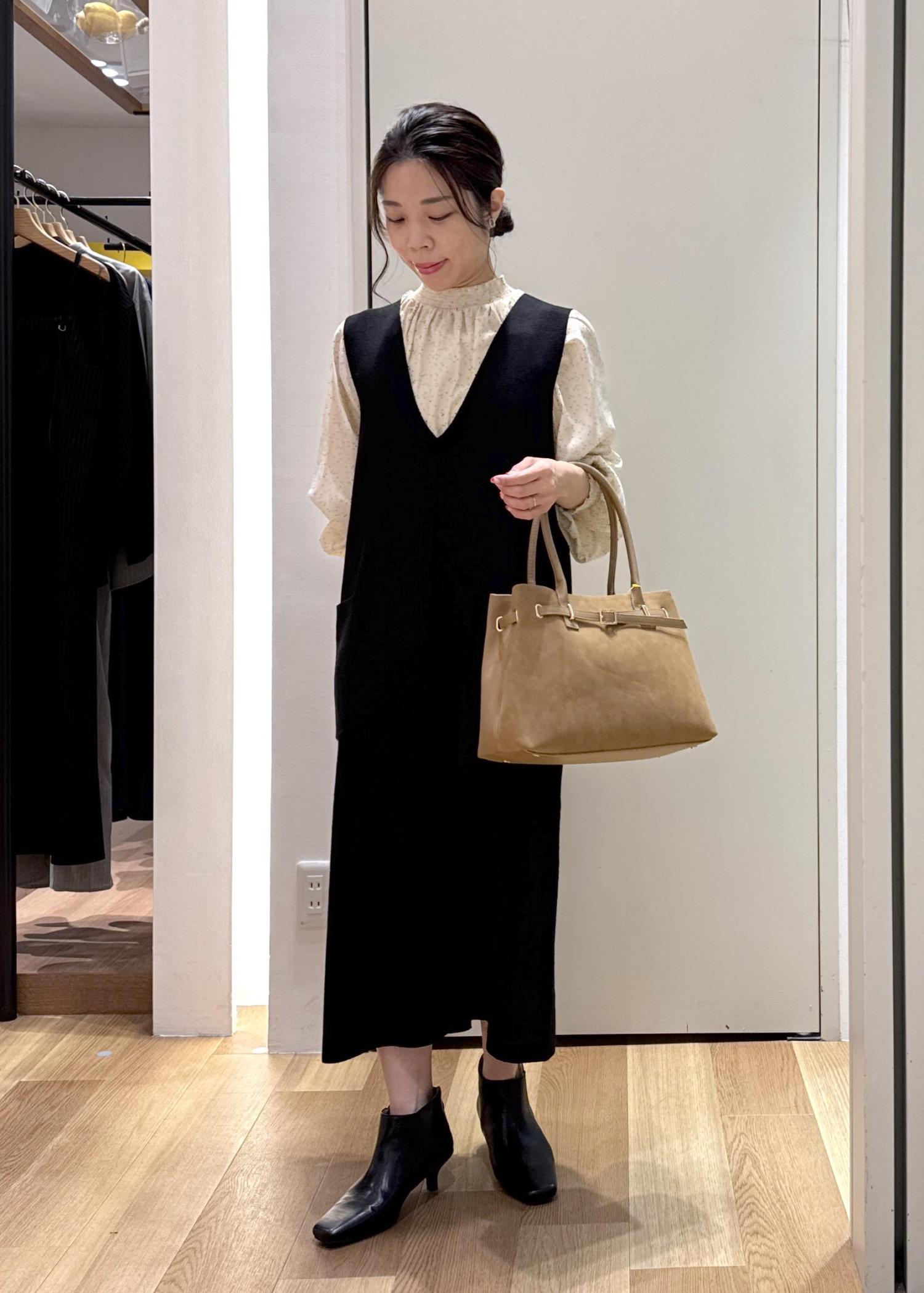 インナーはブラウス、足元はスッキリとしたアンクルブーツで大人っぽい雰囲気を意識したコーディネートです。