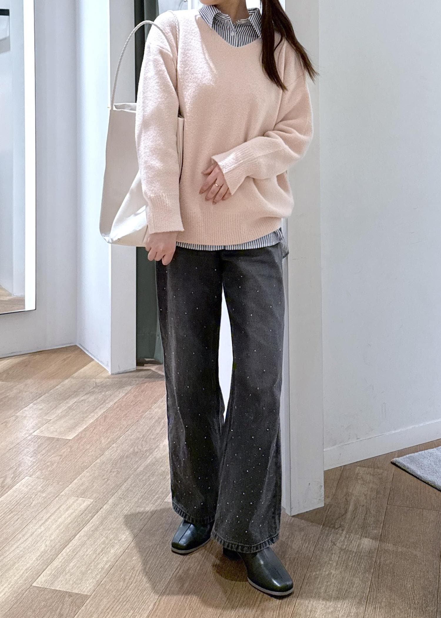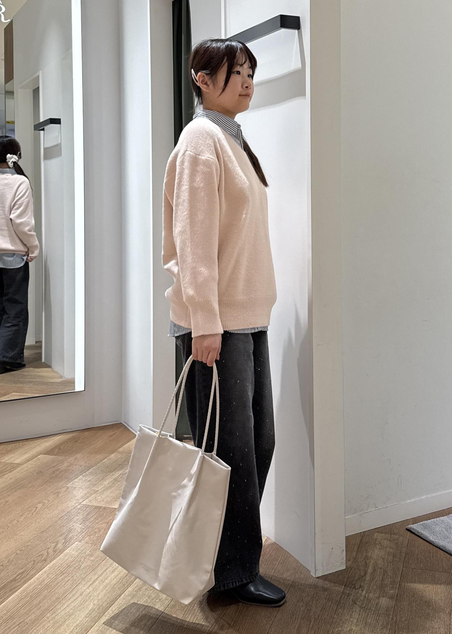 ピンクのニットにストライプシャツを合わせた、海外ガールチックなコーディネートです。