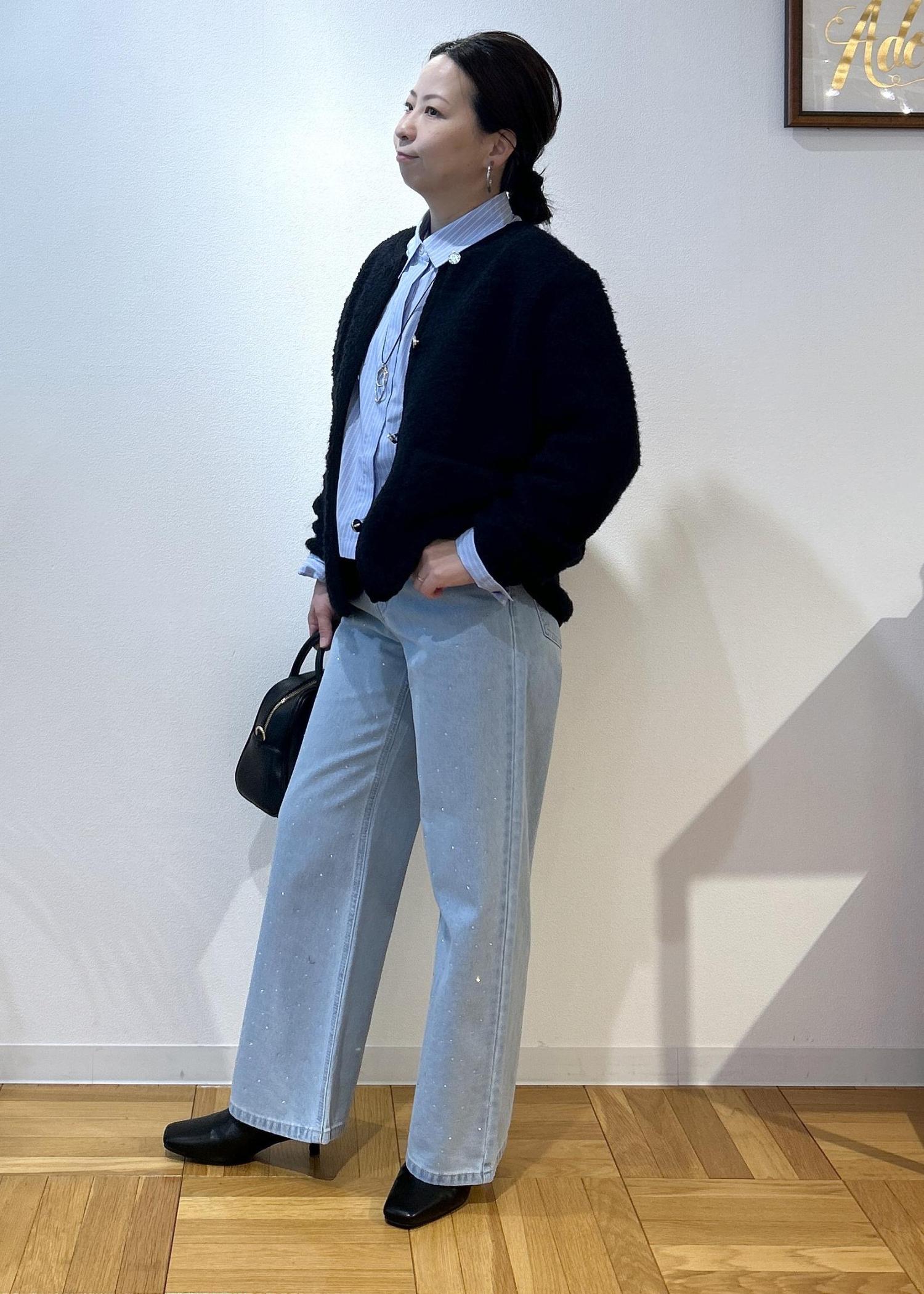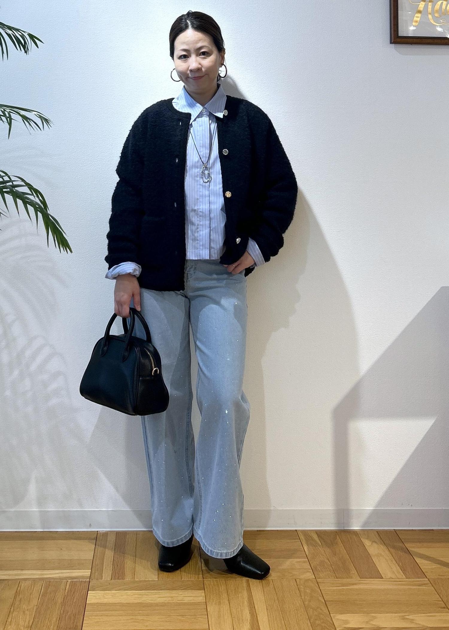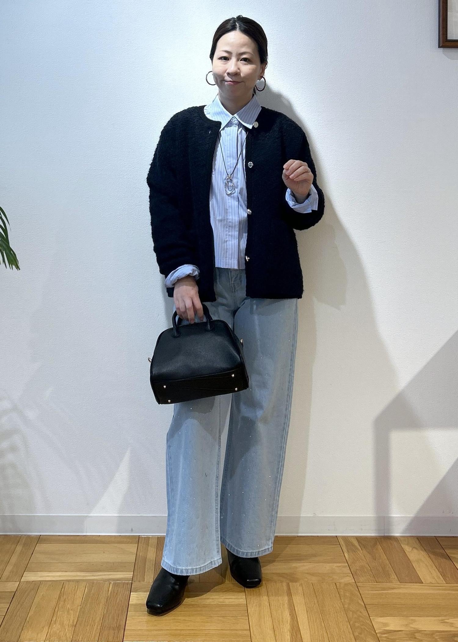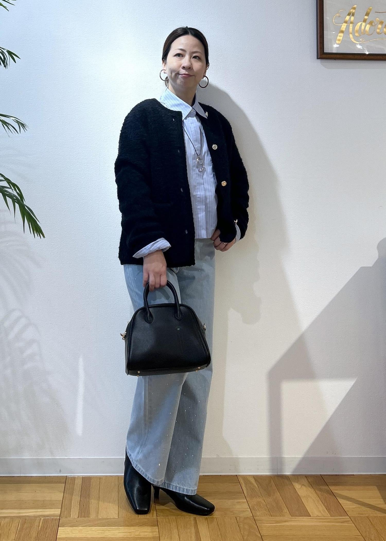 デニムとシャツでカジュアルスタイルですが、ニットアウターを着ることでエレガントさが足されます。ちょっとしたらランチやお買い物には動きやすくておすすめです。