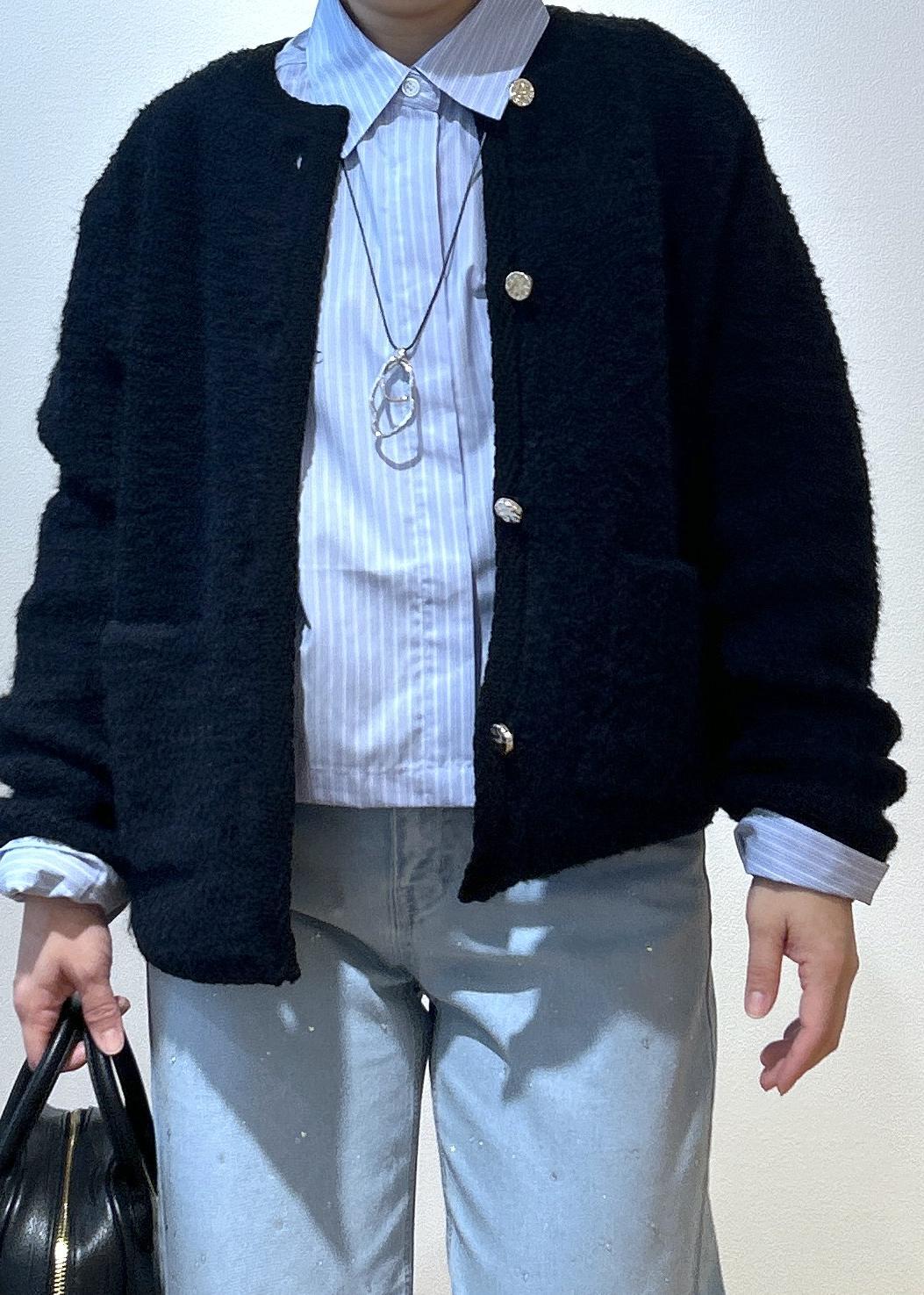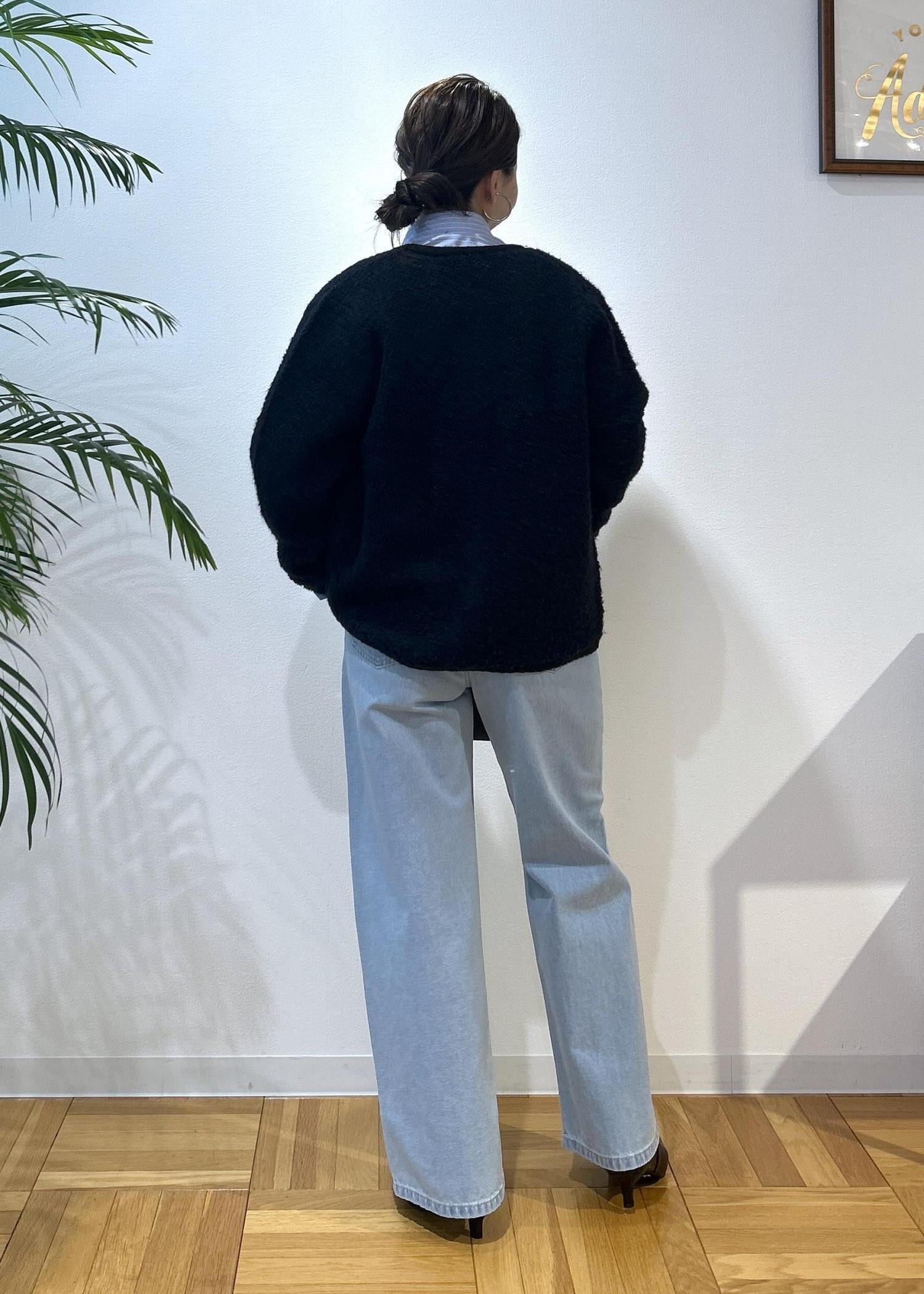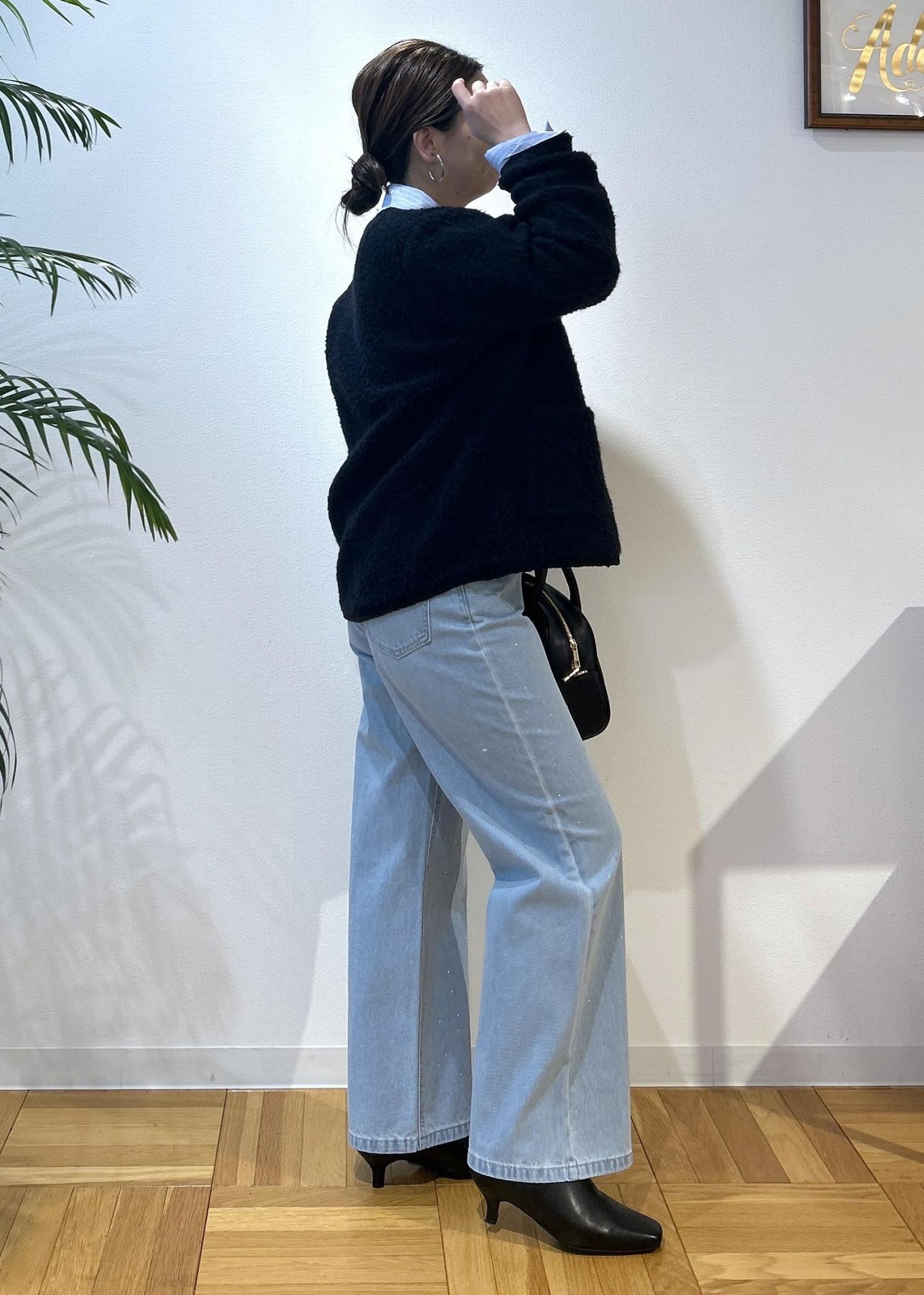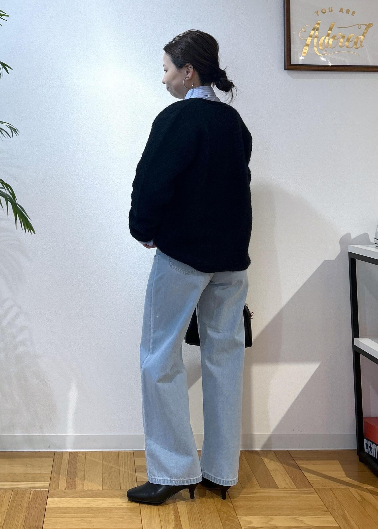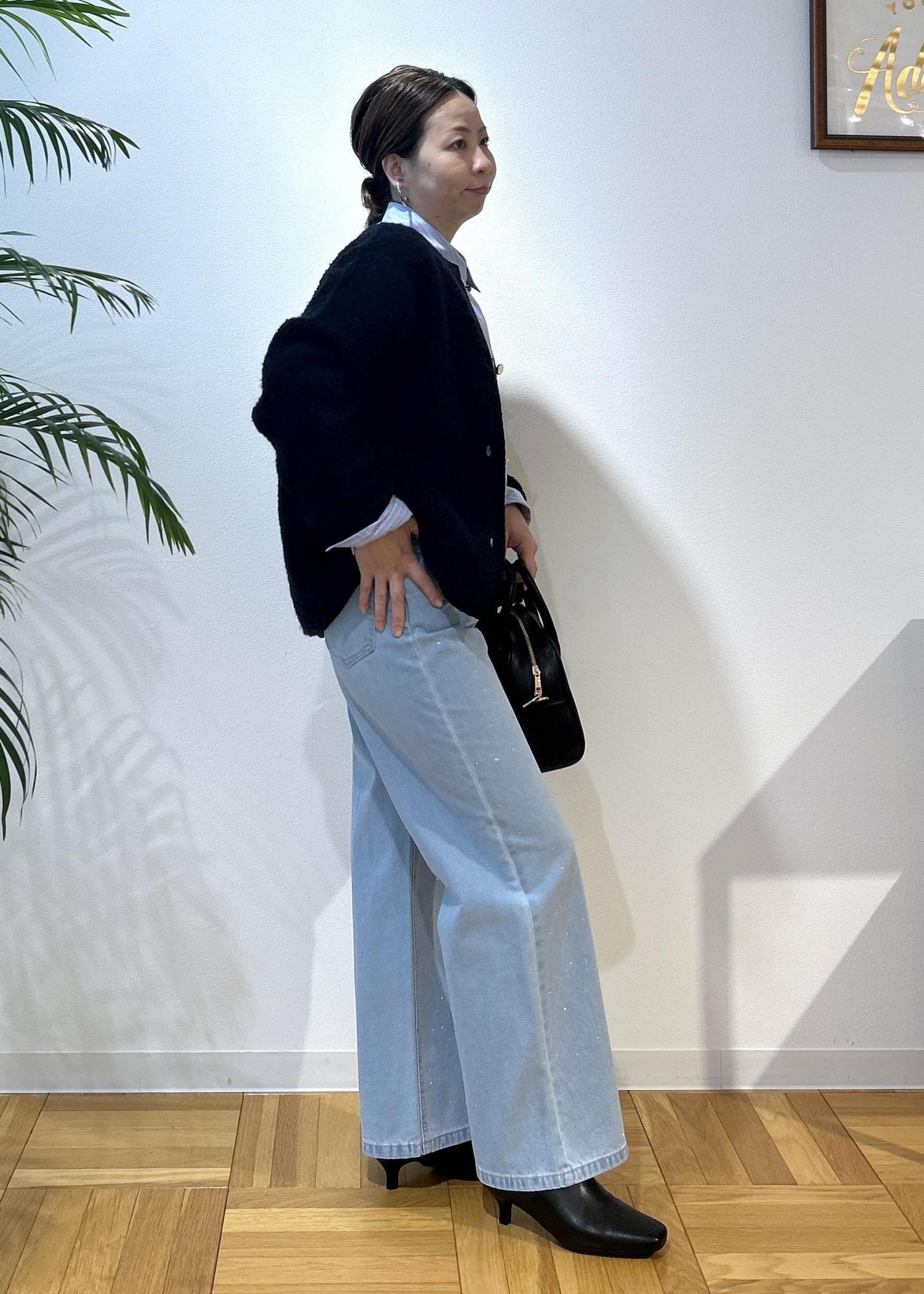 デニムとシャツでカジュアルスタイルですが、ニットアウターを着ることでエレガントさが足されます。ちょっとしたらランチやお買い物には動きやすくておすすめです。