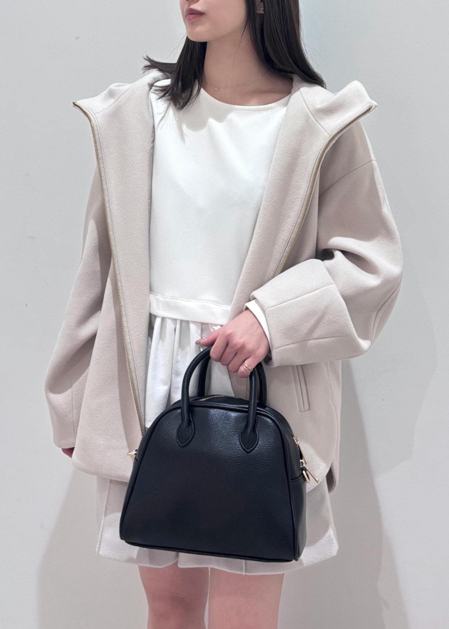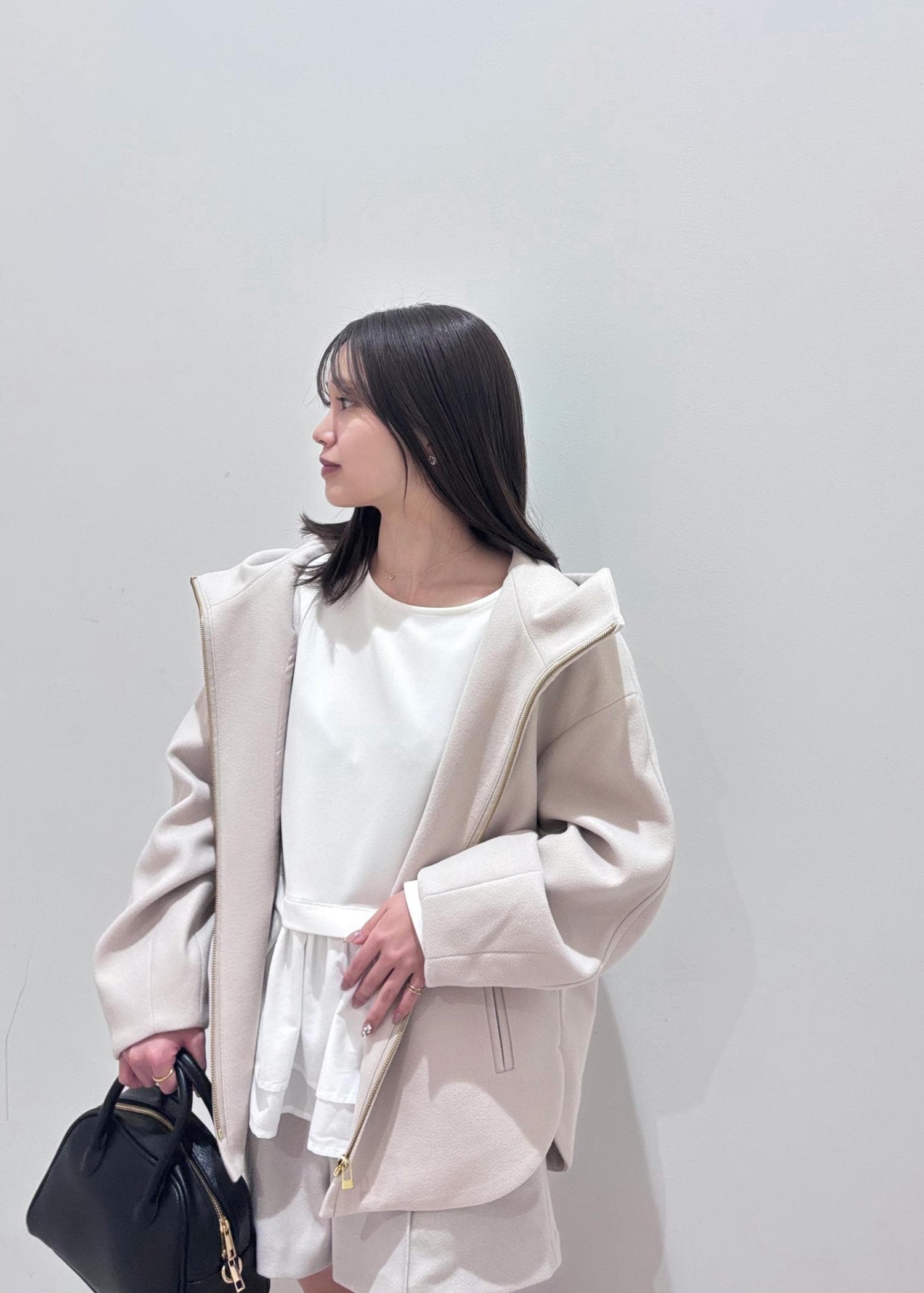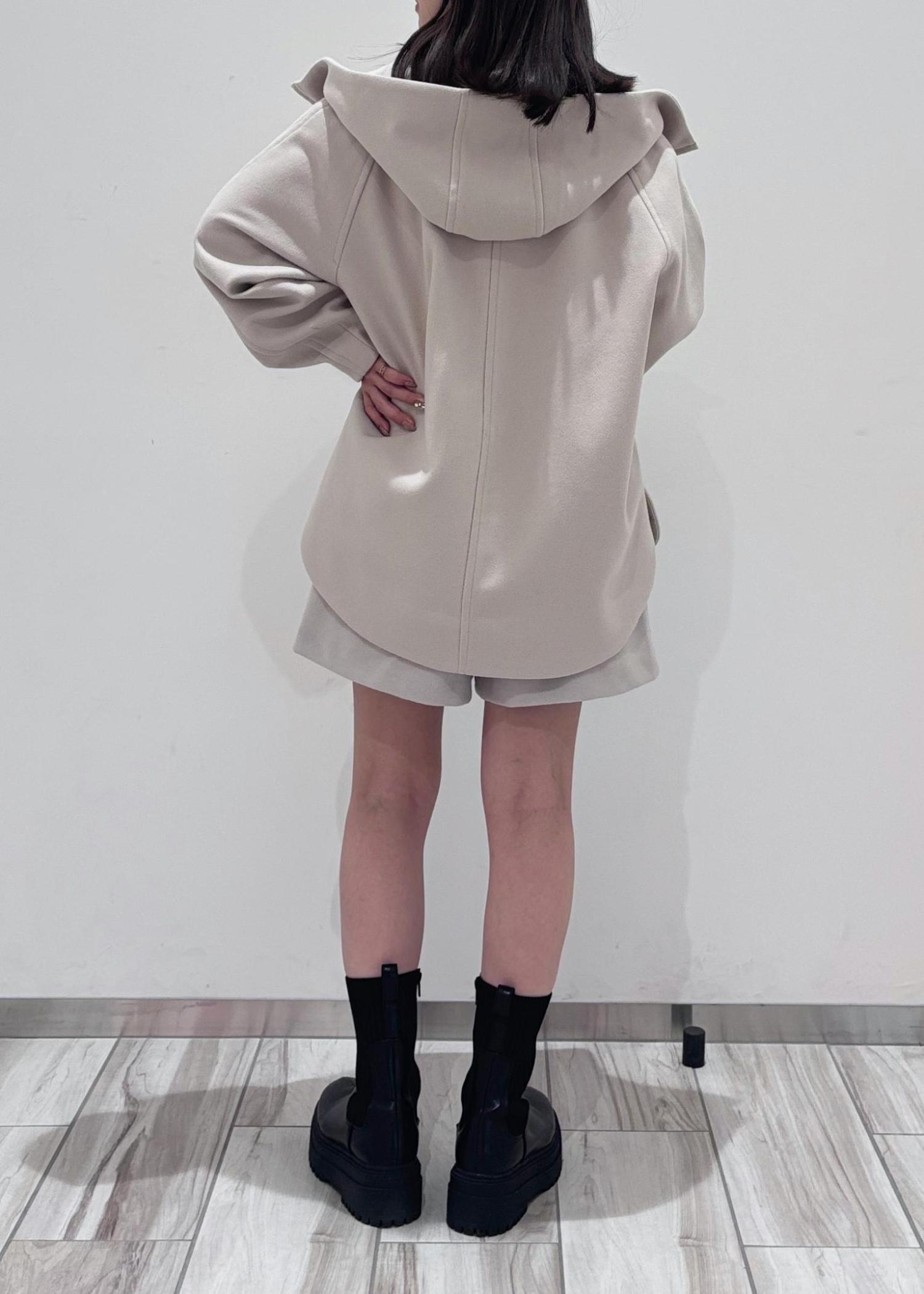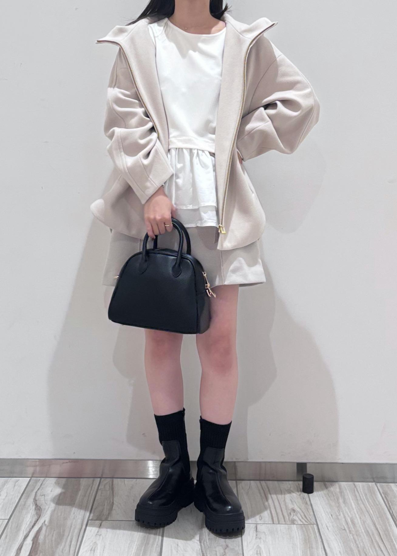 トップスとパンツはホワイト系で統一し、靴と小物は黒で揃えてみました♪アウターのタポッと感が可愛いので、ボトムはショーパン&ブーツで冬のホワイトコーデで大人可愛いコーデにしてみました◎ アウターは脱いだ時もシンプルになりすぎない様、着映えするペプラムトップスを合わせました♪