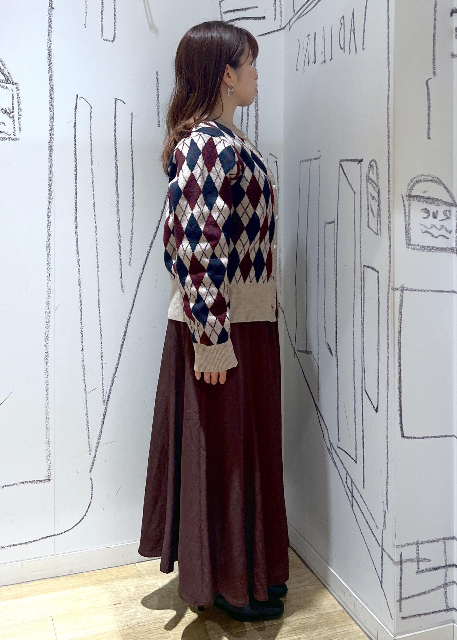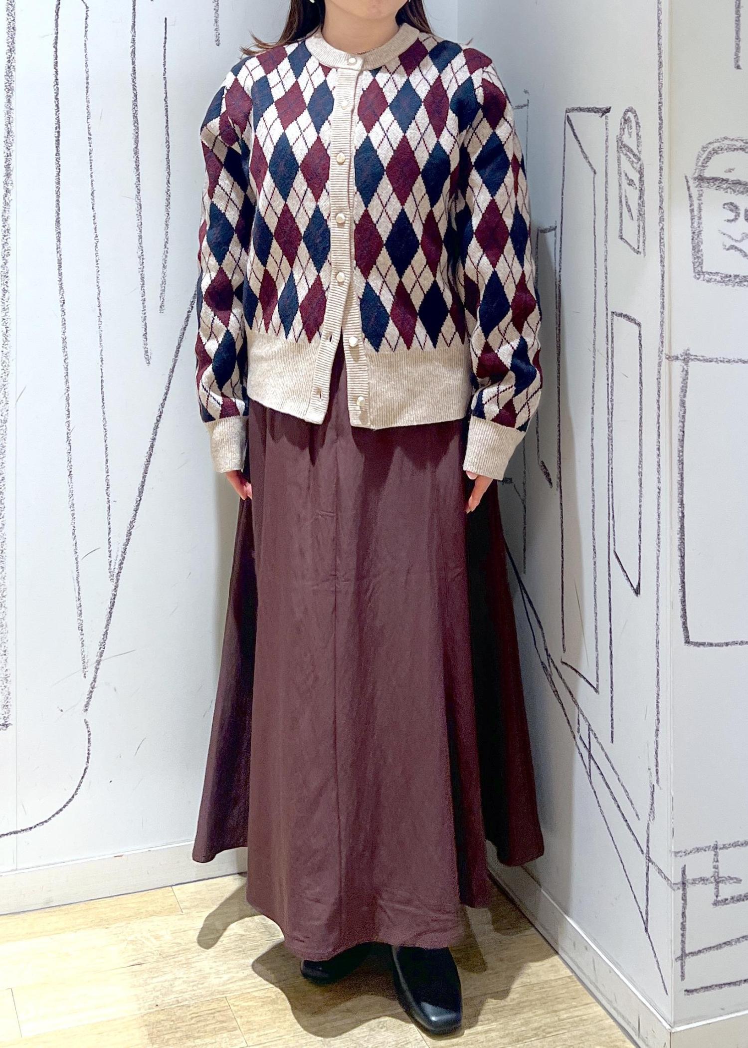小柄さんにもオススメしたい定番可愛いアーガイル柄カーディガンとマーメイドスカートのコーディネートです♪女子会も忘年会やデートもこれで決まり!