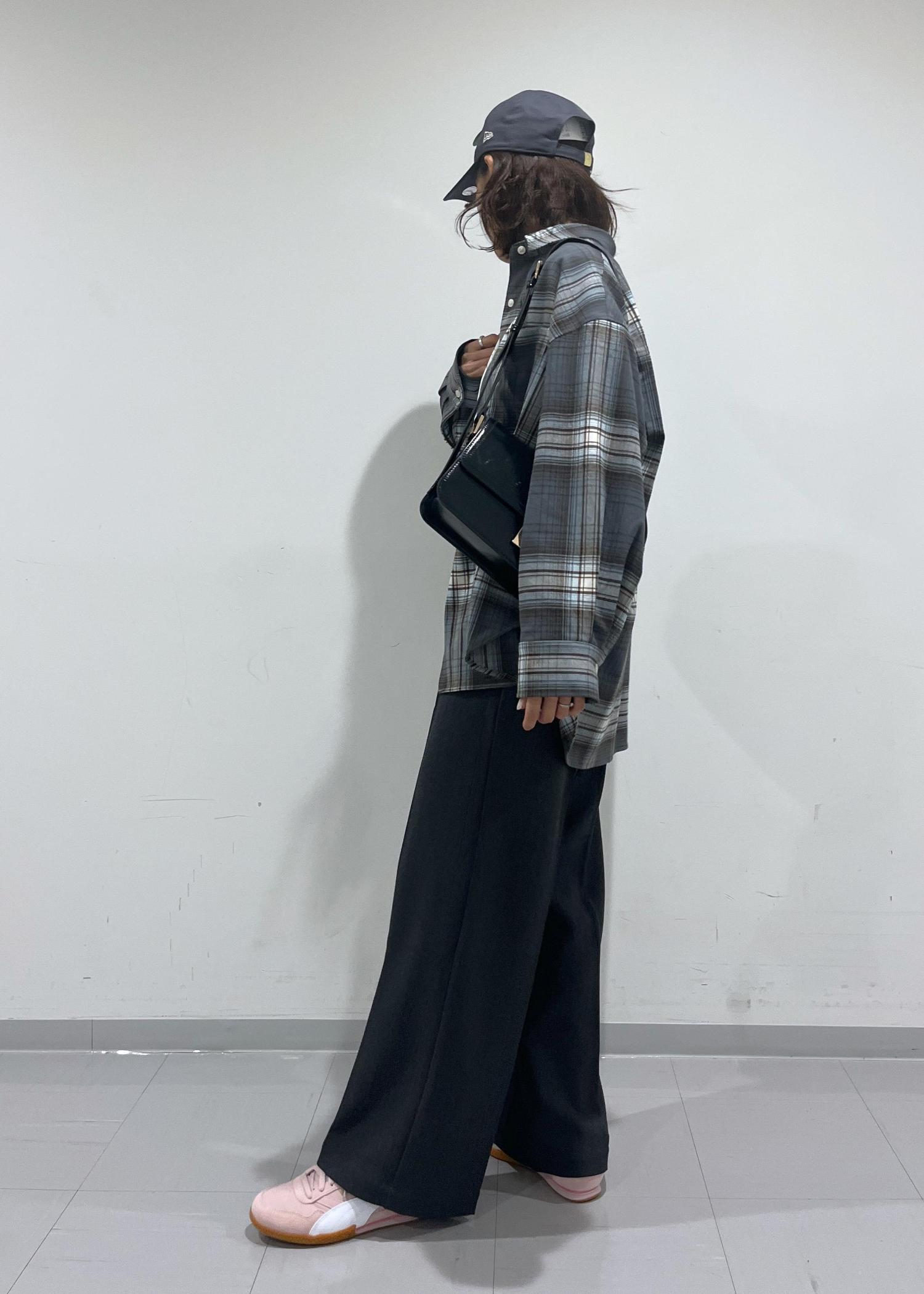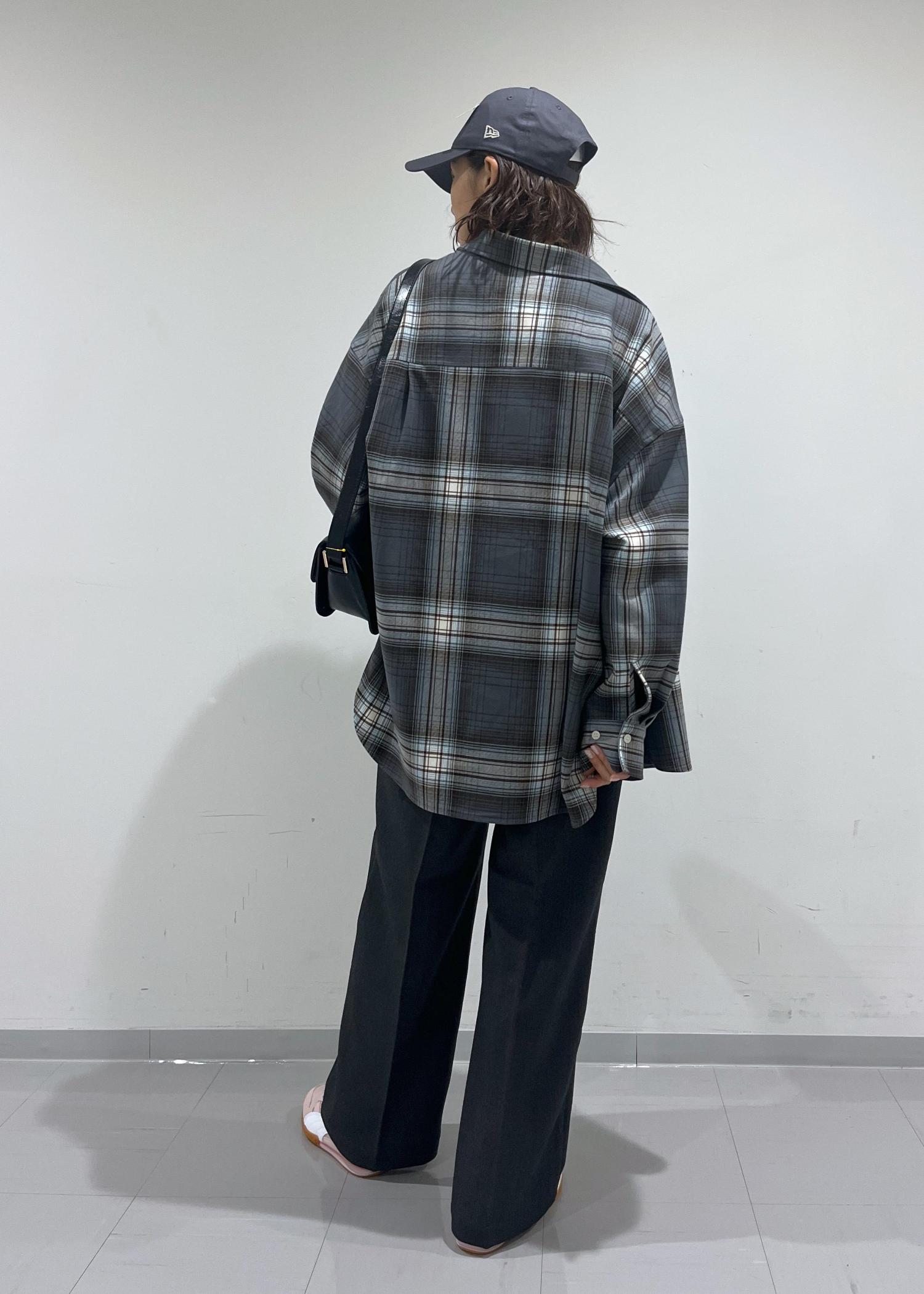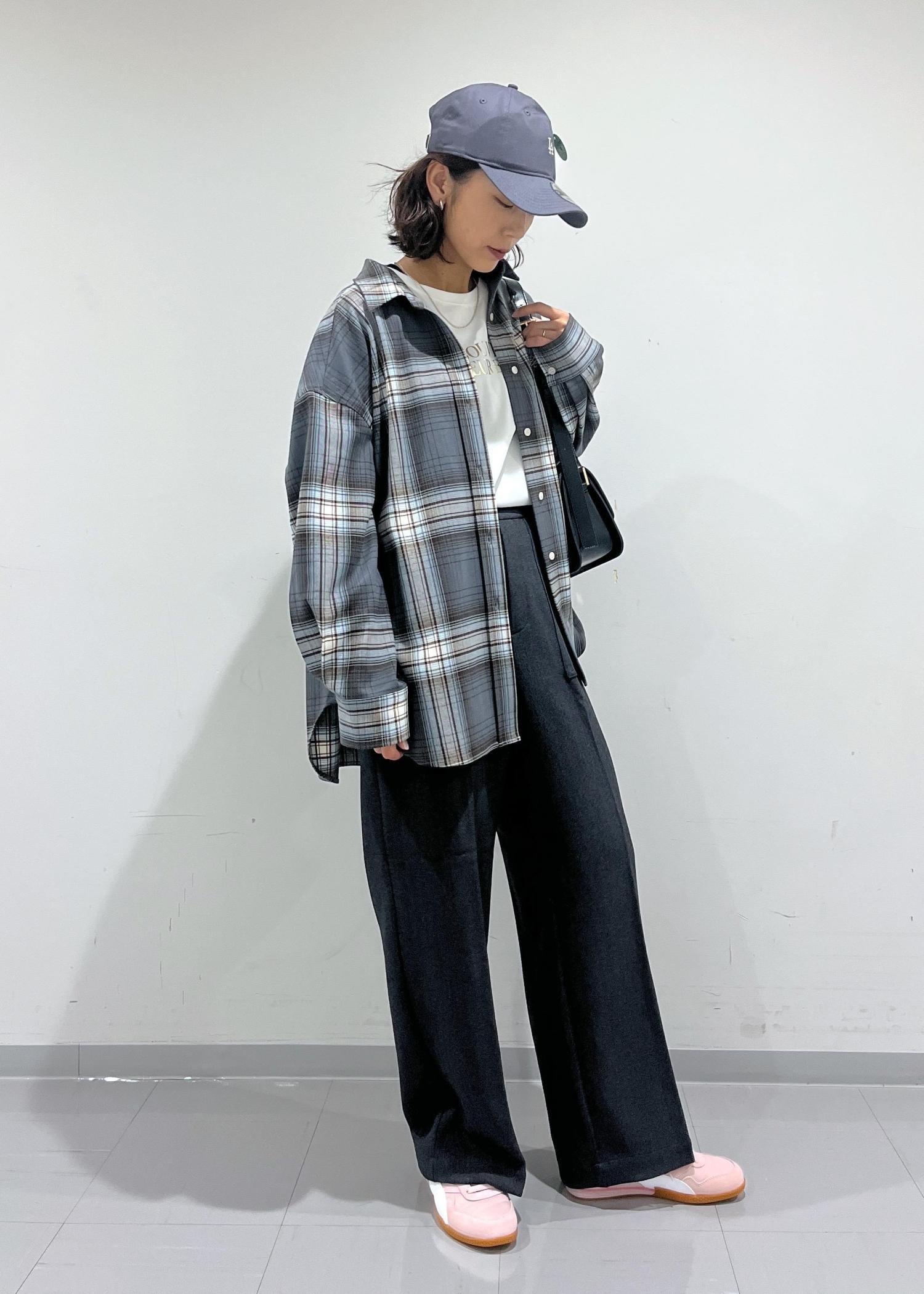 オーバーサイズのシャツなので、ボトムはスリムストレートのパンツを合わせてルーズになりすぎずバランスの取れたシルエットに調整。