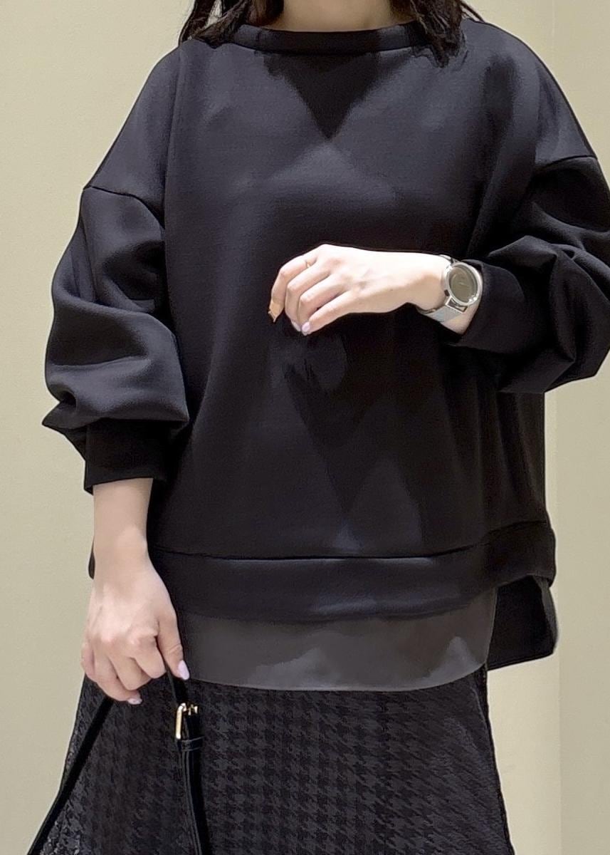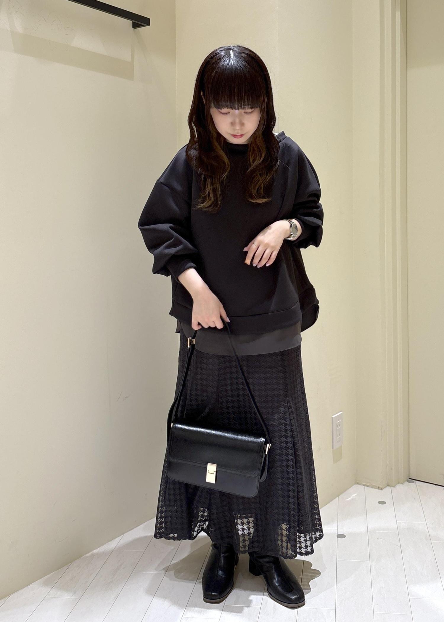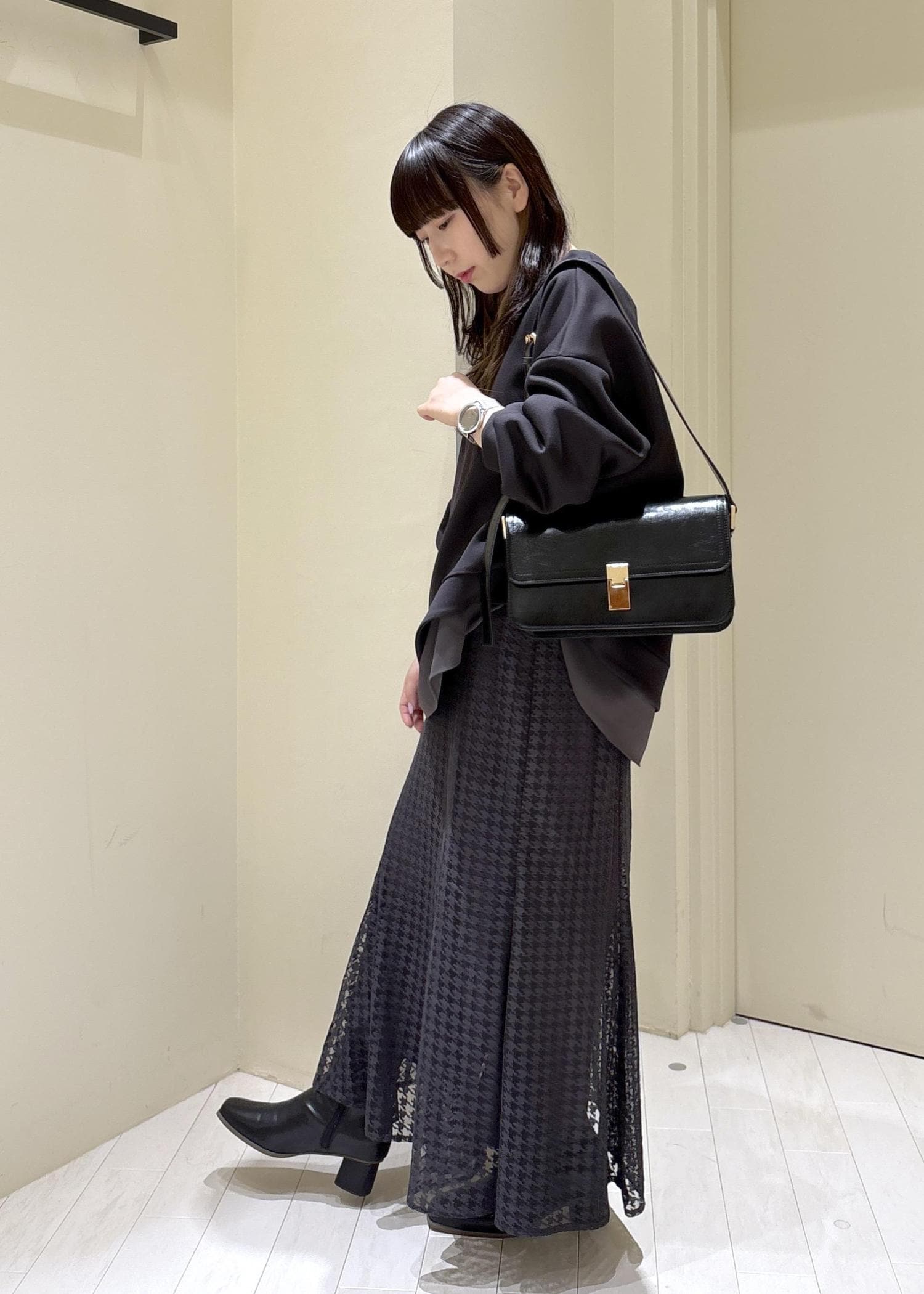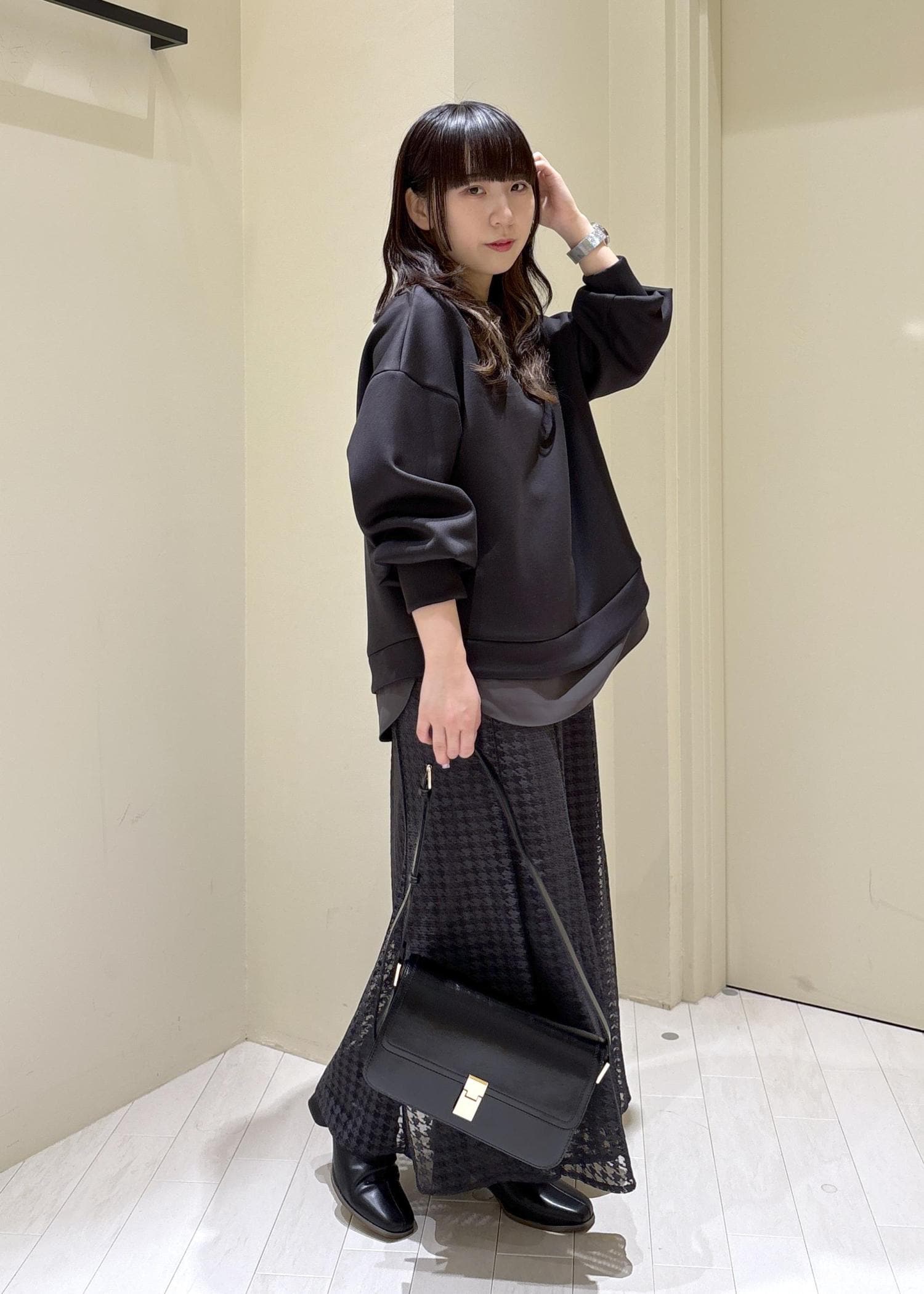 トップスも元々レイヤードシャツがドッキングされており、スカートも千鳥レースが重なっていて楽チン+おしゃれが叶うコーデです◎