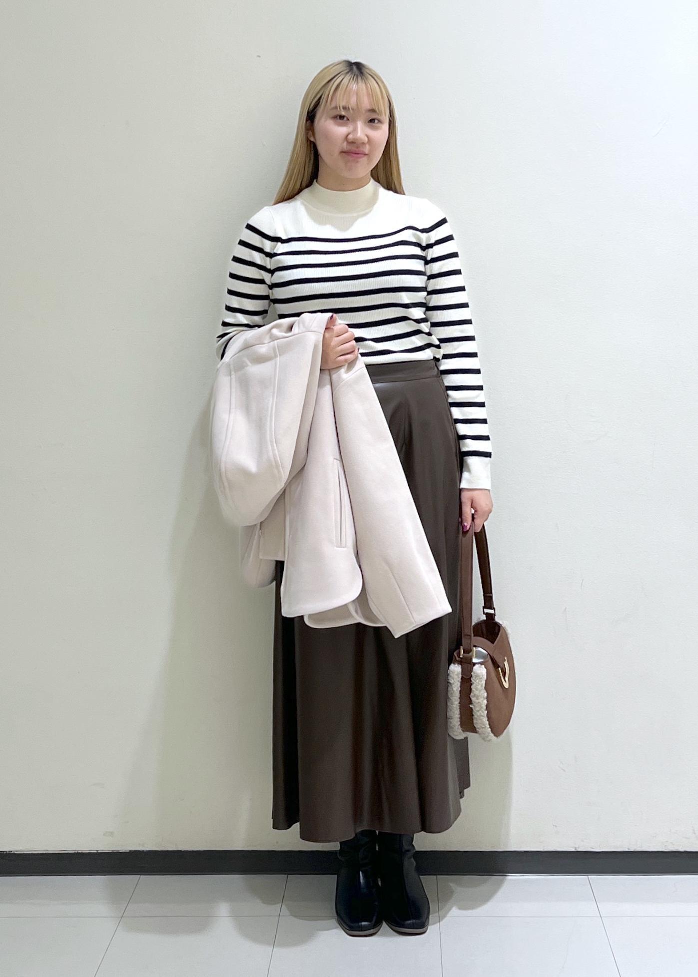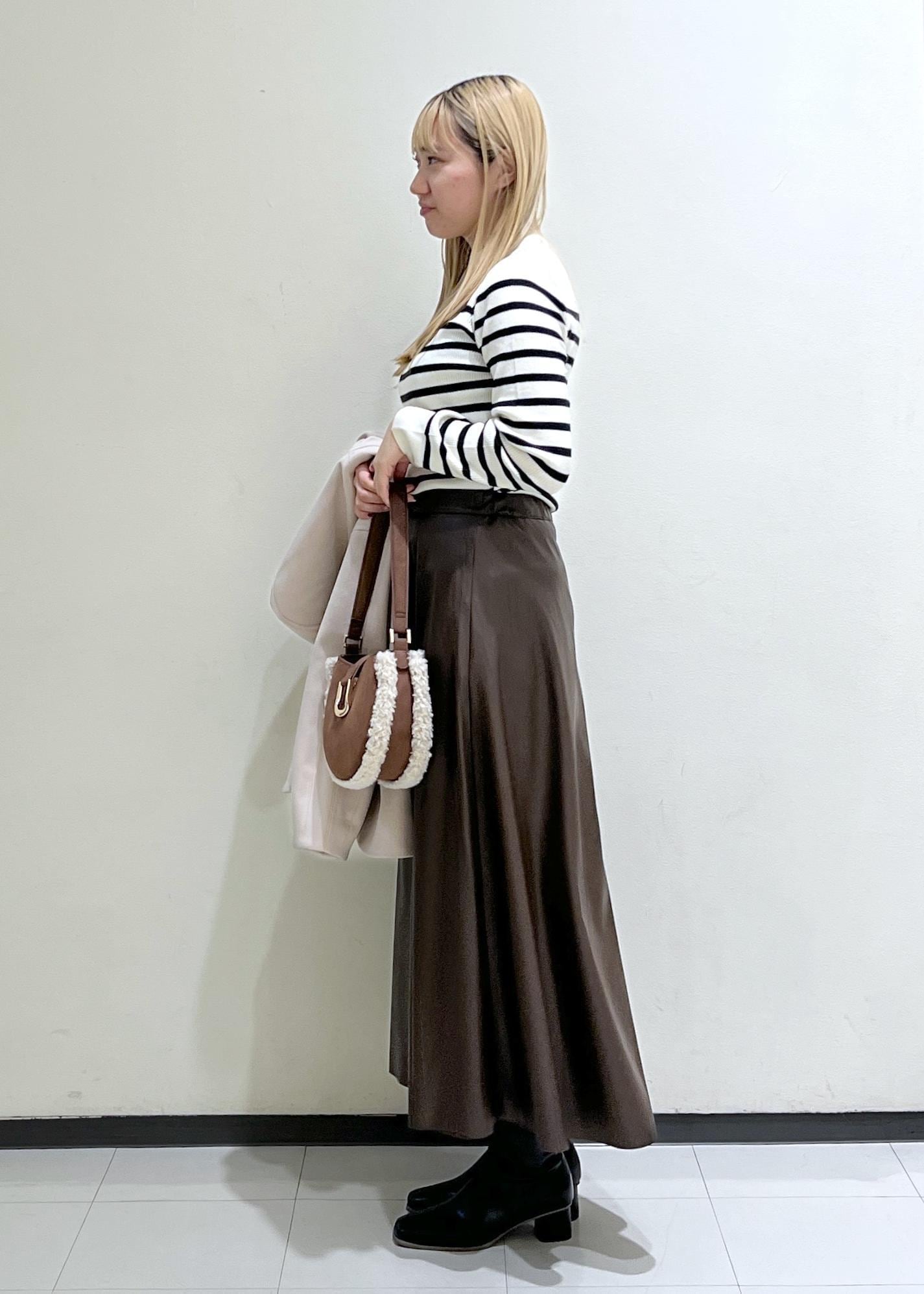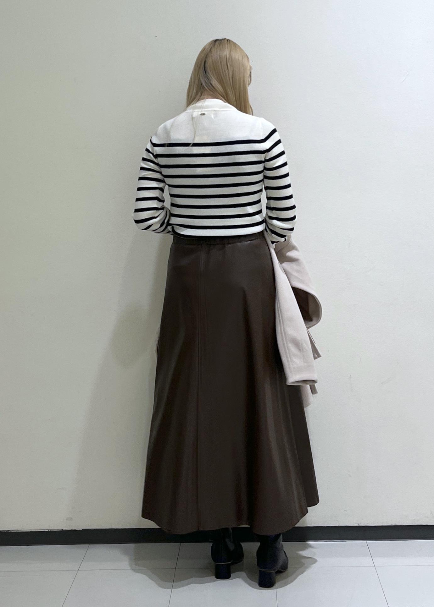 ゆったりめのシルエットなのでカジュアルになりすぎないようにレザーのスカートと合わせて女性らしいきれいめなコーディネートにしました◎