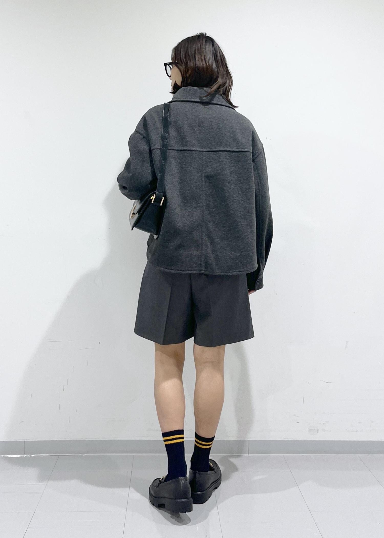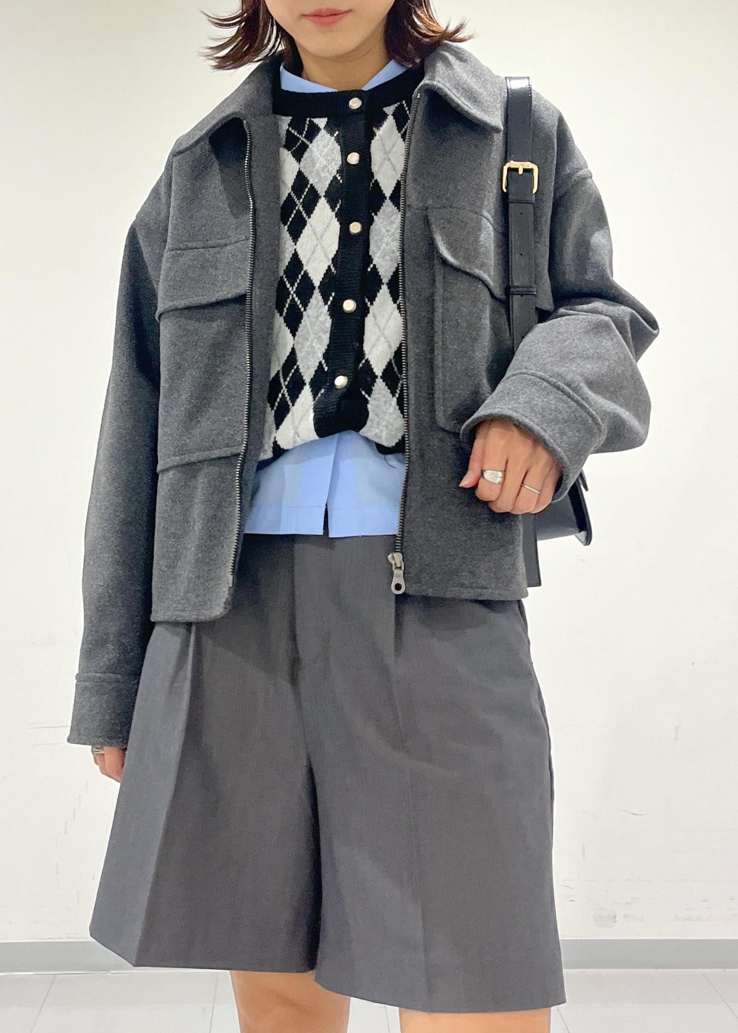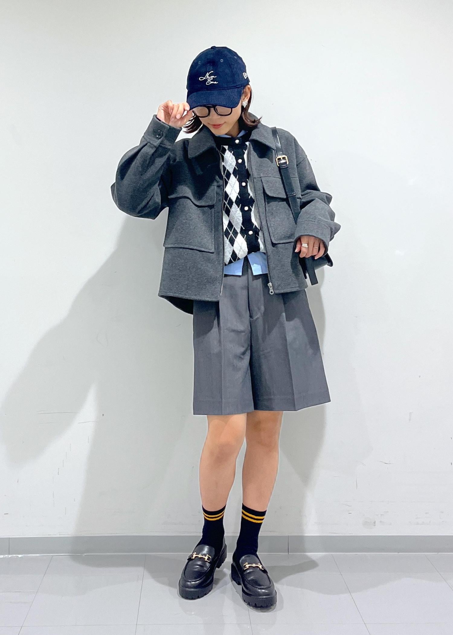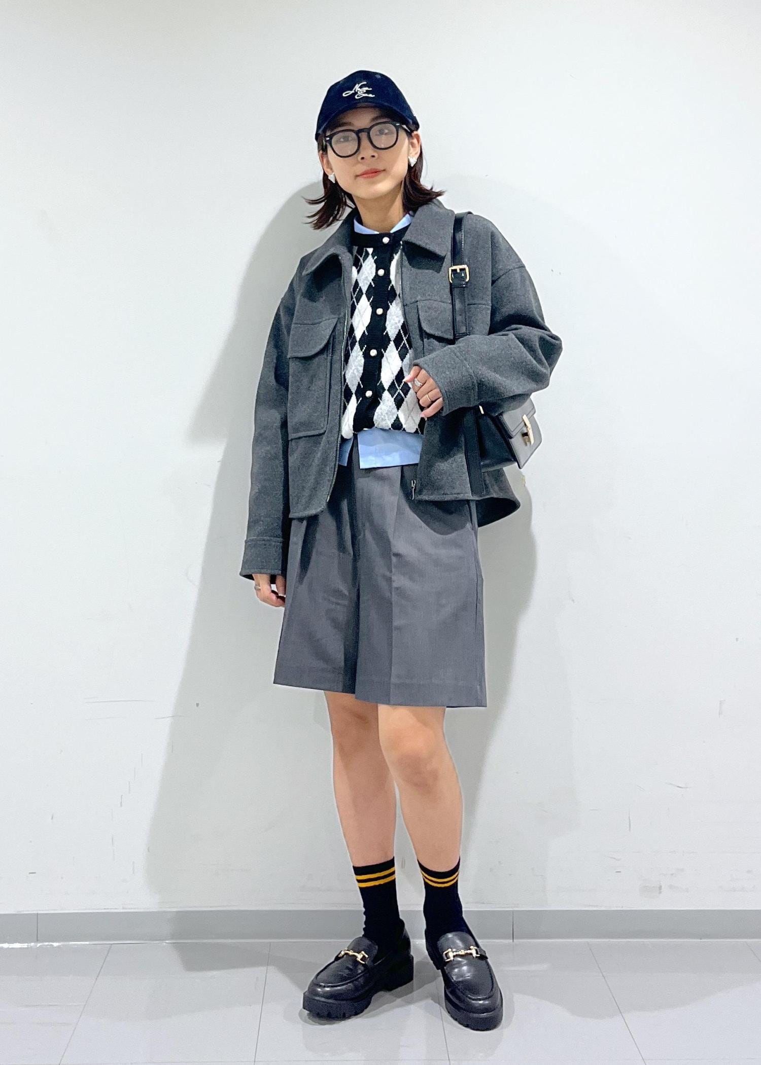 ハーフパンツが寒々しく見えないよう上半身はアーガイルニットで温かみのあるアイテムを取り入れました。