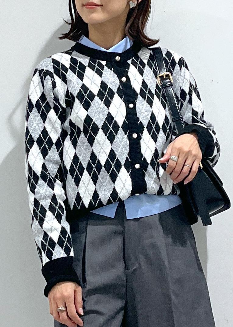 ROPÉ PICNICアーガイル柄アソートカーディガンブラック / F¥5,995レビュー腰骨くらいの着丈でシルエットもすっきりですが、コンパクトニットやシャツを重ね着できるゆとりはあります。