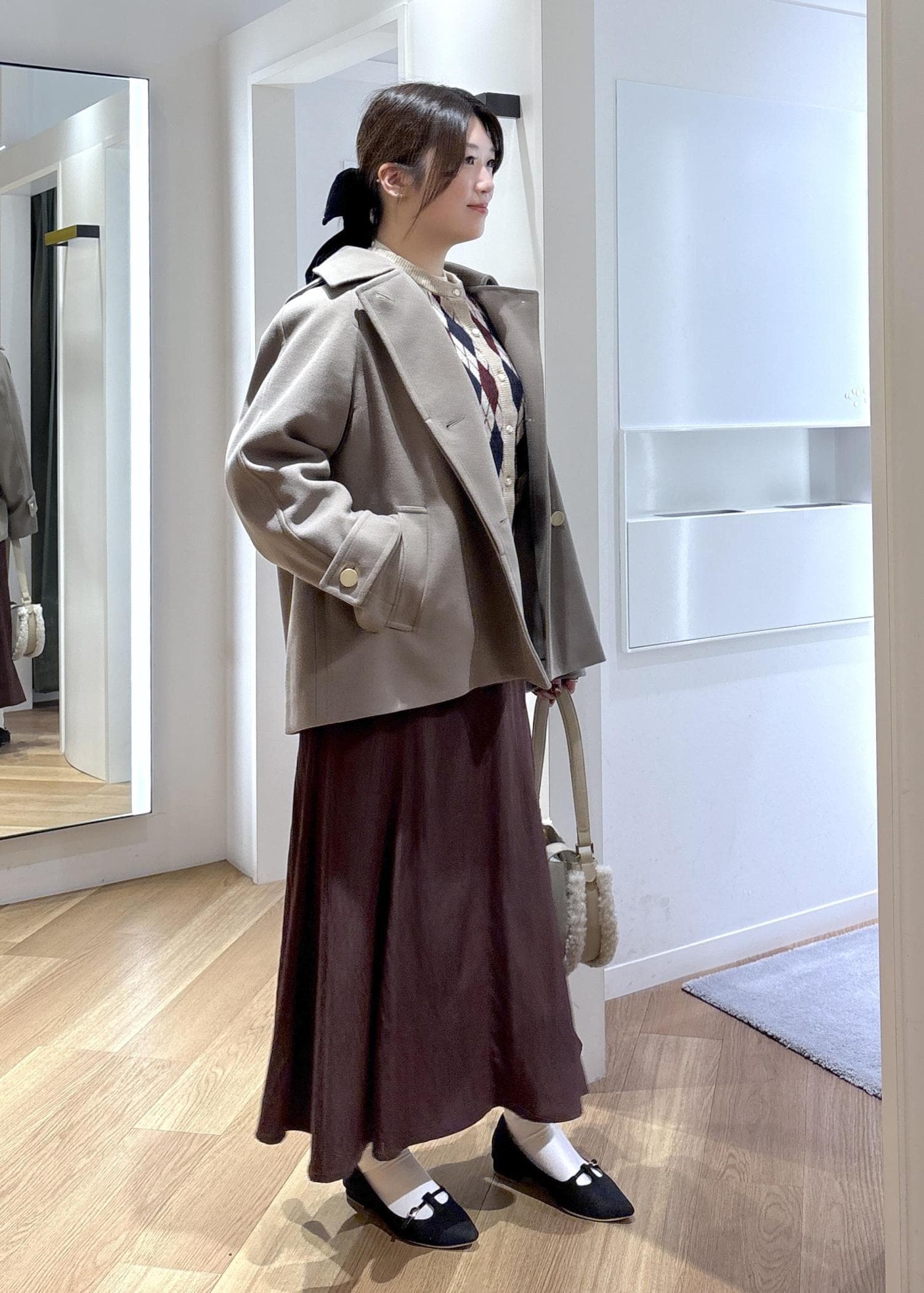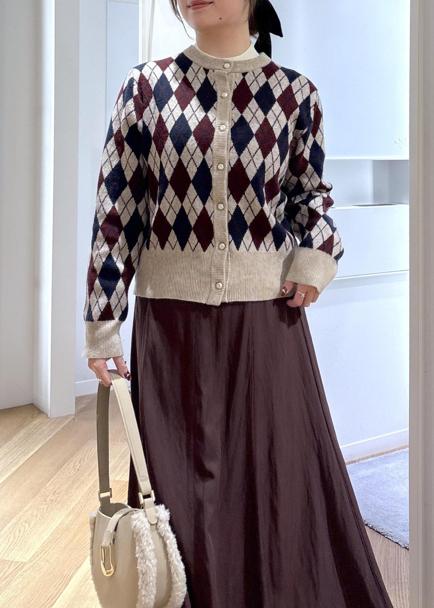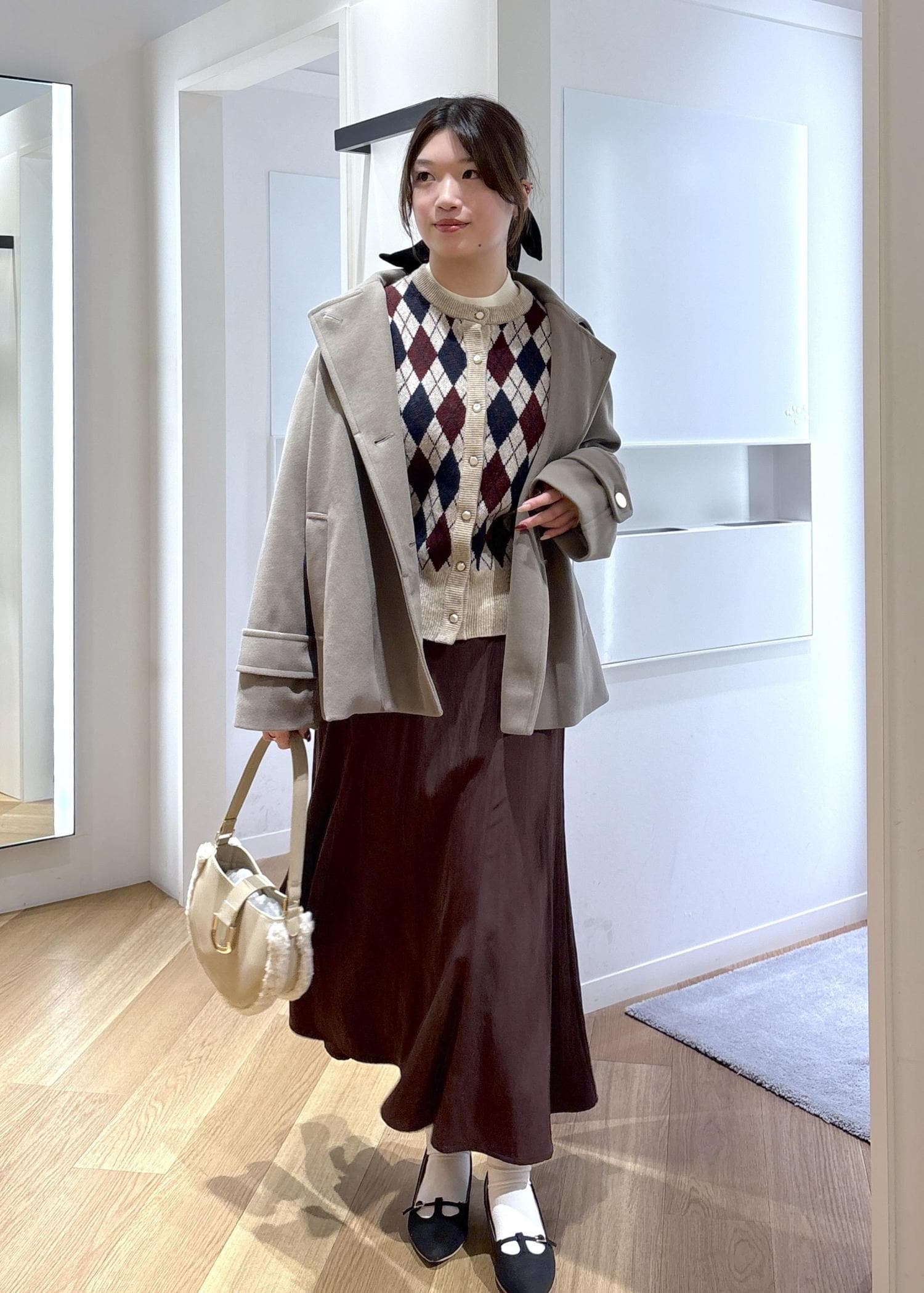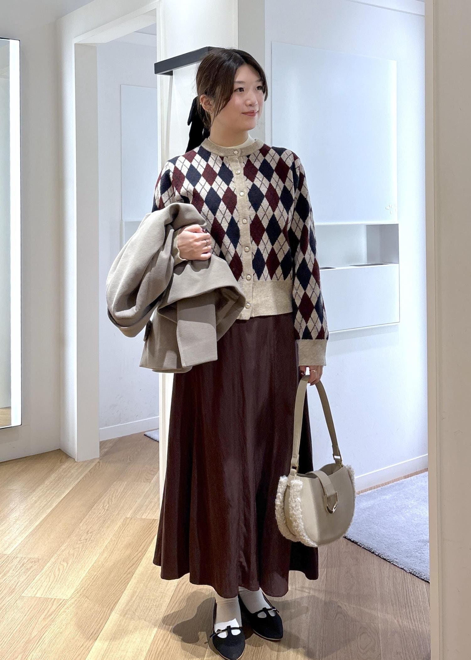 コートインにはアーガイル柄のカーディガンを合わせて、冬らしさと華やかさをプラスしました♡