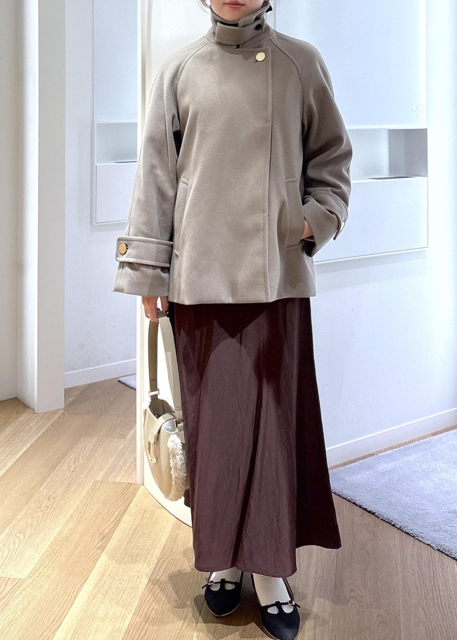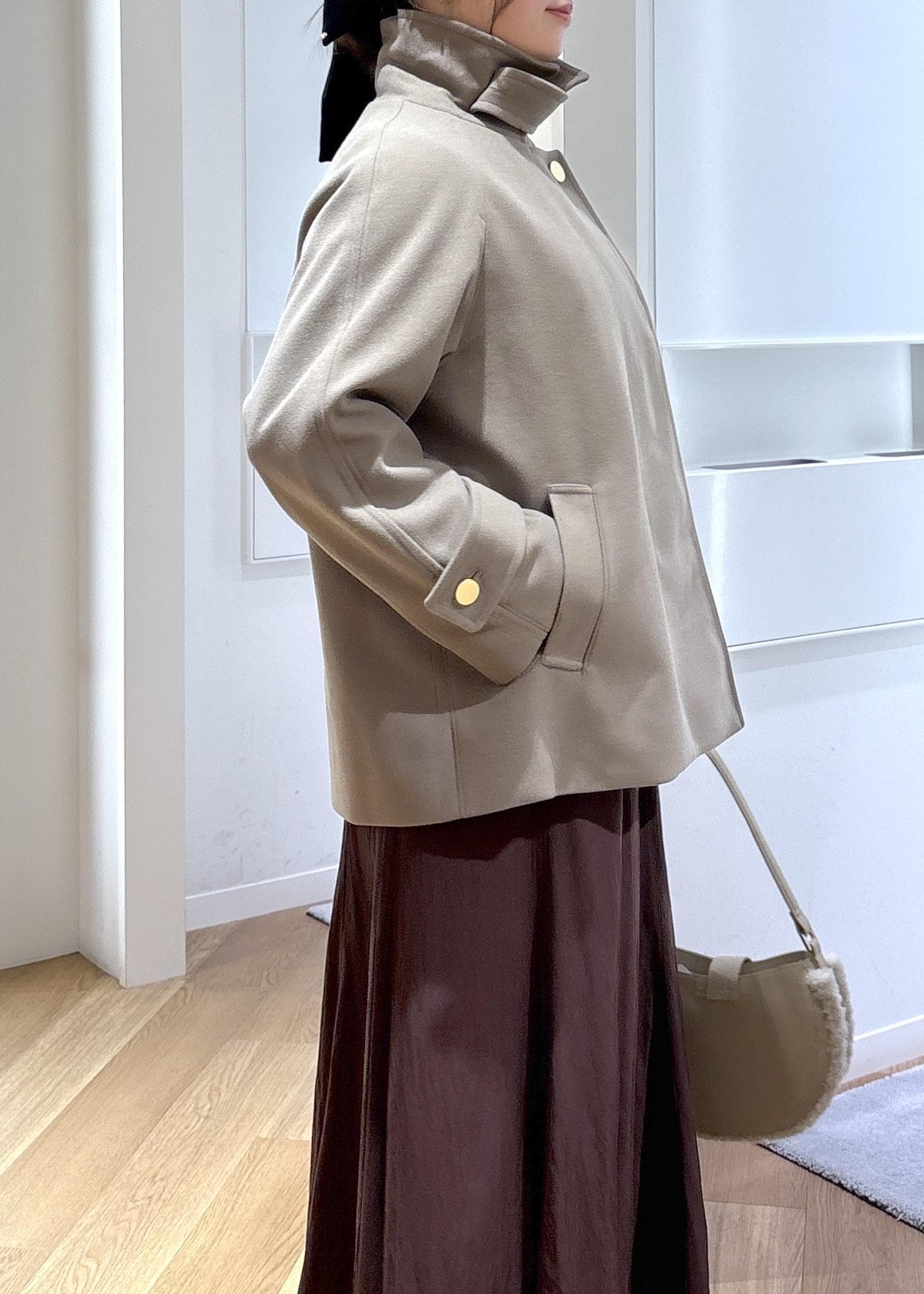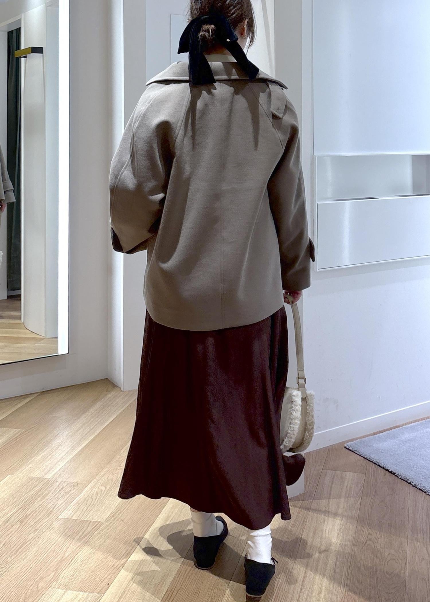 落ち感があり、ボリュームが出過ぎない形なのでスッキリ着られます。 -