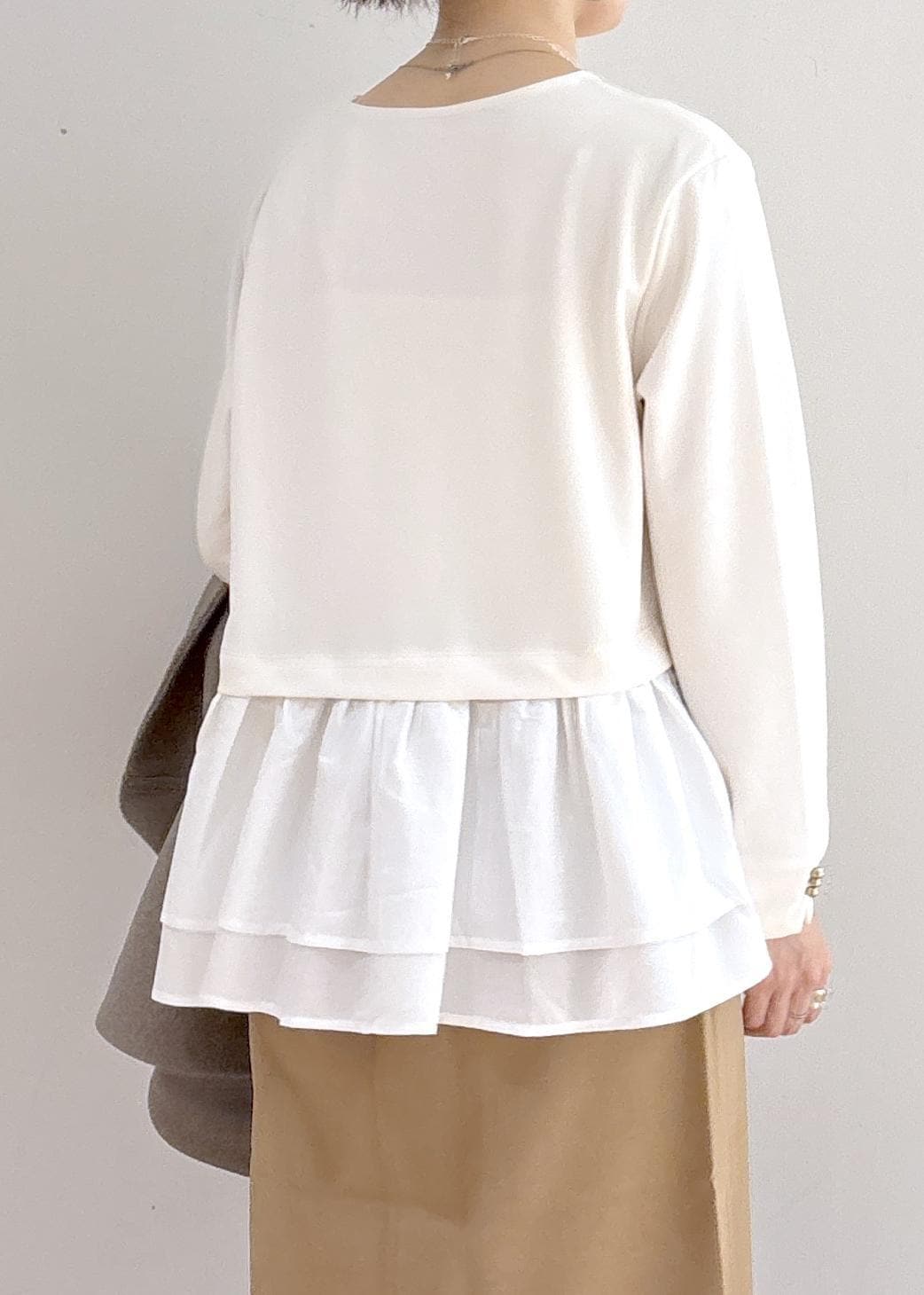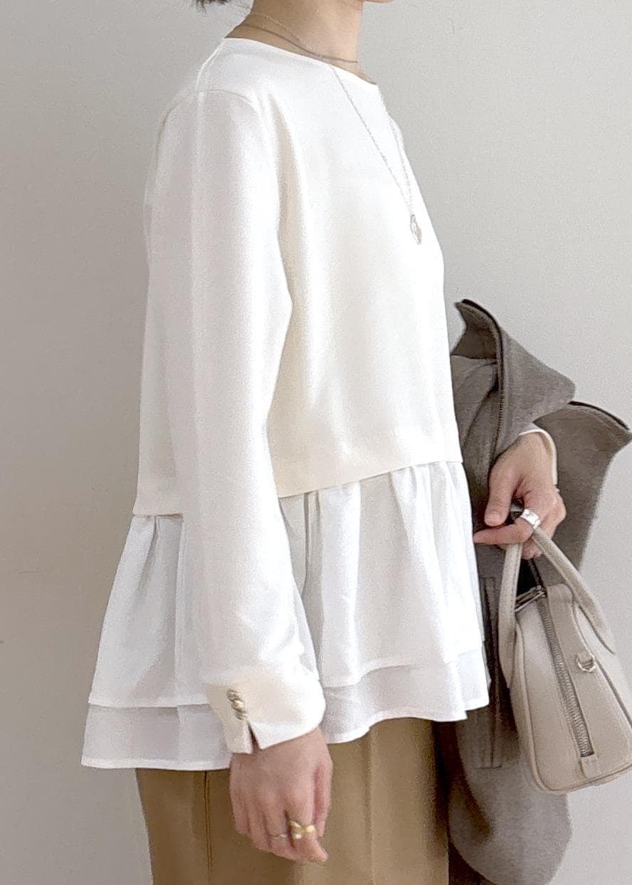 ROPÉ PICNIC布帛ドッキングペプラムギャザープルオーバーオフホワイト / S¥4,499レビュー一枚で映えるトップスです。オフホワイトは若干ですが透ける素材です。インナーはホワイト系を合わせると綺麗かと思います。ヒップラインに少しかかる丈です。