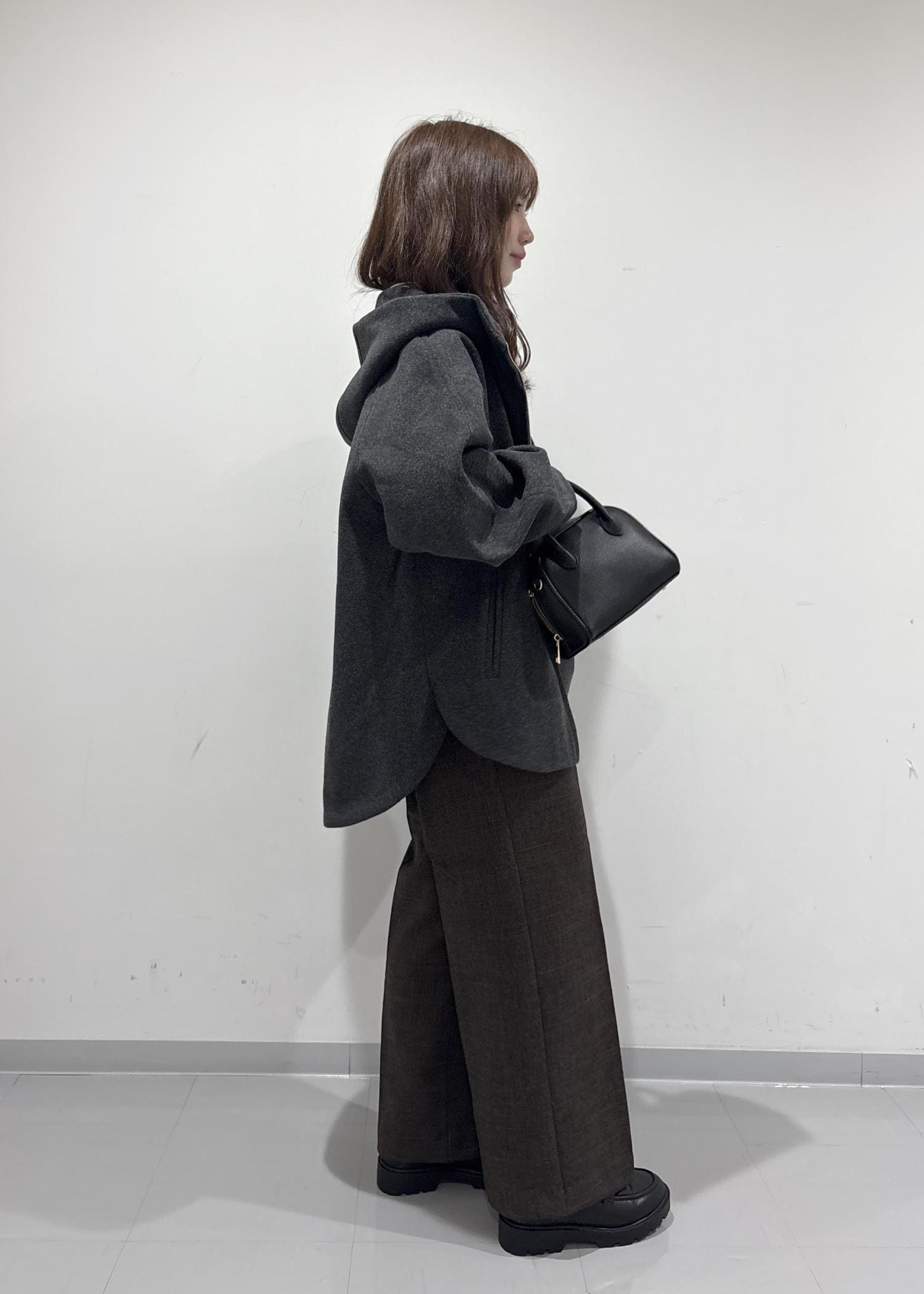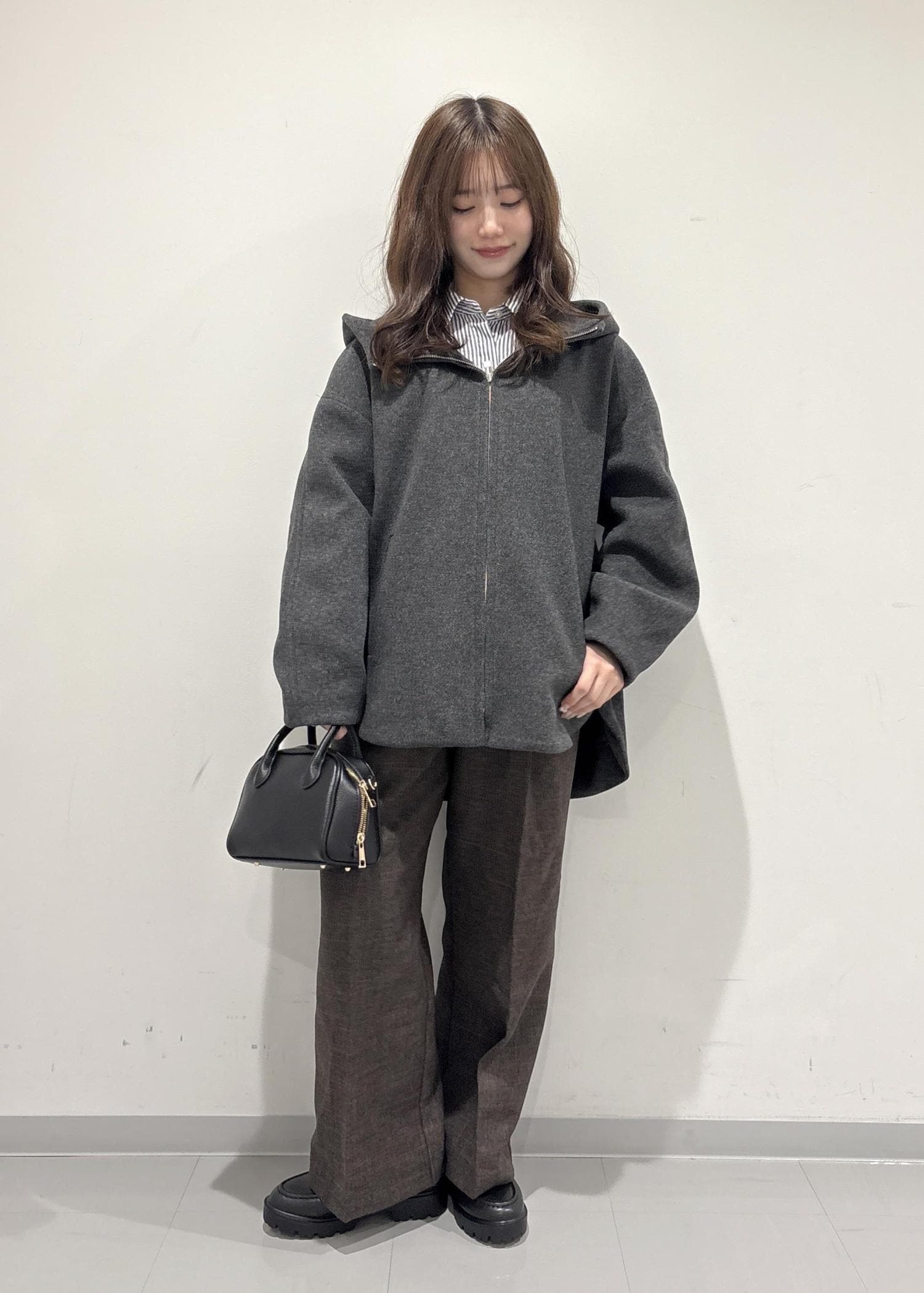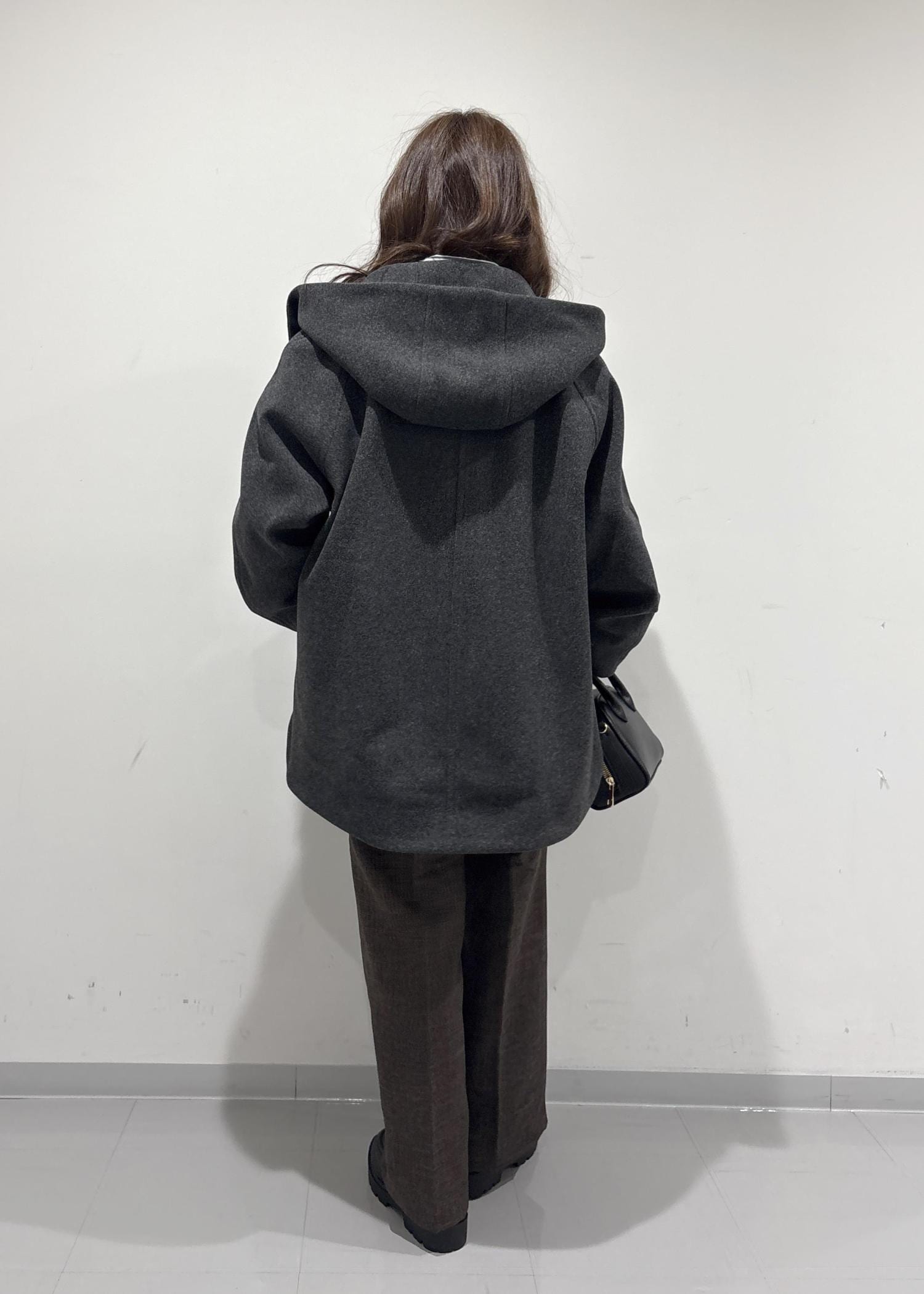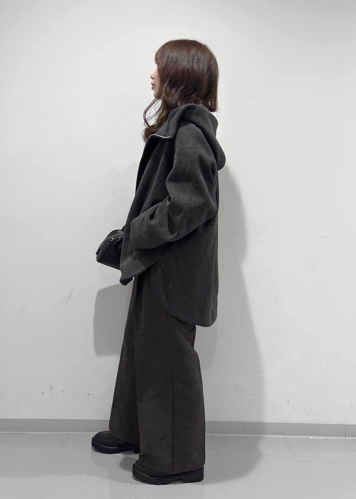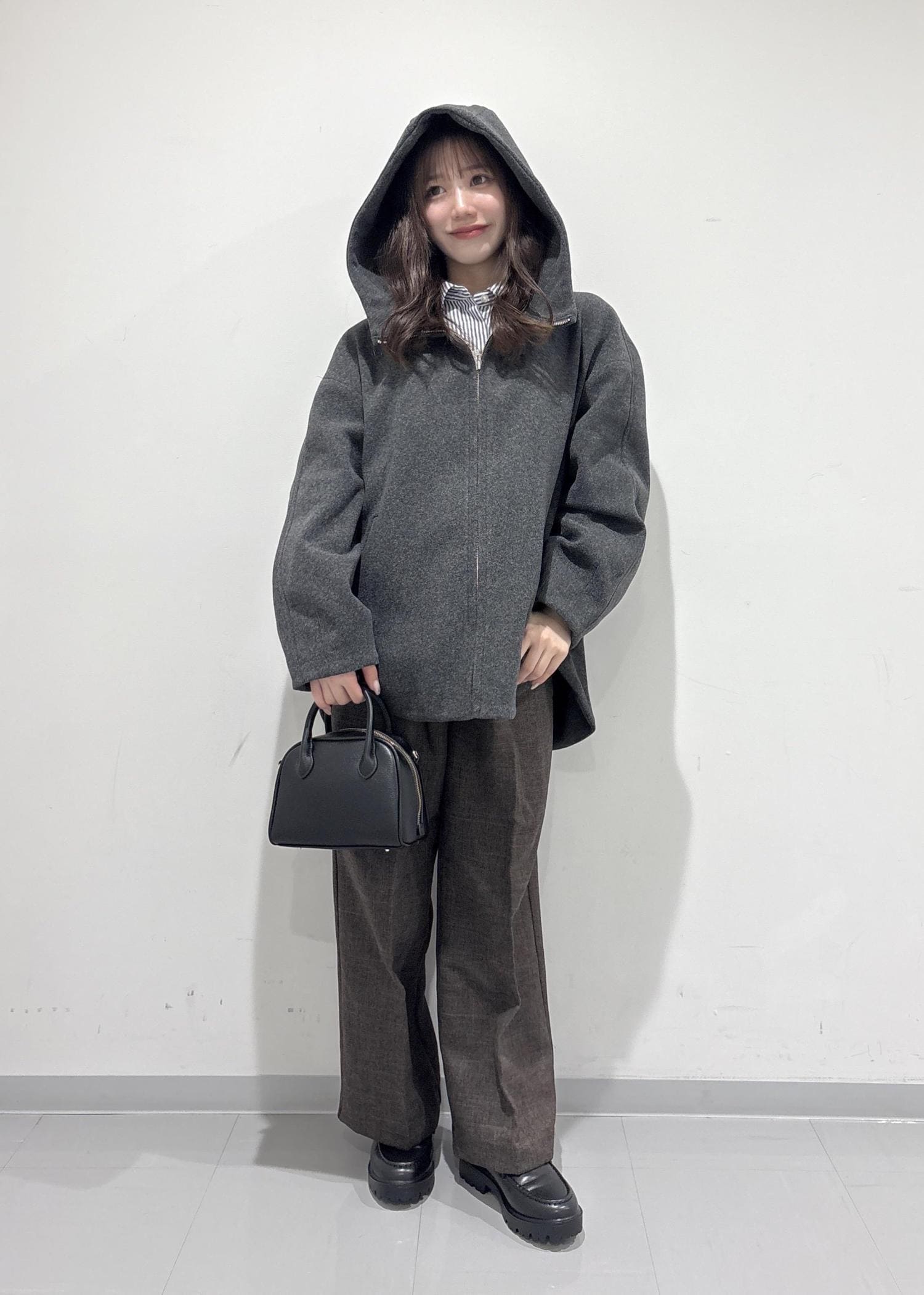こちらのコーデのポイントは、大きなフード付きのコートです!ファスナーを閉じても開けても着れるので今の少し寒くなった時期にピッタリです!メンズ受けも◎