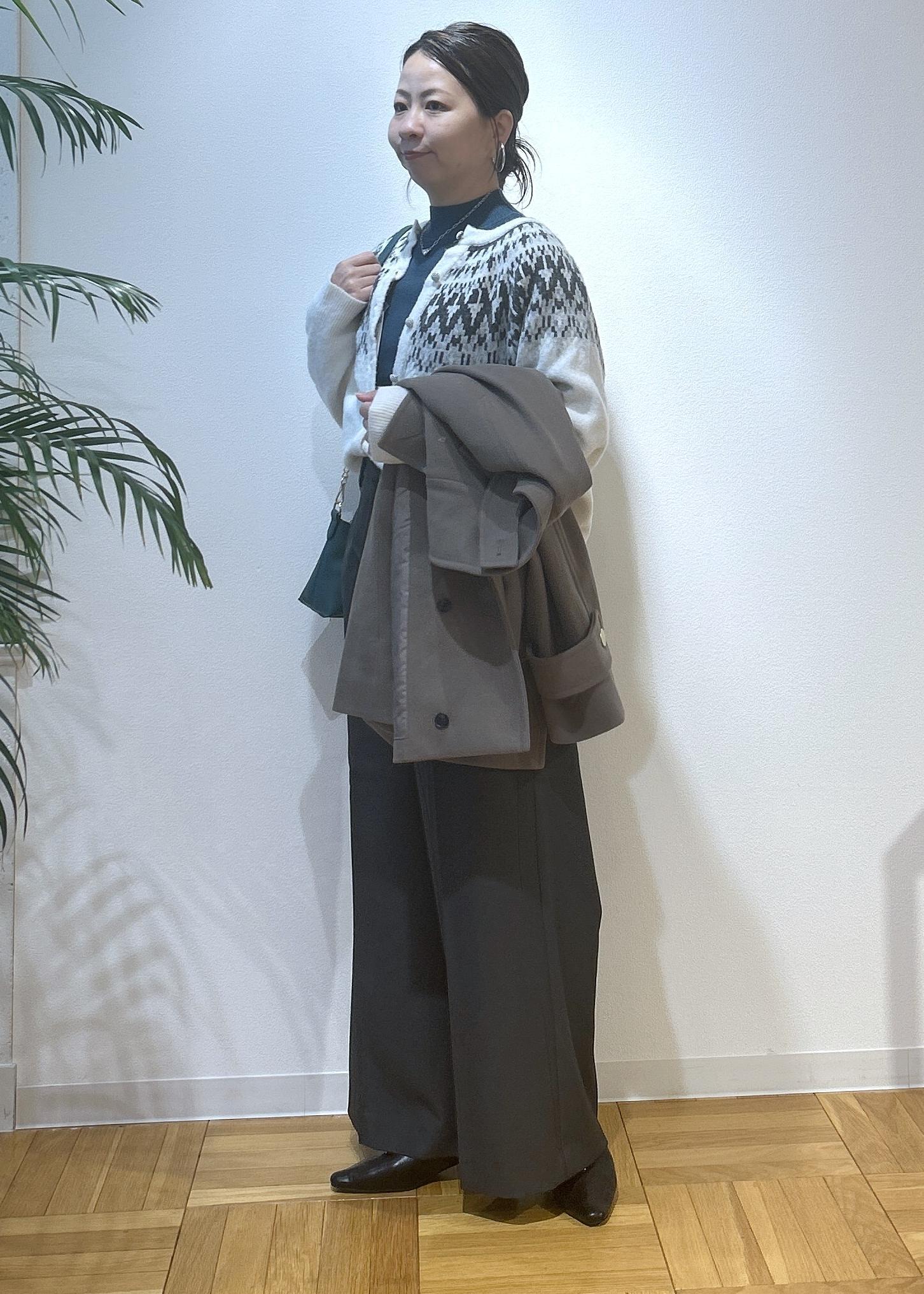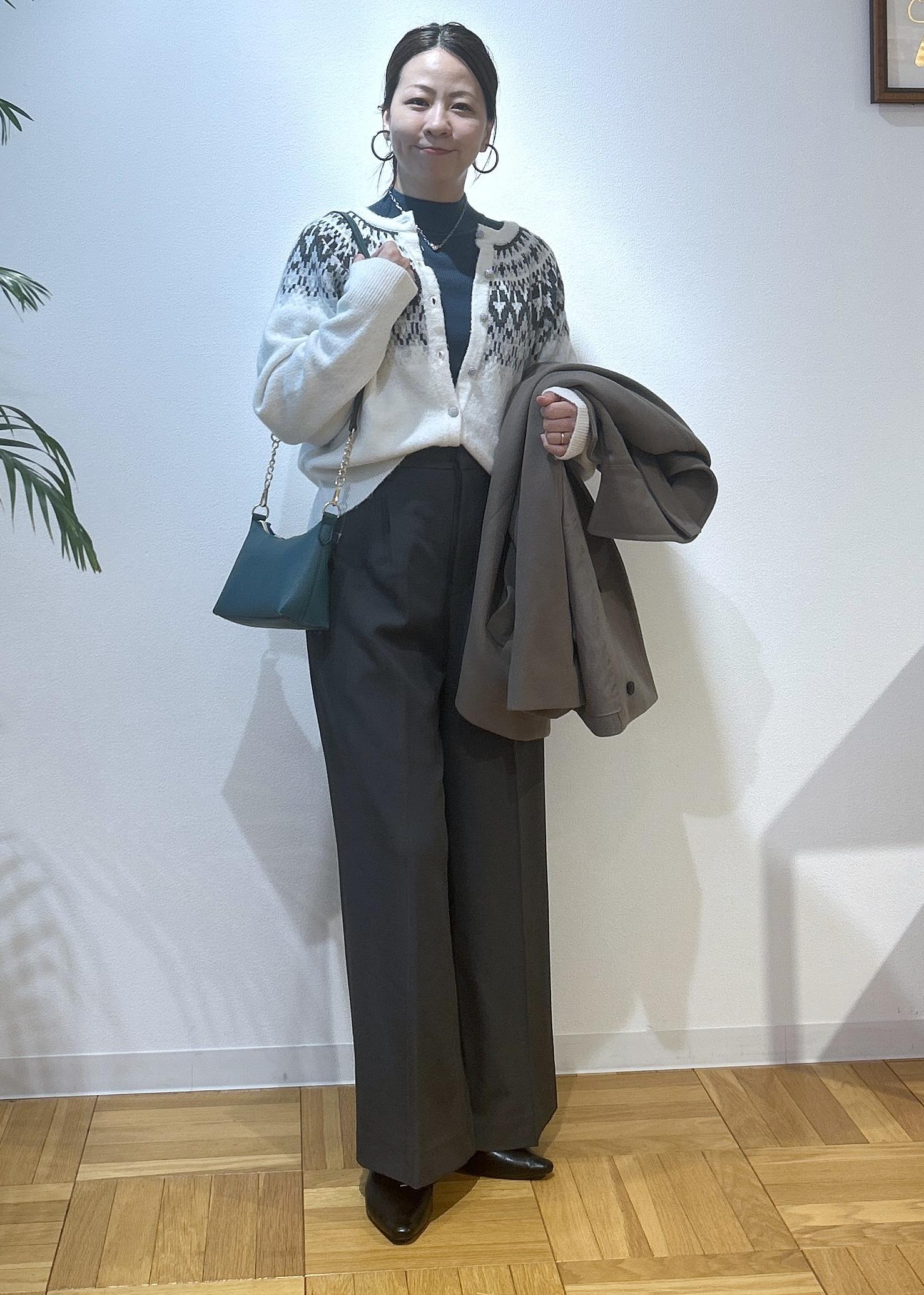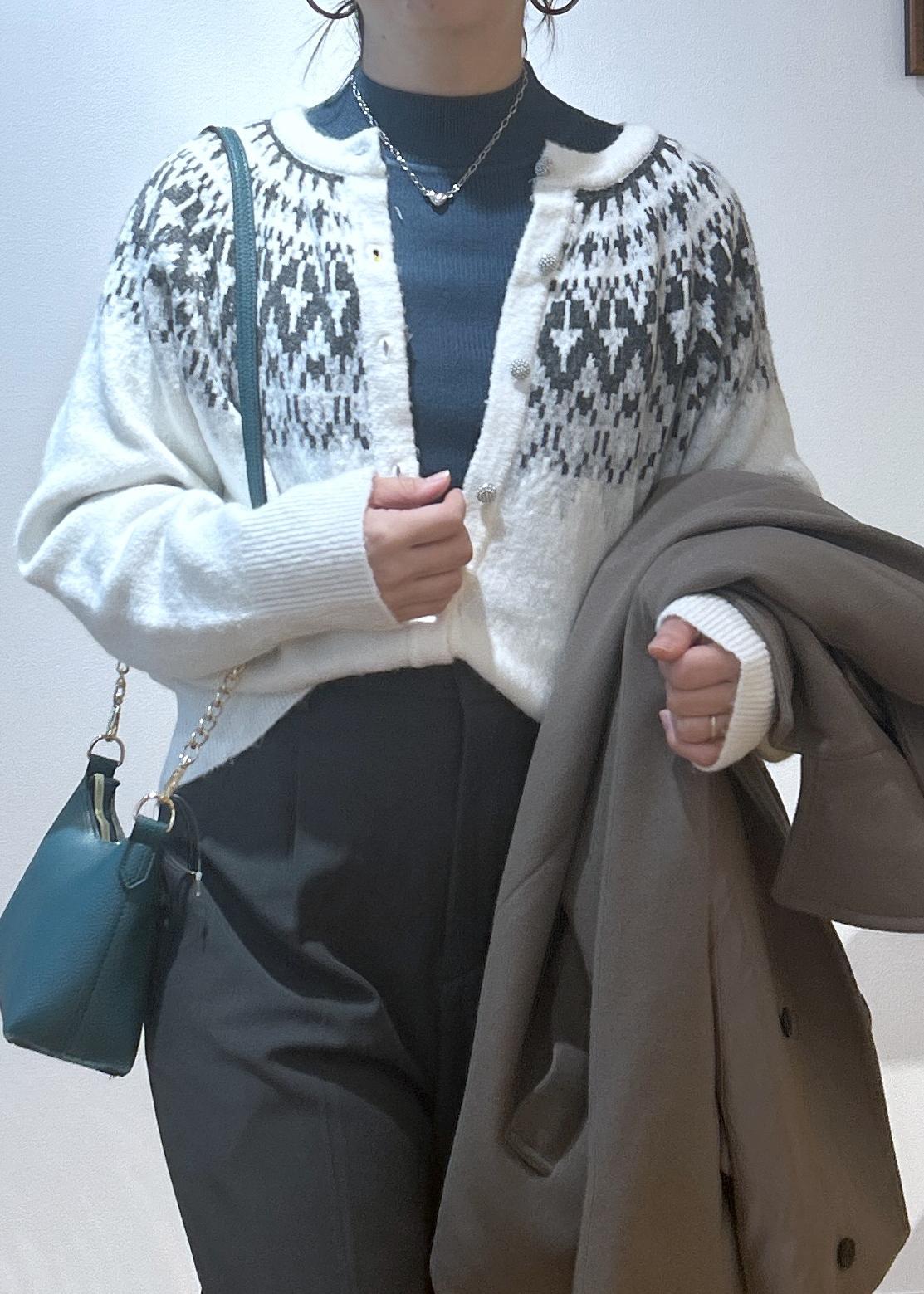 冬になるとノルディック柄が着たくなりますよね。カジュアル過ぎない着こなしにしたので、大人っぽくノルディック柄を楽しみたい方にはおすすめのコーディネートです。