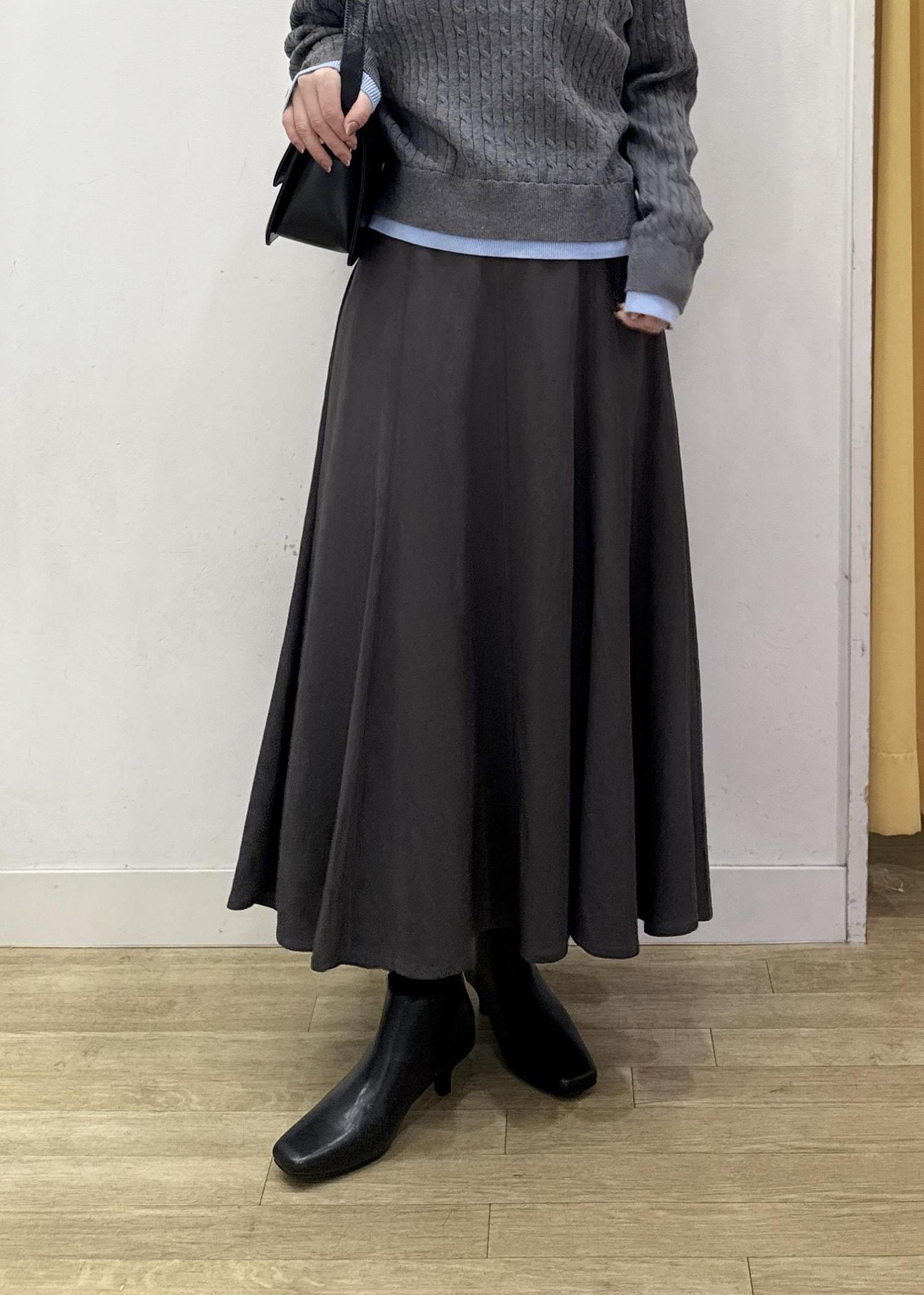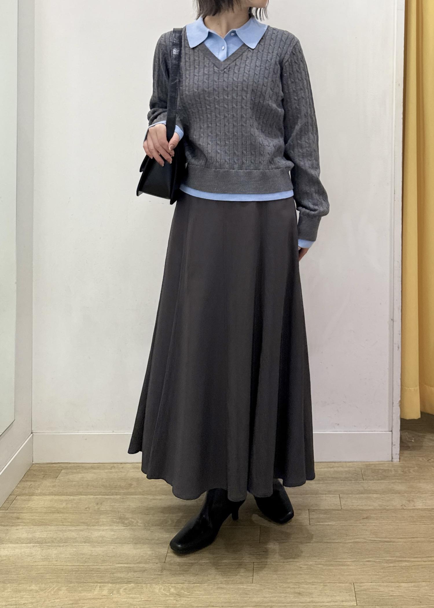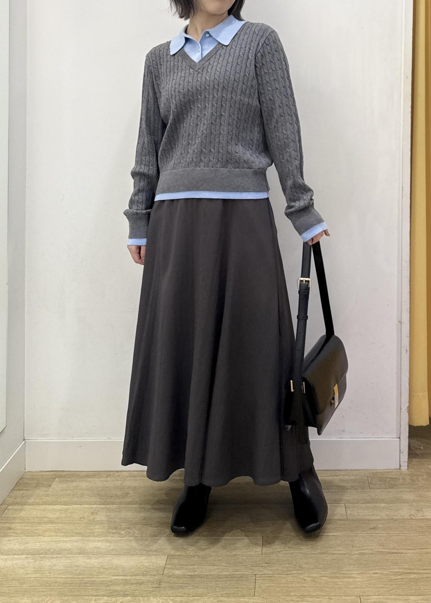 グレーカラーのニットとスカートを合わせたワントーンコーディネート!