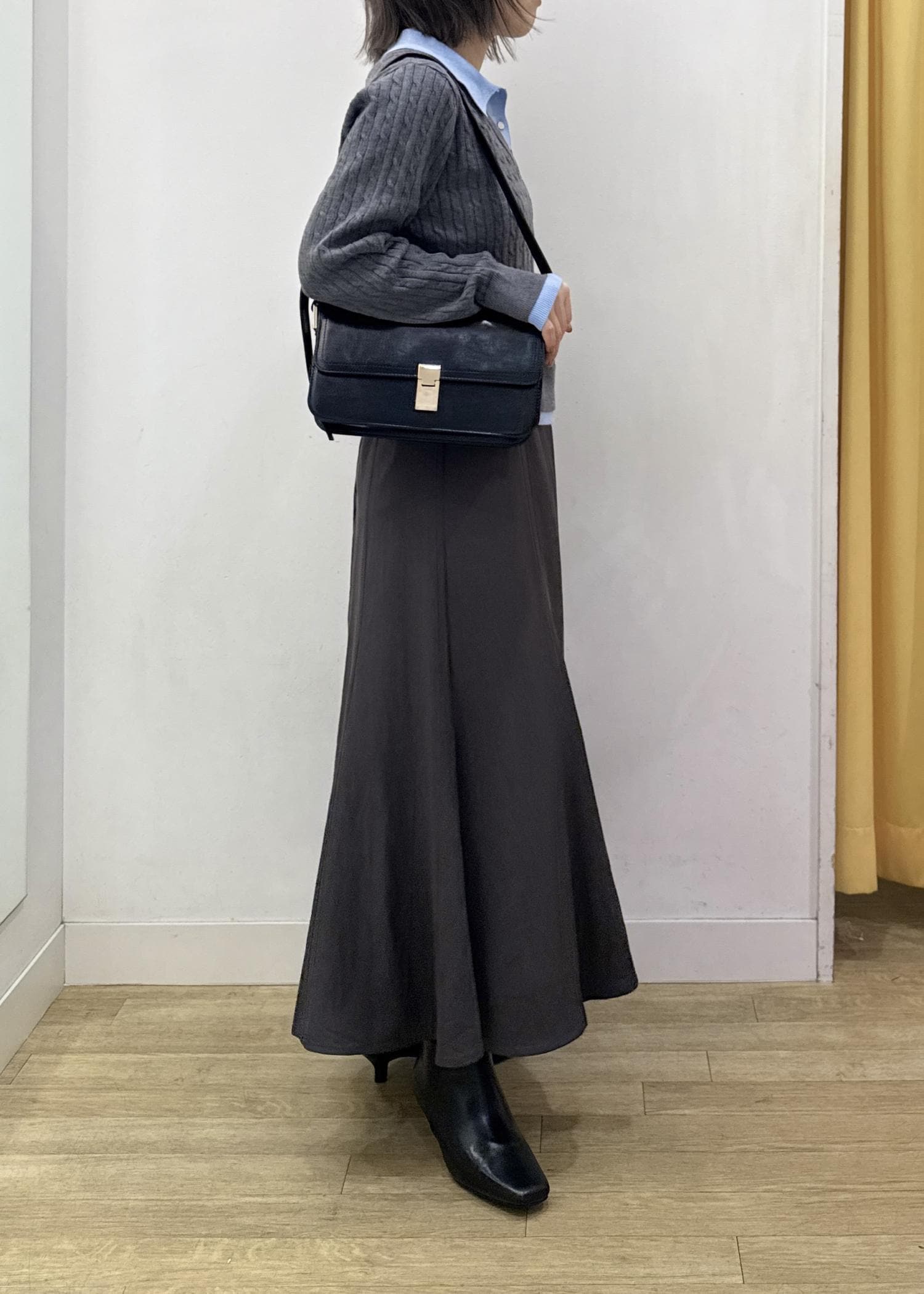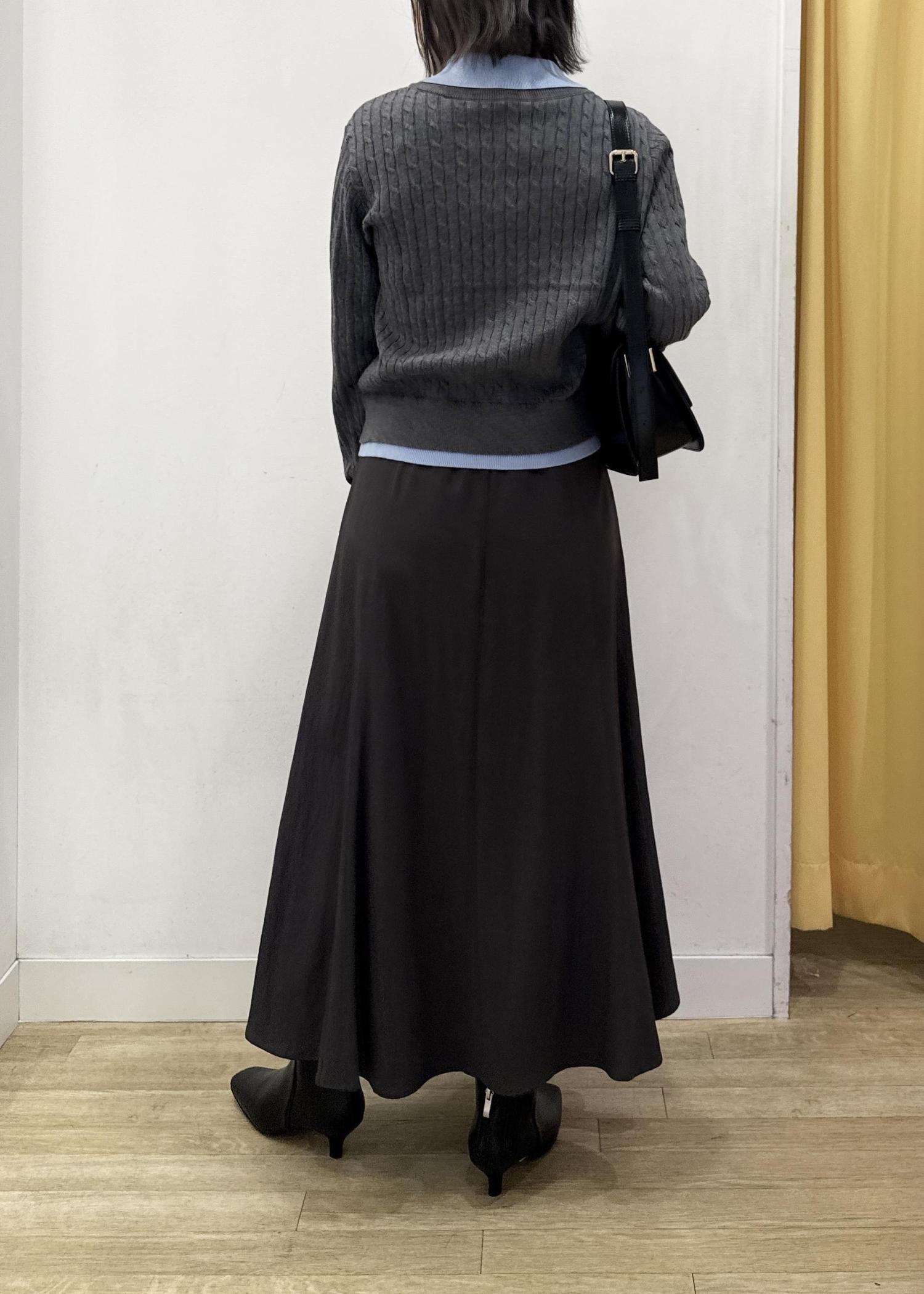 足首が見えるぐらいの着丈で、マーメイドシルエットですが柔らかい素材感で程よく落ち感があります。