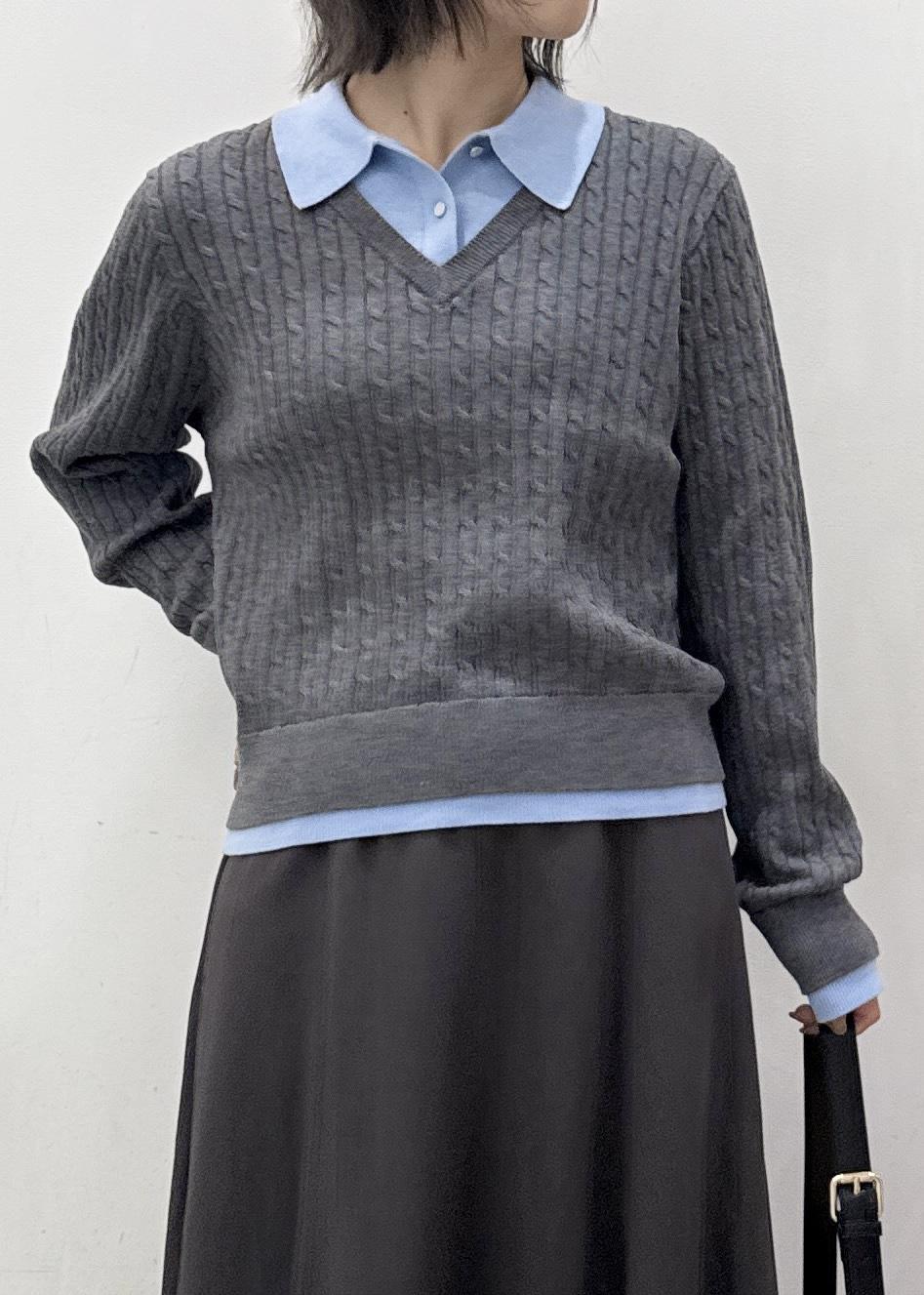 重ね着風のニットのサックスカラーがコーディネートのアクセントに☺︎