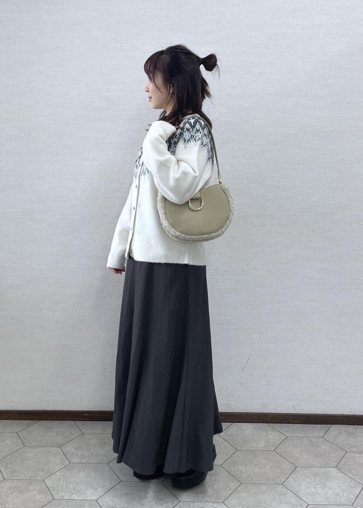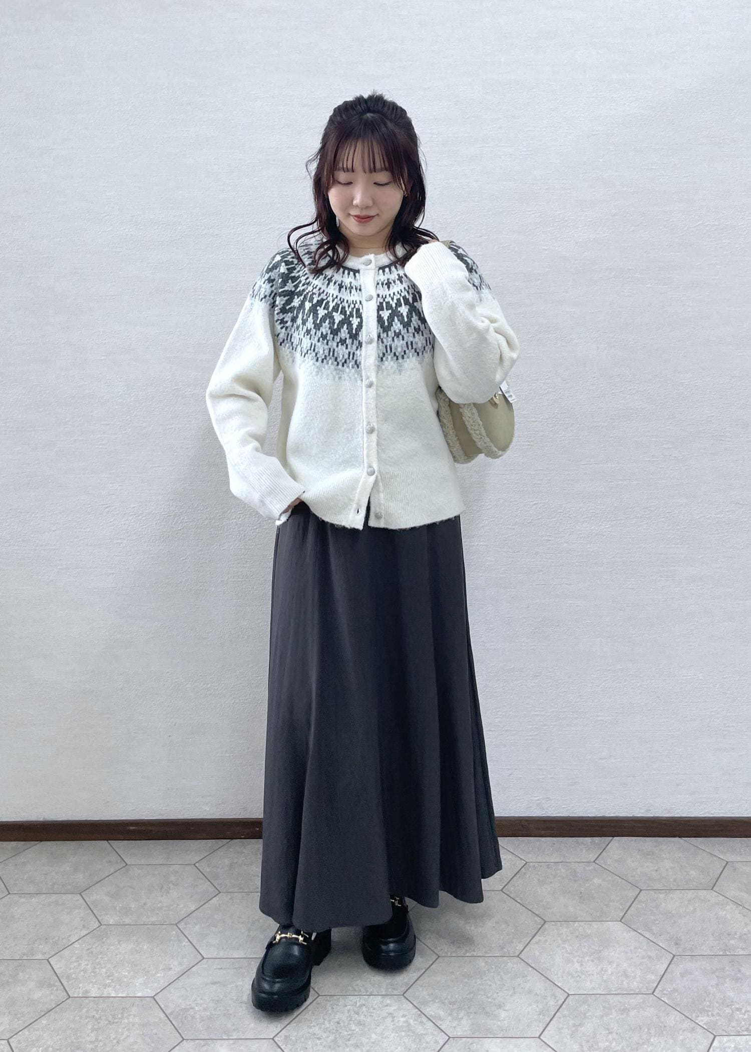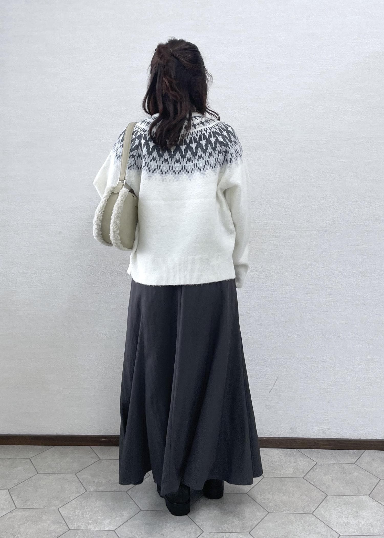 ノルディック柄のニットは、着るだけで一気に季節感を取り入れられます!スカートと合わせて可愛らしいコーデにしました!コートを羽織れば冬でも着れちゃいます!
