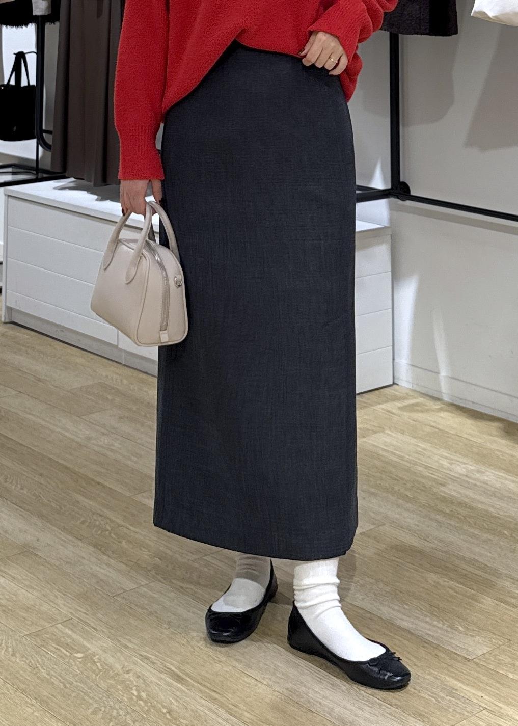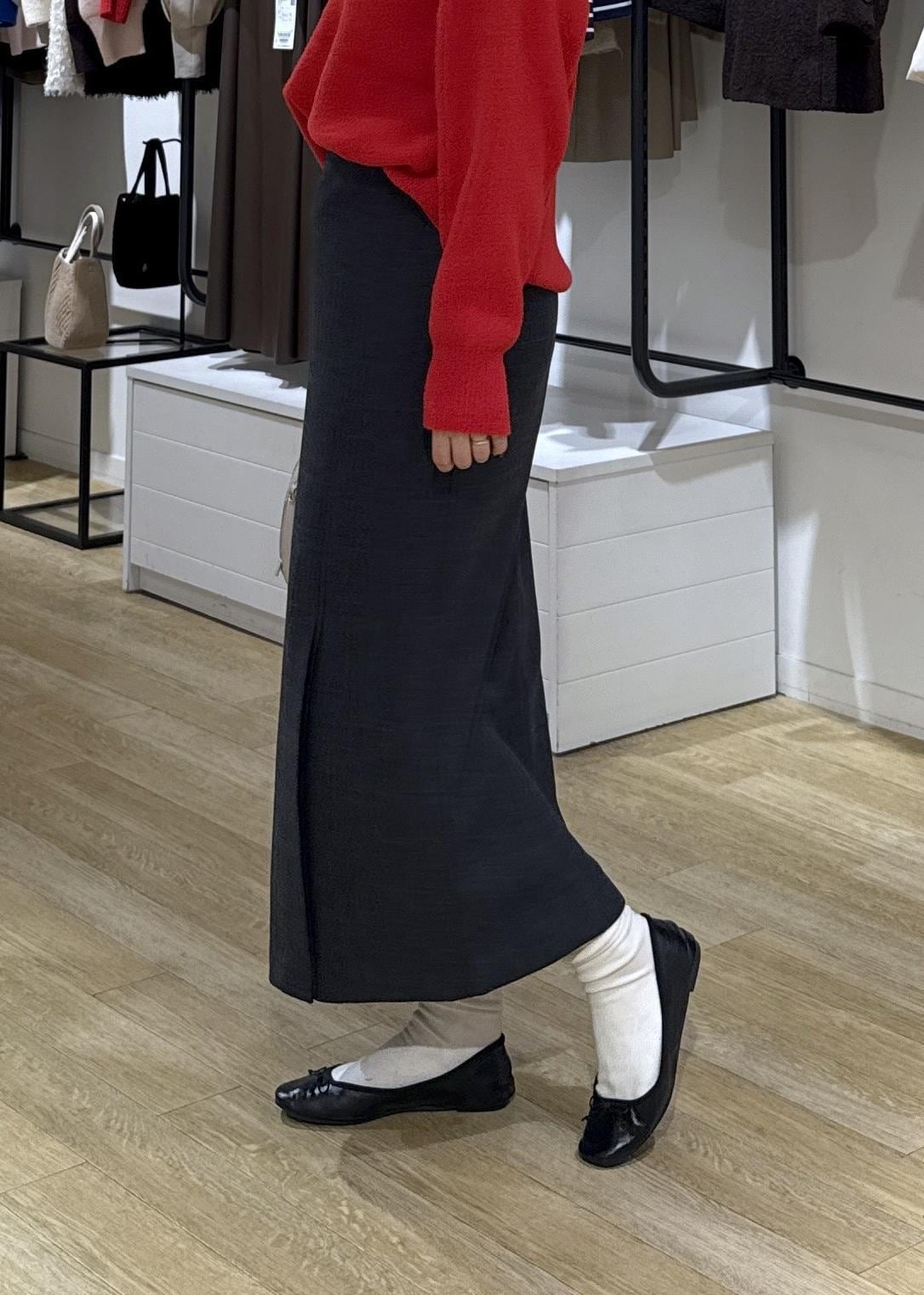 着丈が脛が隠れる長さで、Iラインで腰回りが細身のサイズ感だったのでSだと窮屈感があり、Mサイズでちょうどよかったです。伸縮性はありませんが、前スリットで足捌きもしやすく、ポケットもついてます。