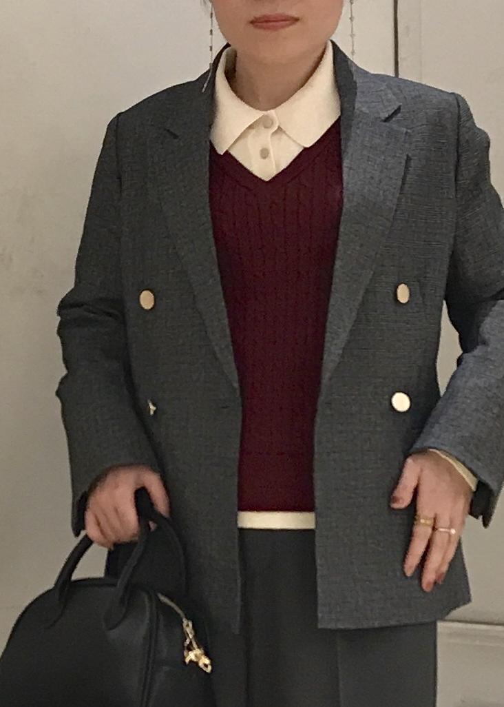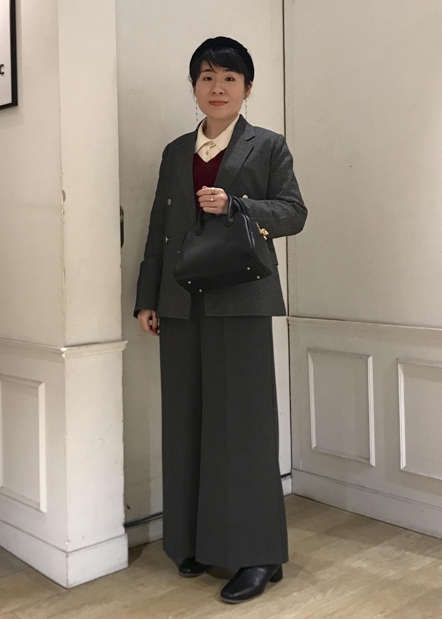 深みのある赤とグリーンで季節感な色合いとモノトーンの細かいチェック柄ジャケットでカラーをまとめました。重ね着風のトップスとテーラードジャケットを合わせる事でレイヤードスタイルを意識しました。