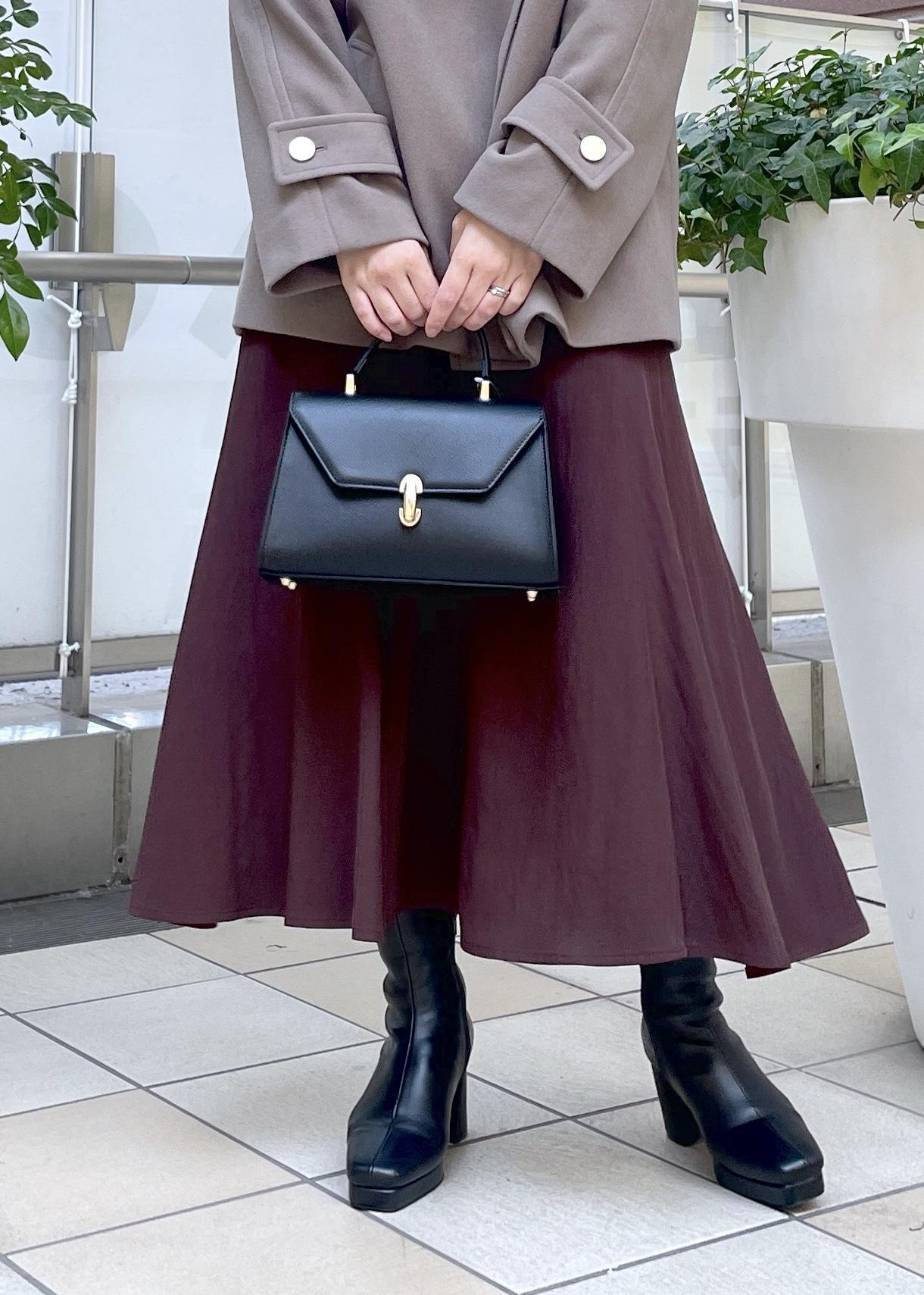 小物はブラックで揃えてより大人っぽい印象のコーディネートにしました。チェックのストールはポイントとして手元に。