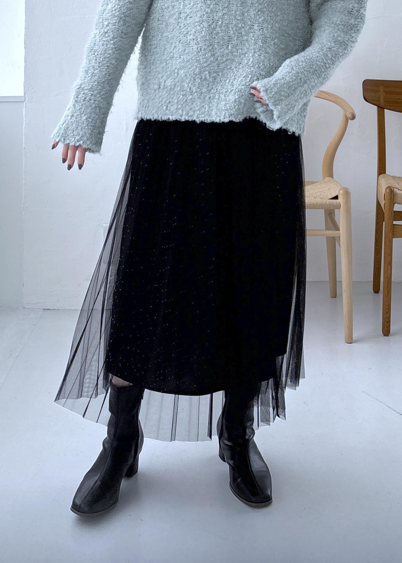 ROPÉ PICNICキラキラチュールプリーツスカート/着丈が選べるブラック / MT¥6,490レビューふわっと軽くて柔らかな着心地でした。プリーツ加工されているので広がり感を抑えられて履くことができました。裏地付きで透ける心配がなかったです。