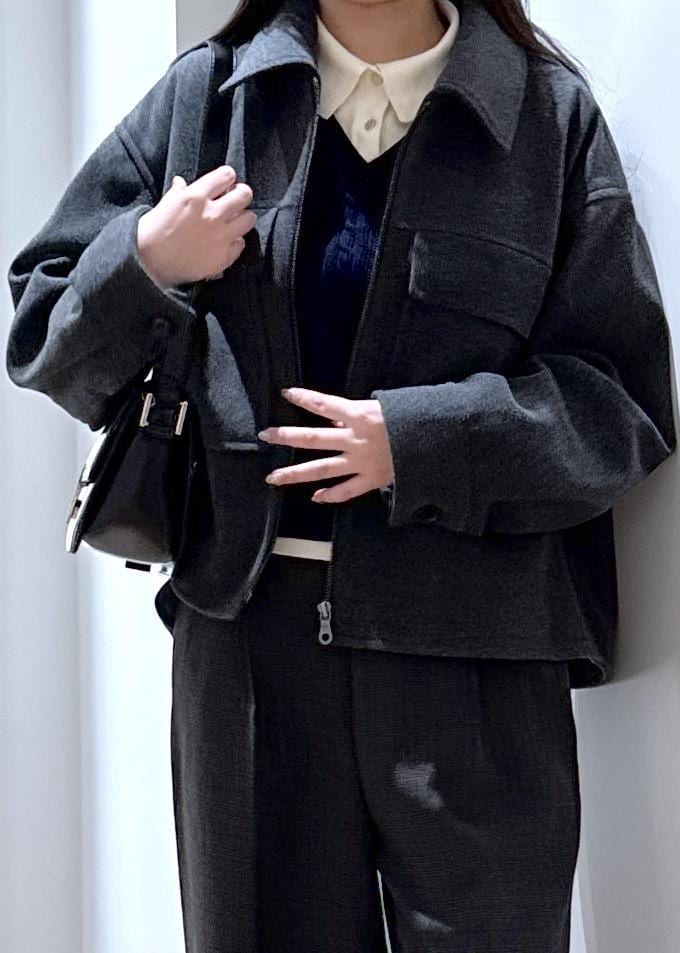ROPÉ PICNICジャージーメルトンシリーズ ポケット付きジップブルゾン/リンクコーデチャコール / F¥9,999レビューショート丈で、どのボトムともバランスのとりやすいアウターです。
