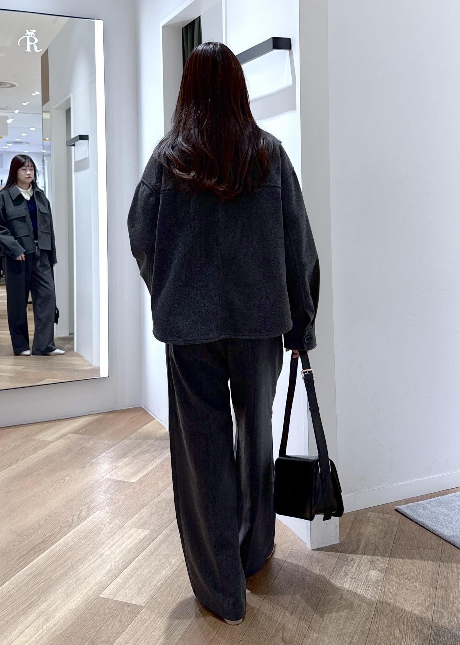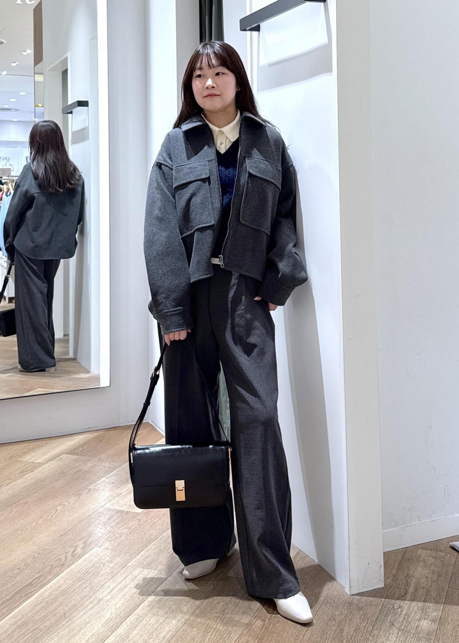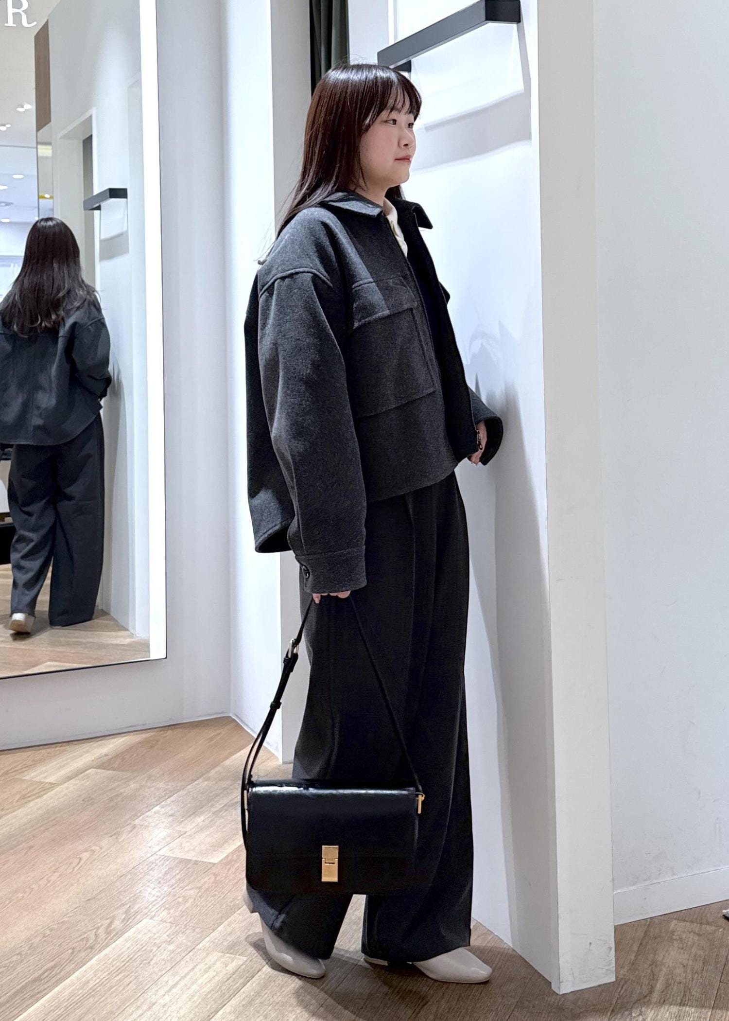 アウターの濃いめグレーに似ている色味のボトムを合わせ、セットアップ風のコーディネートを組みました。