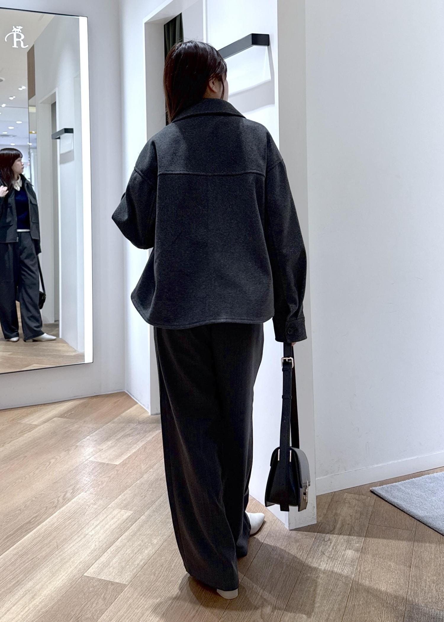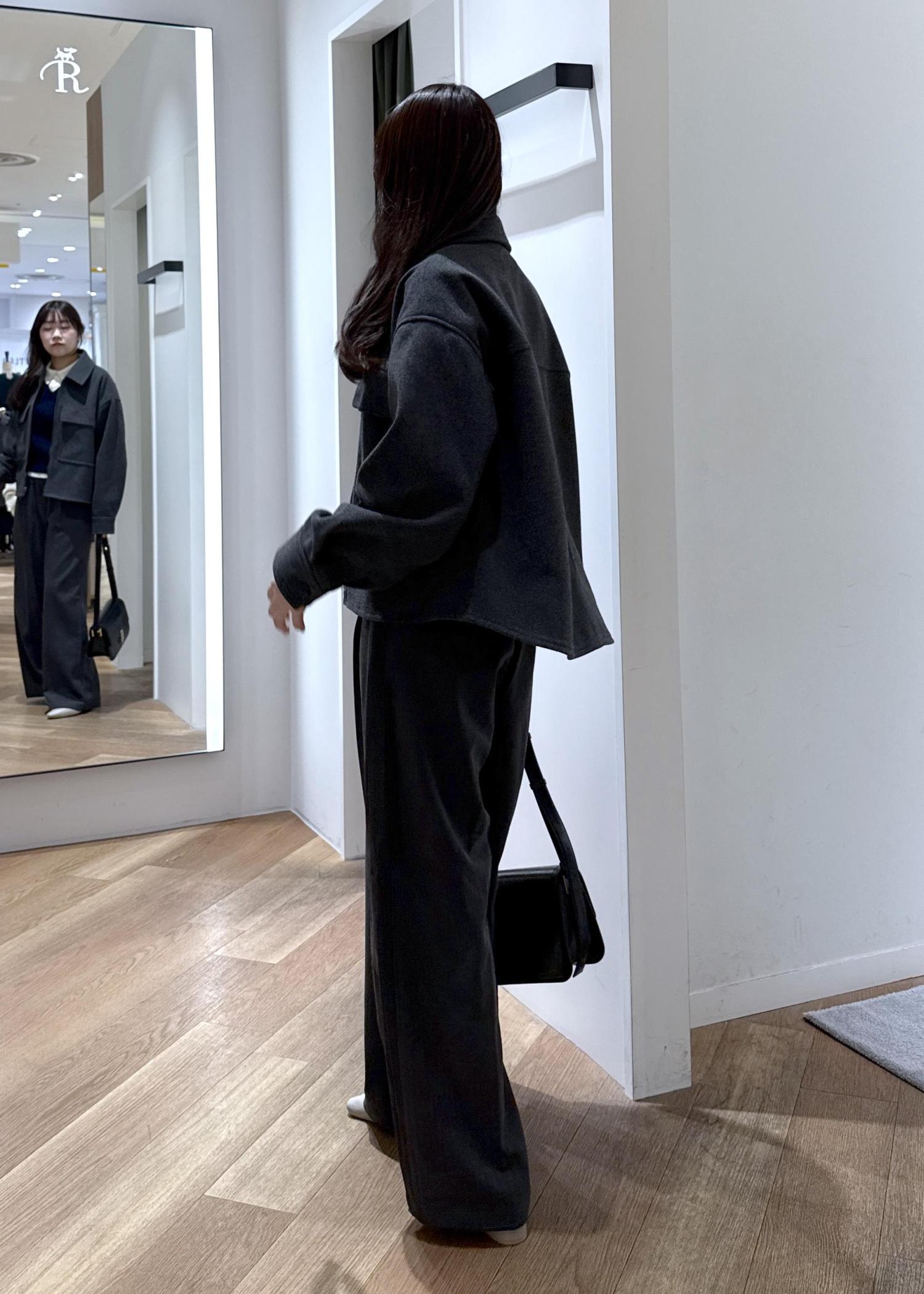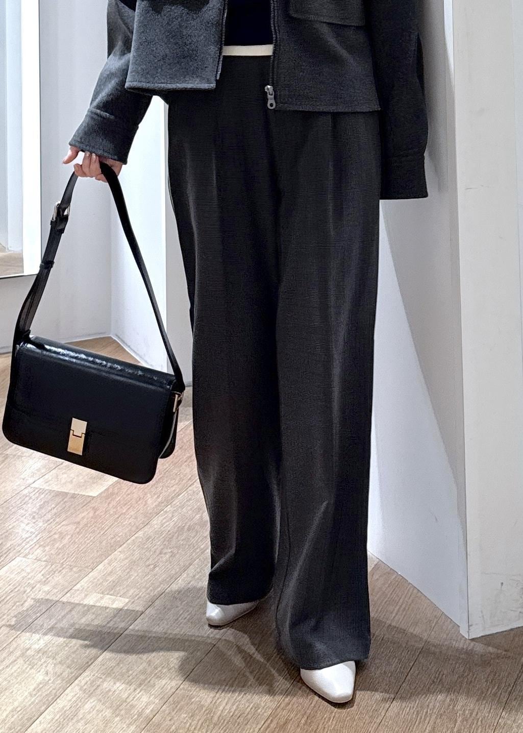 アウターの濃いめグレーに似ている色味のボトムを合わせ、セットアップ風のコーディネートを組みました。