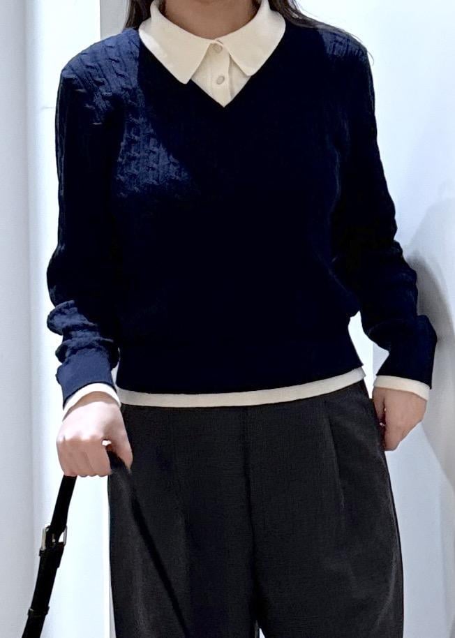 ネイビー(40)は、ネイビーのニットにクリーム色のシャツをレイヤードしているように見えるトップスで、顔周りが暗く見えないのが嬉しいポイント◎