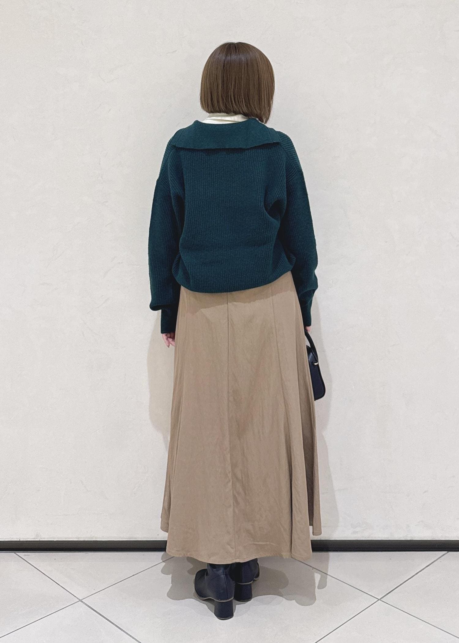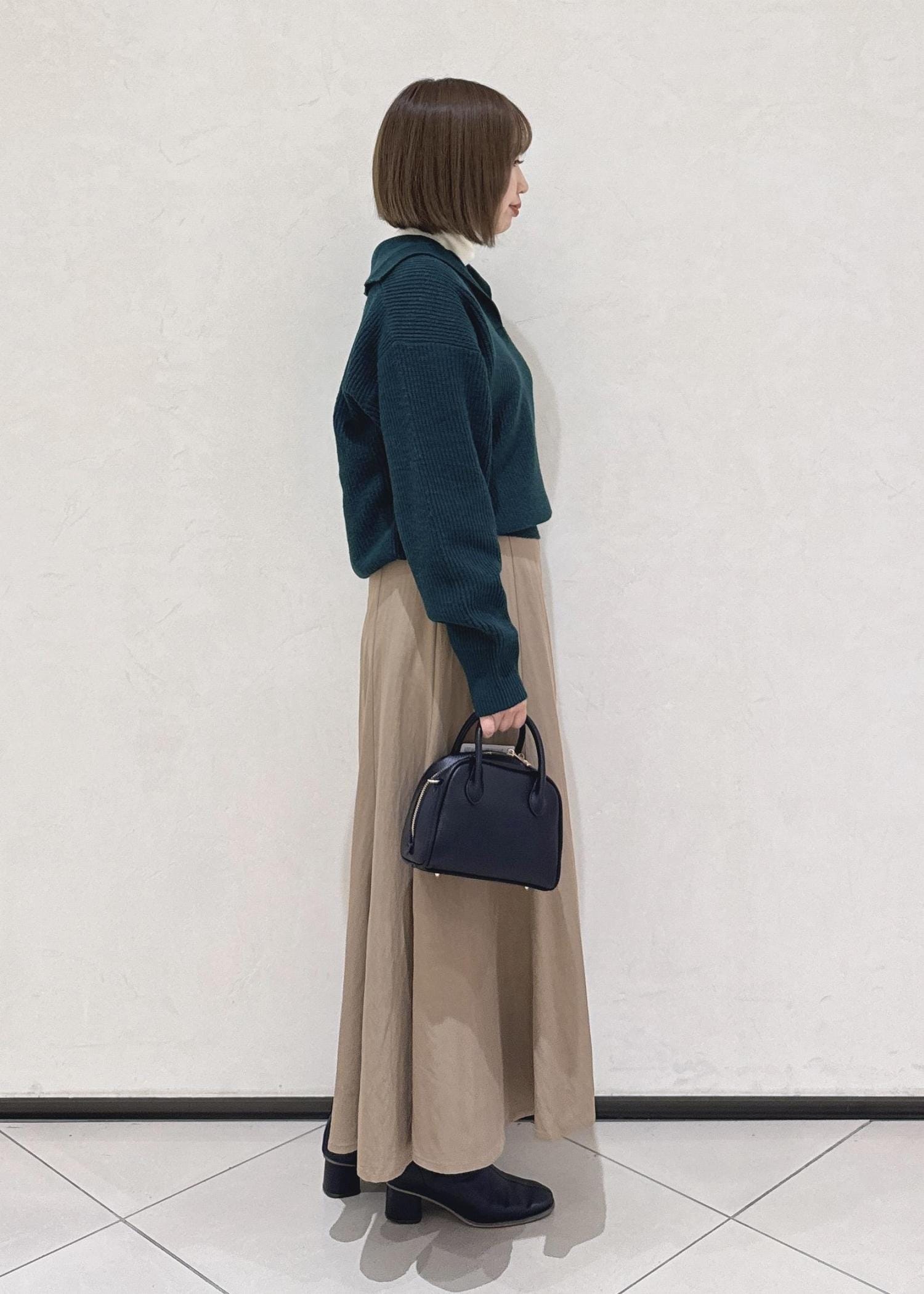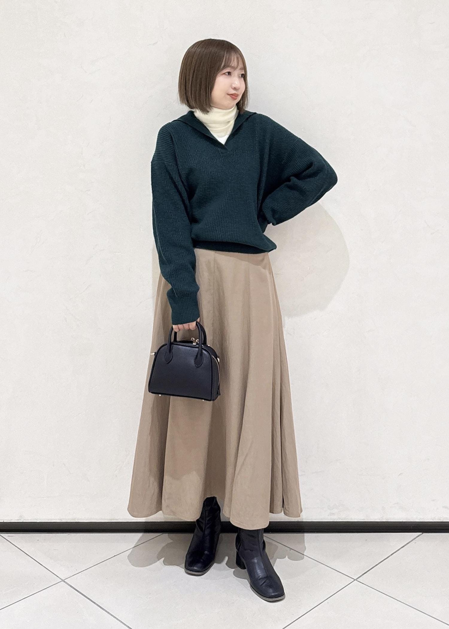 パキっとした綺麗なグリーンニットにベージュのスカートを合わせました。寒い時期でも着られるように中にタートルニットをインして、暖かいスタイルです。