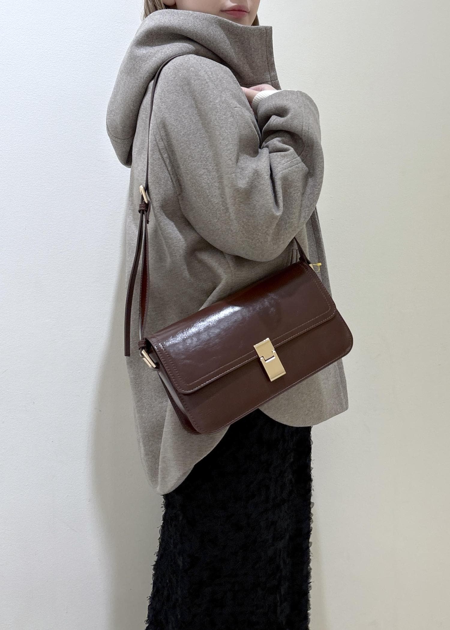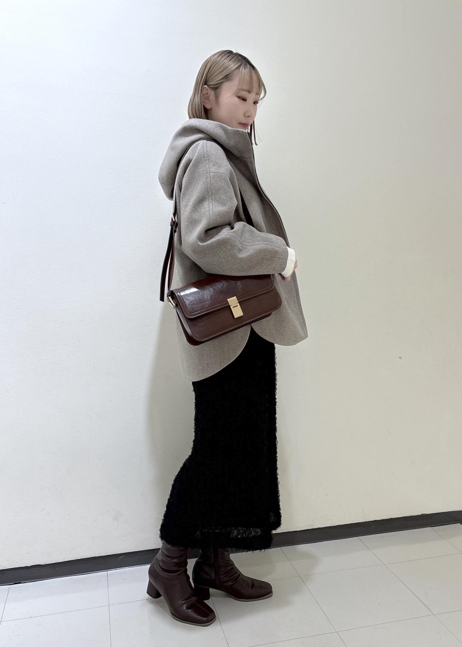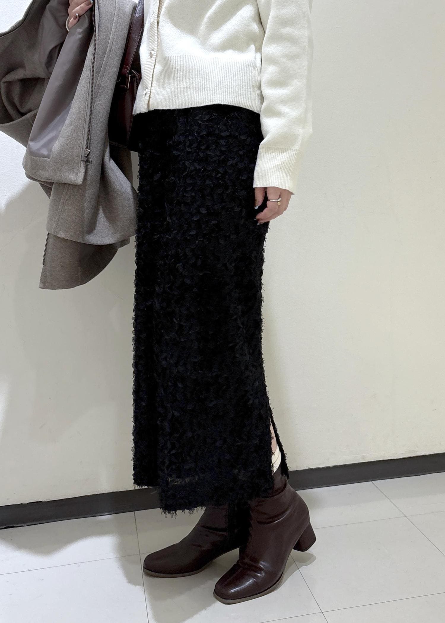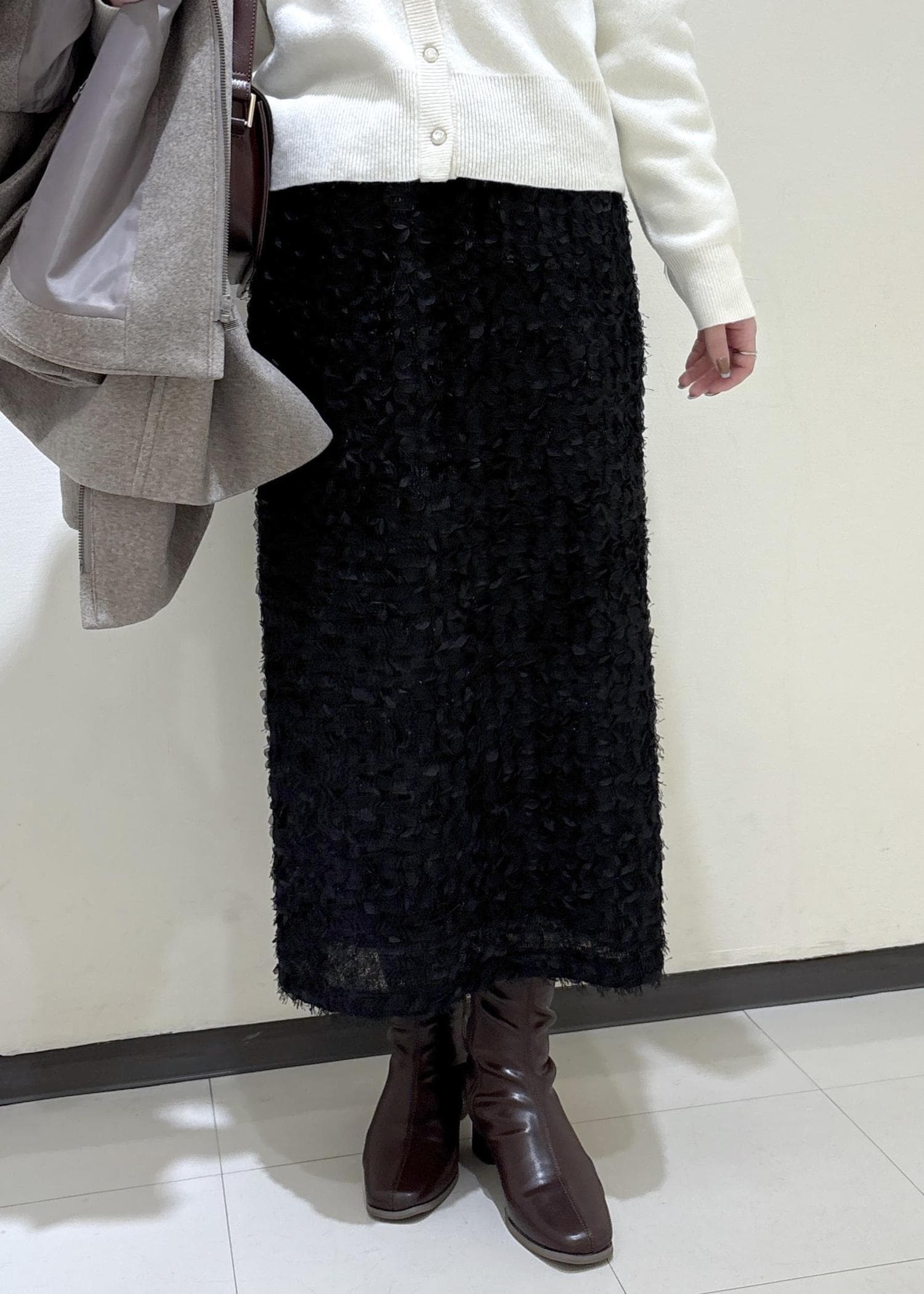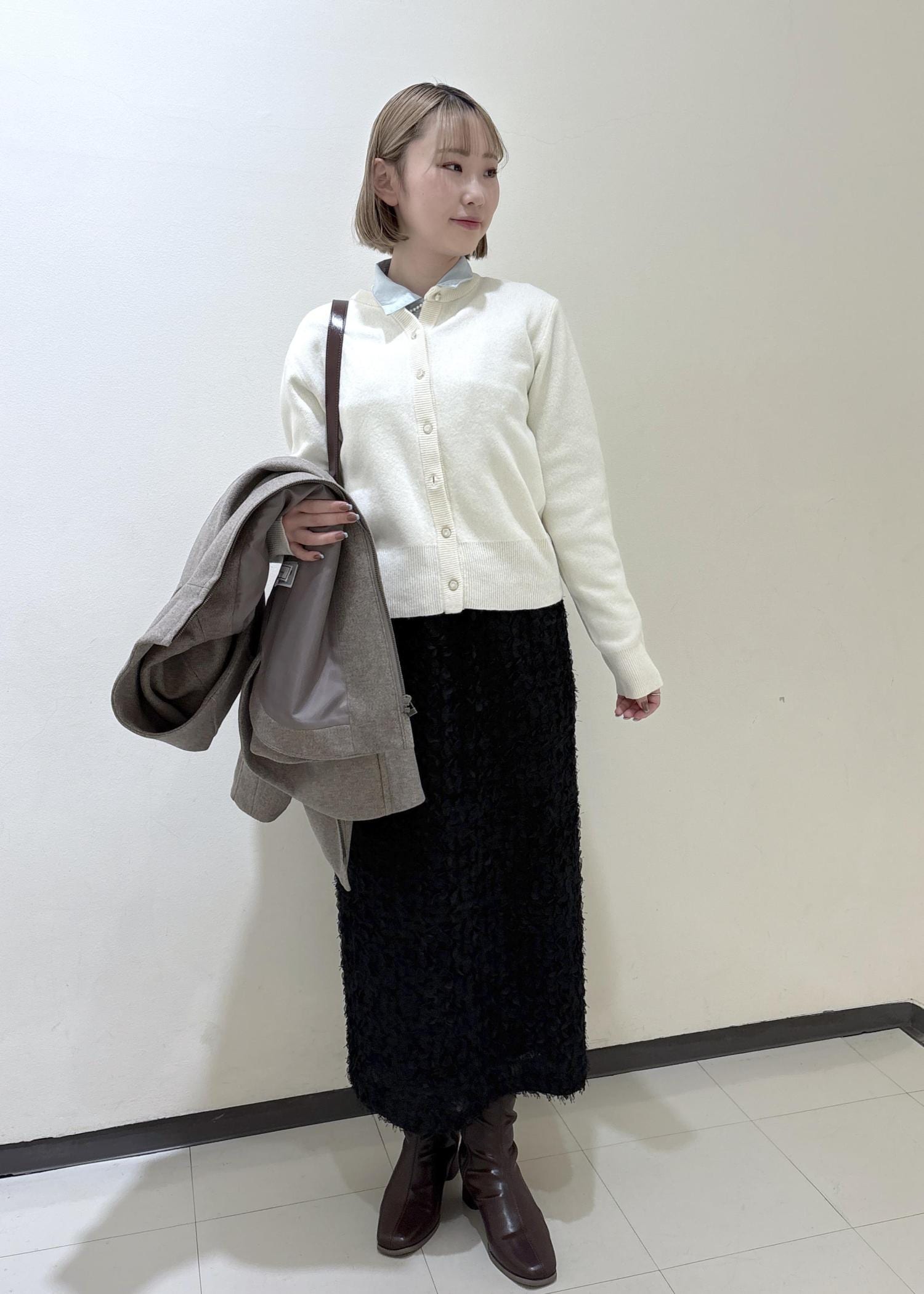 ブラウンやブラックでまとめ落ち着いた印象にし、オフホワイトのカーディガンがアクセントになるようにしました。