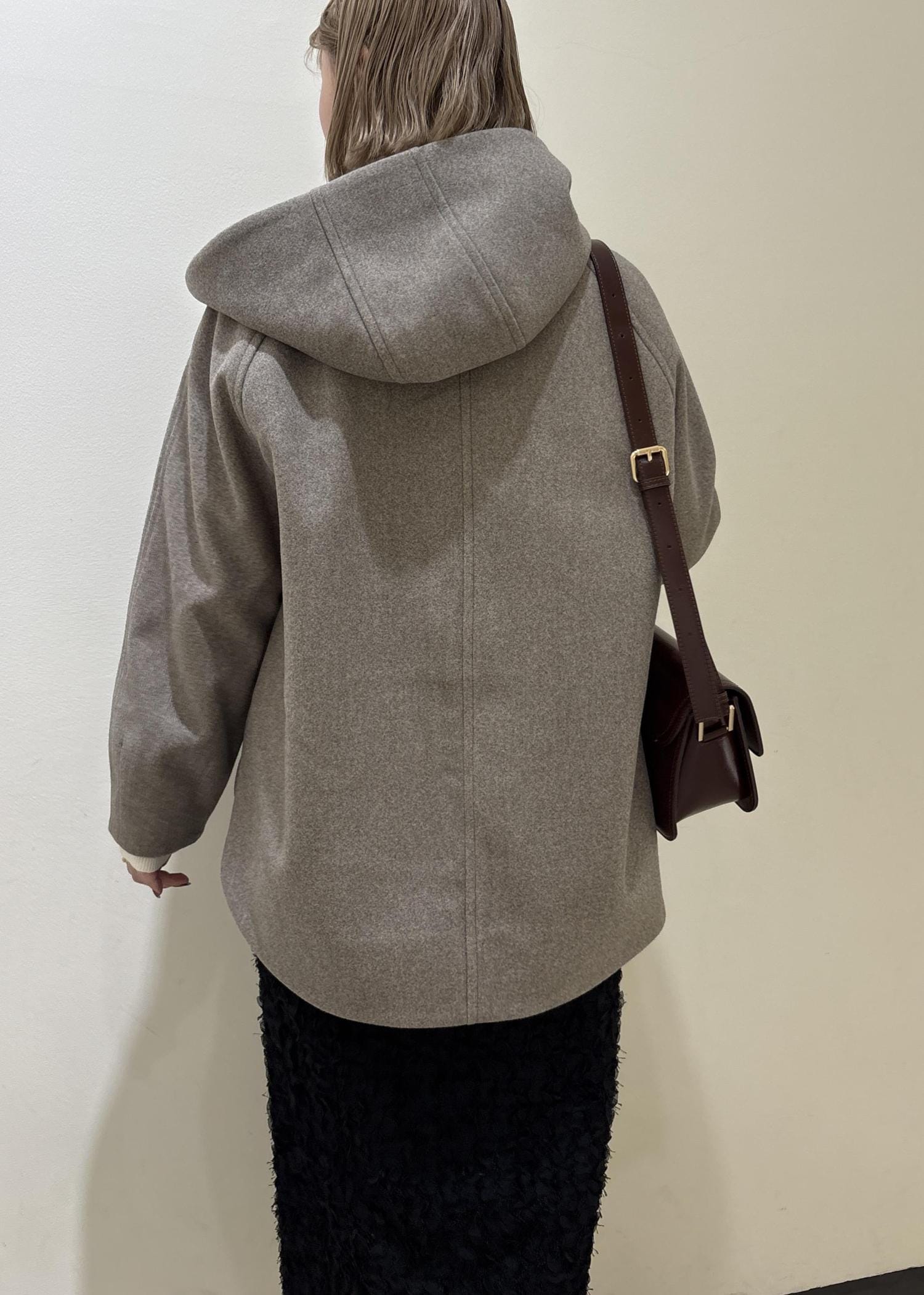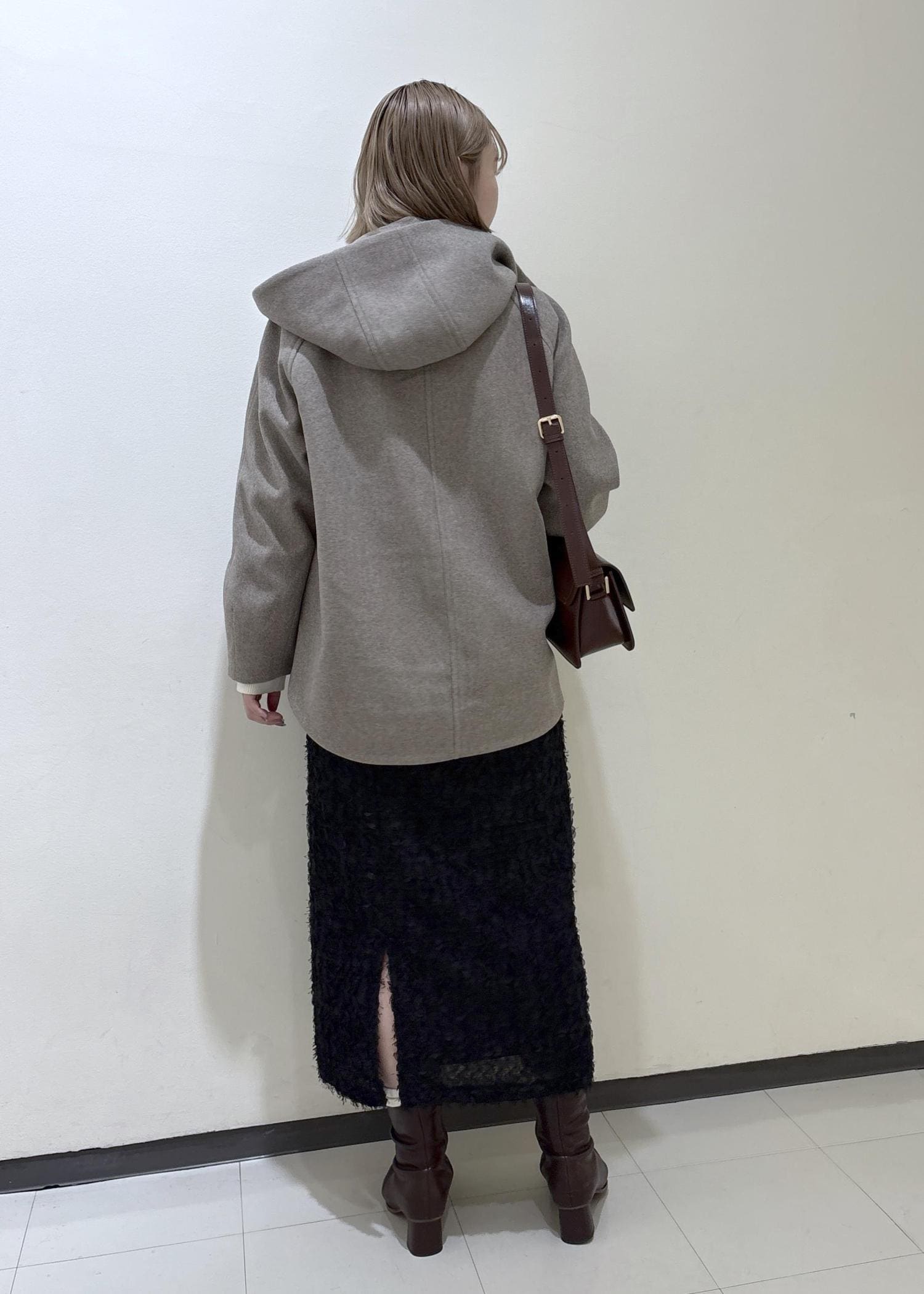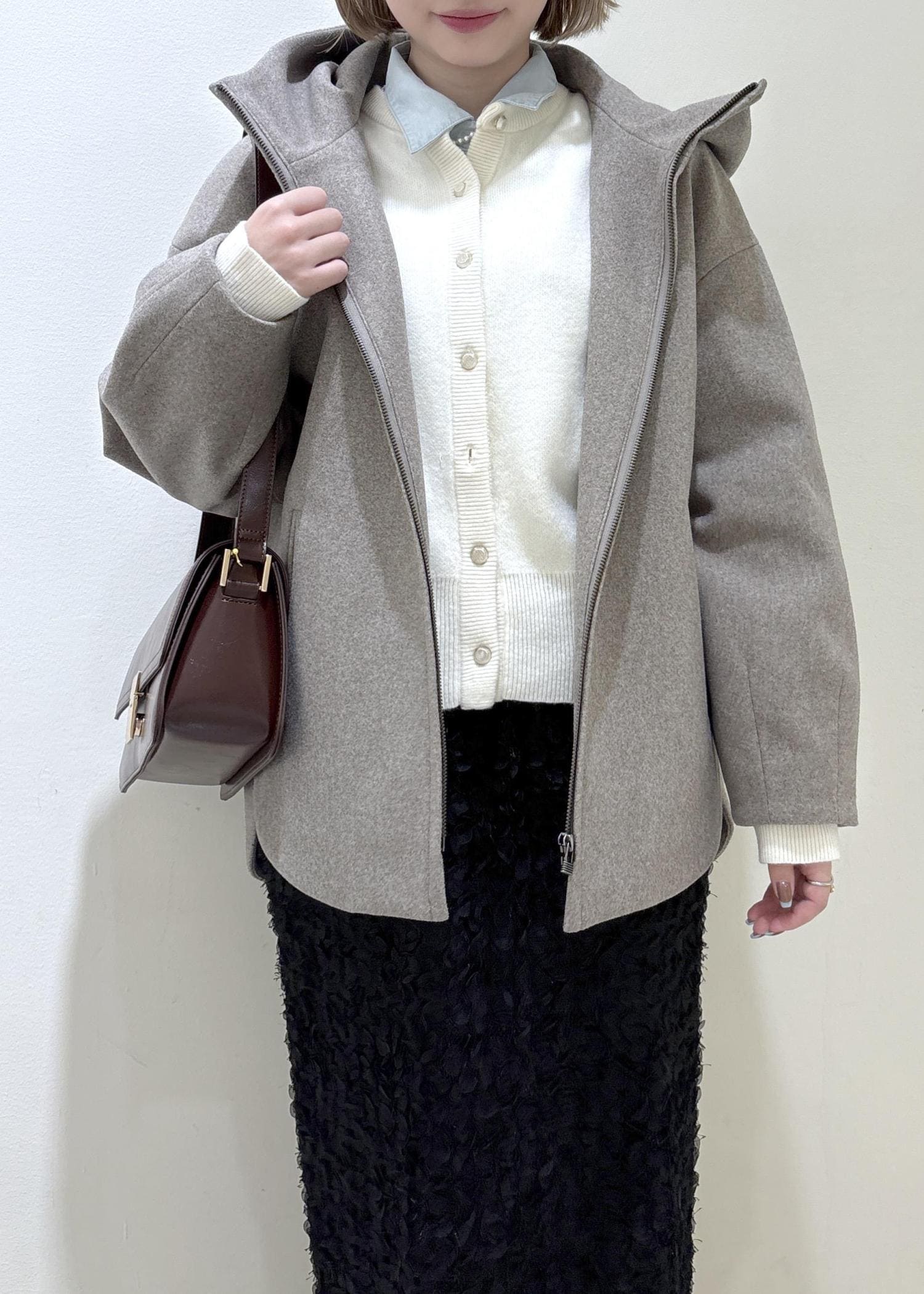 メルトンのアウターと、ウール混のカーディガンで暖かみのあるコーディネートにしました。