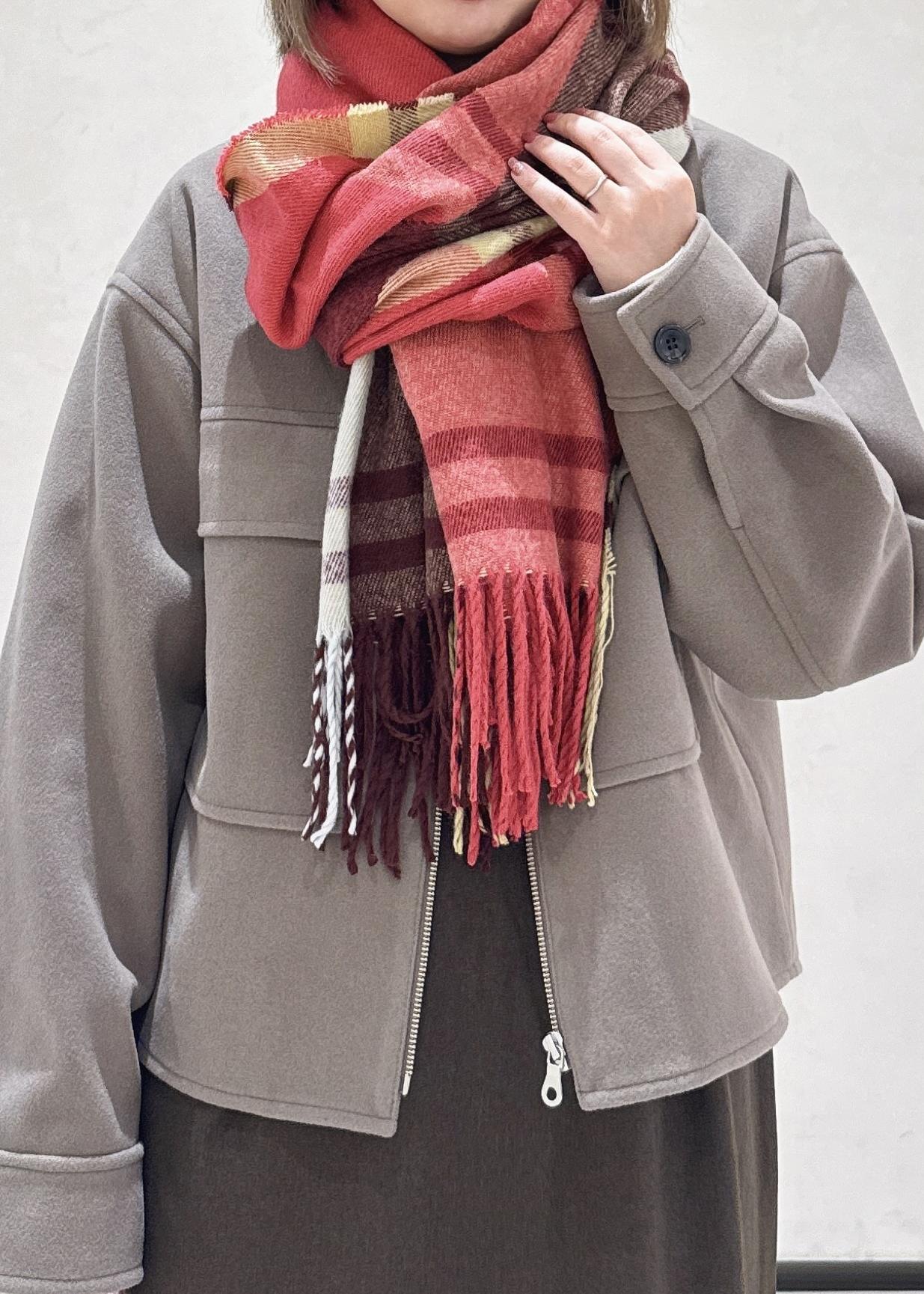 ブラウン系で合わせて、差し色で赤のチェックストールを合わせました。