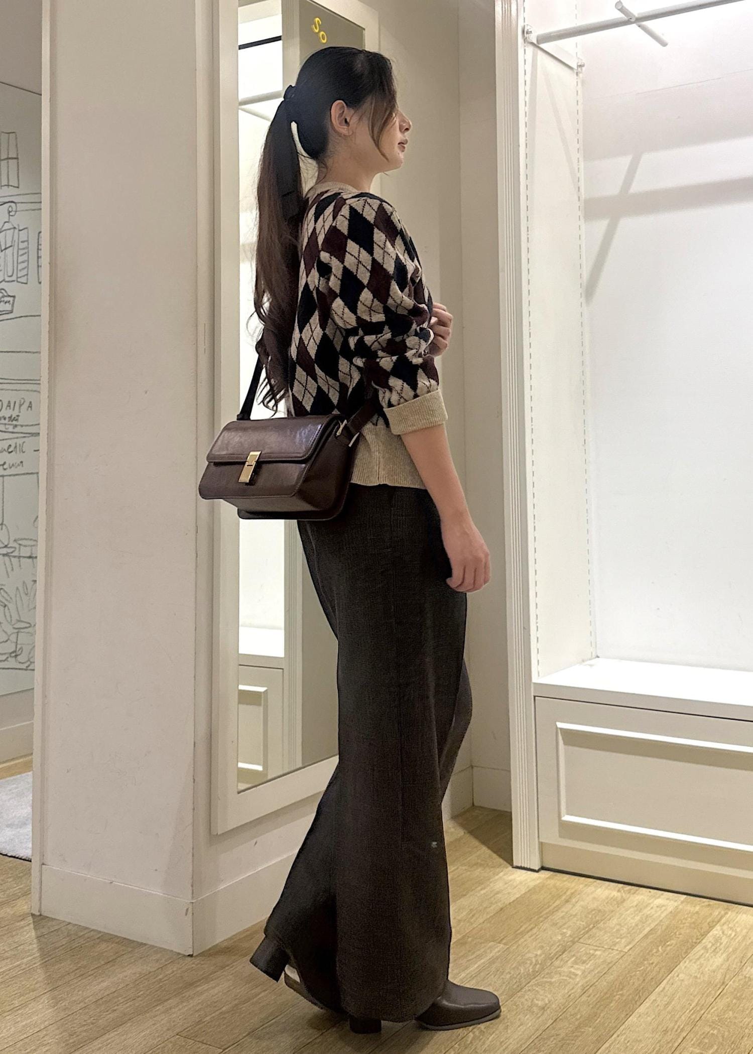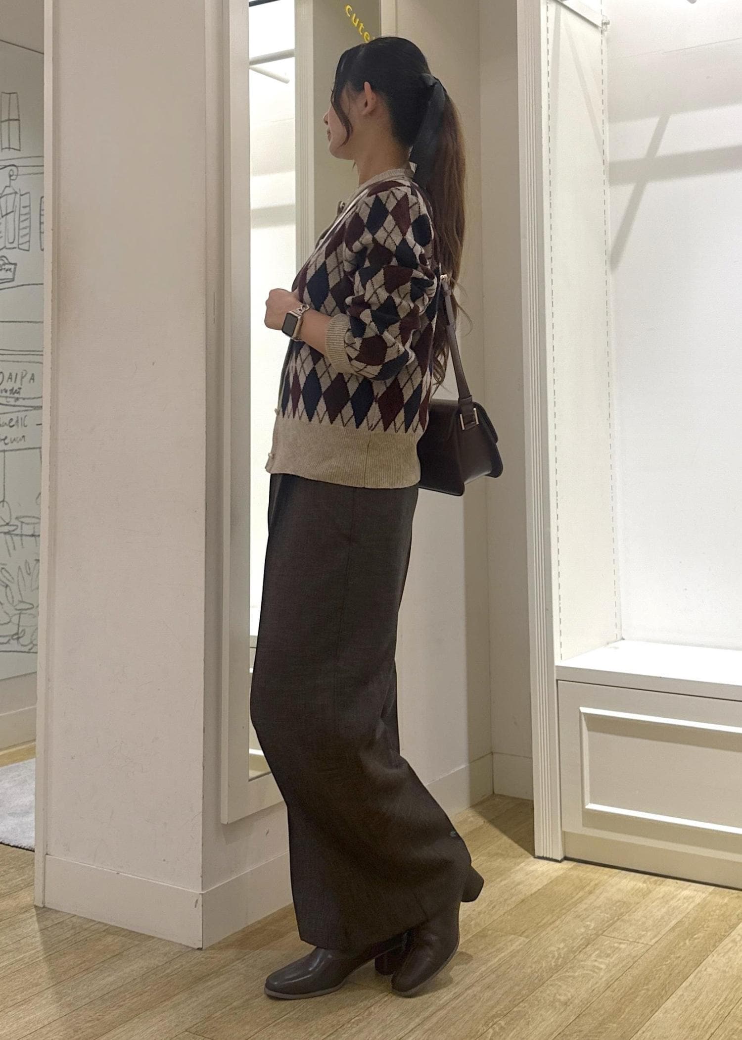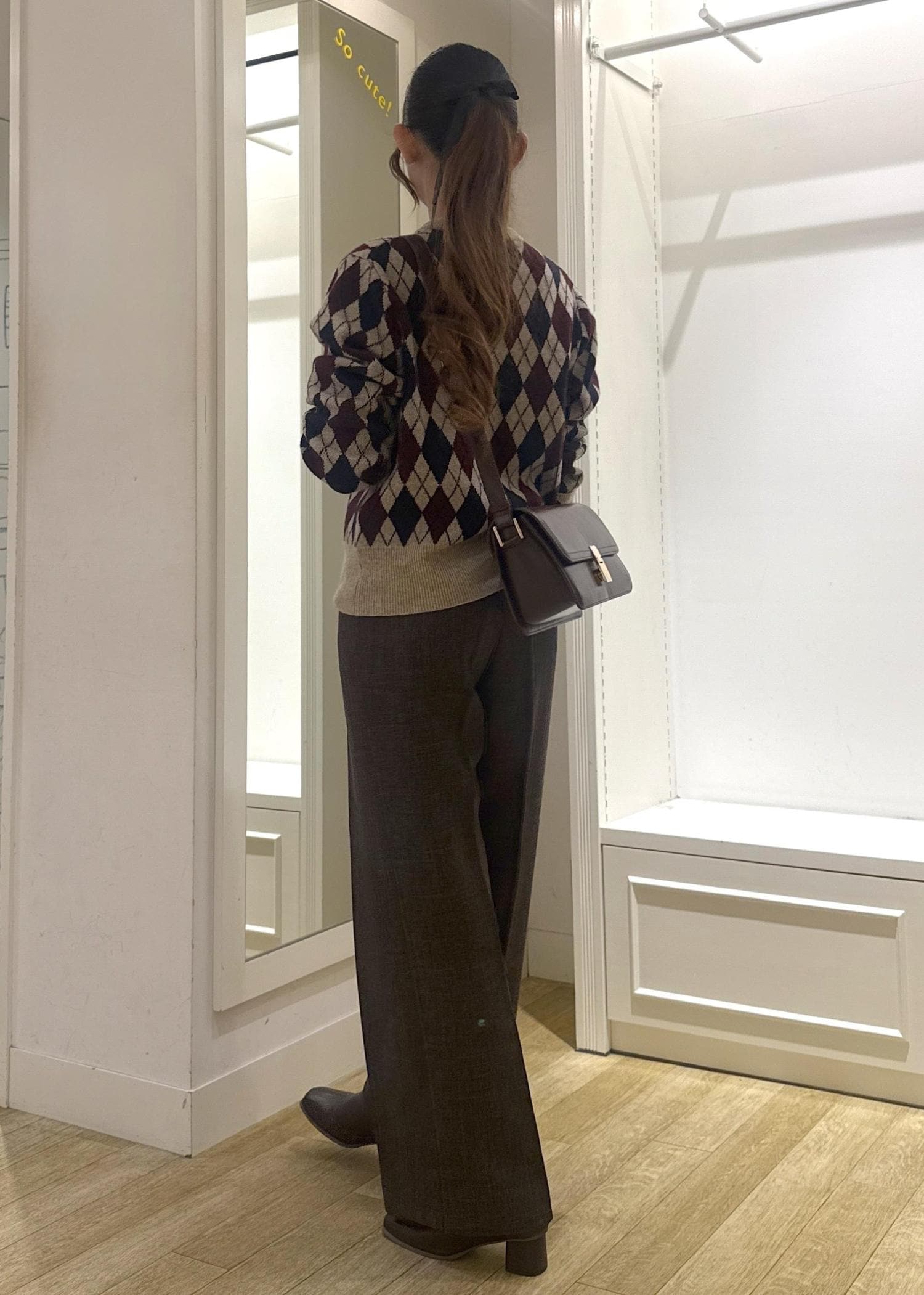 今回はアーガイル柄のカーディガンと、ブラウンのパンツやバッグを合わせることで、クラシカルな秋コーデを組んでみました。