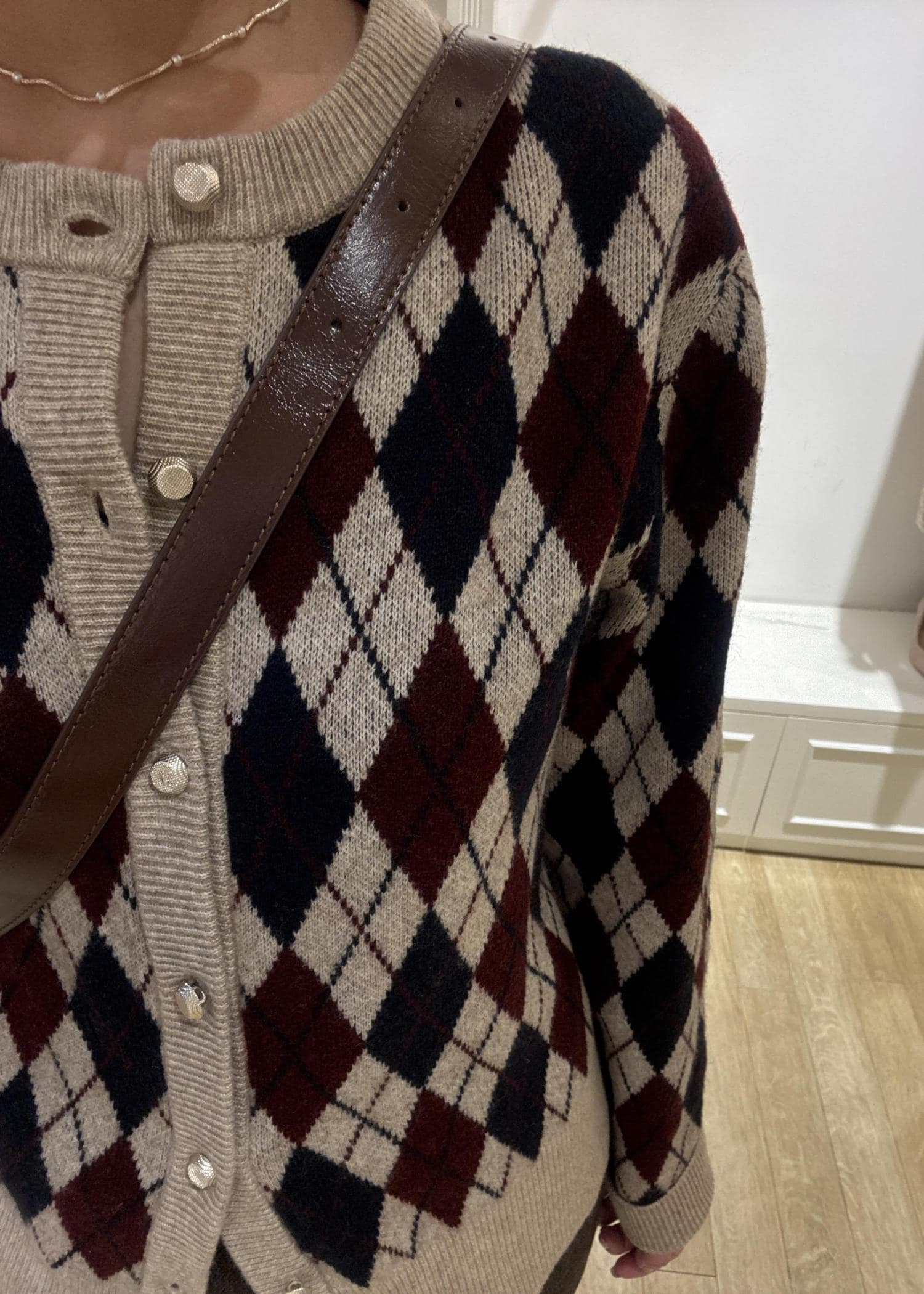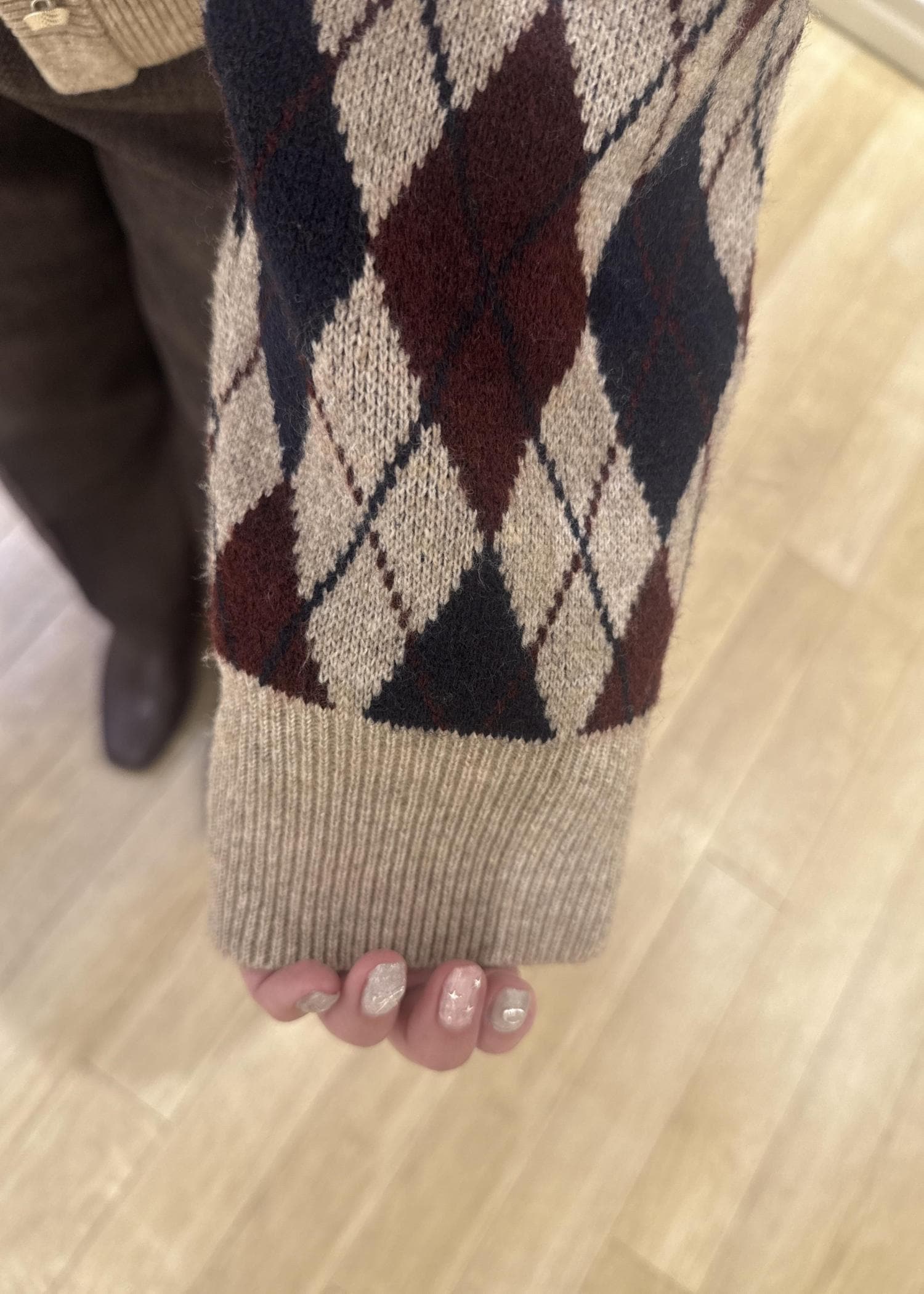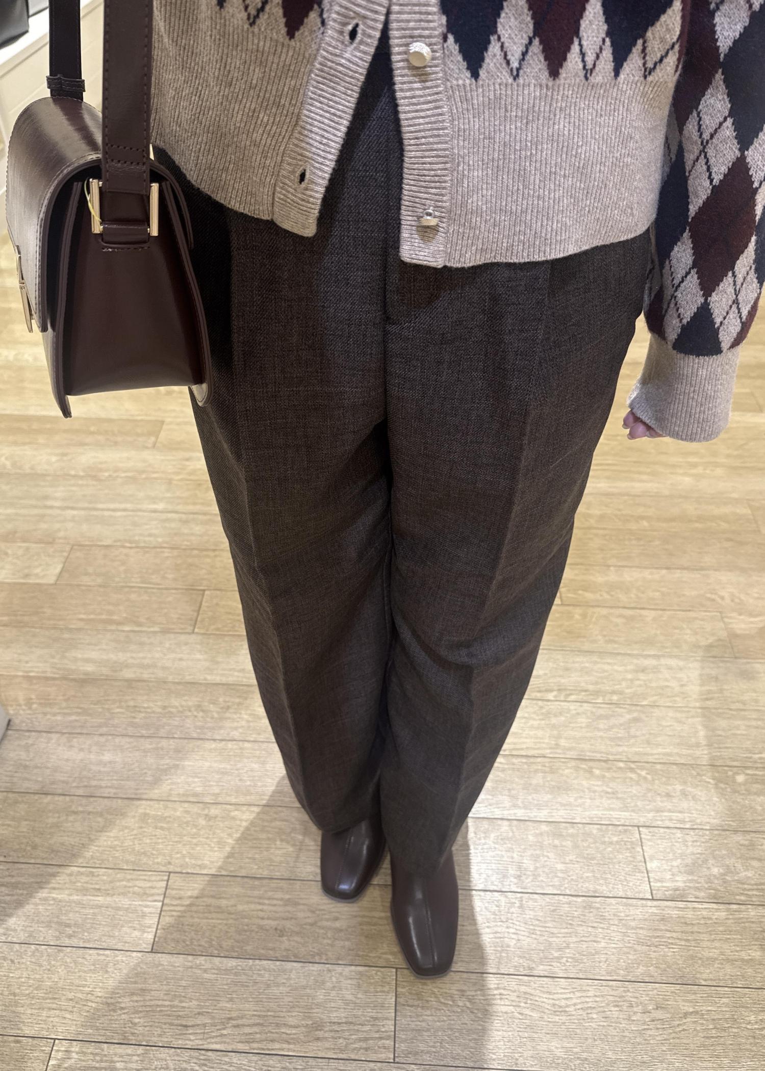 今回はアーガイル柄のカーディガンと、ブラウンのパンツやバッグを合わせることで、クラシカルな秋コーデを組んでみました。